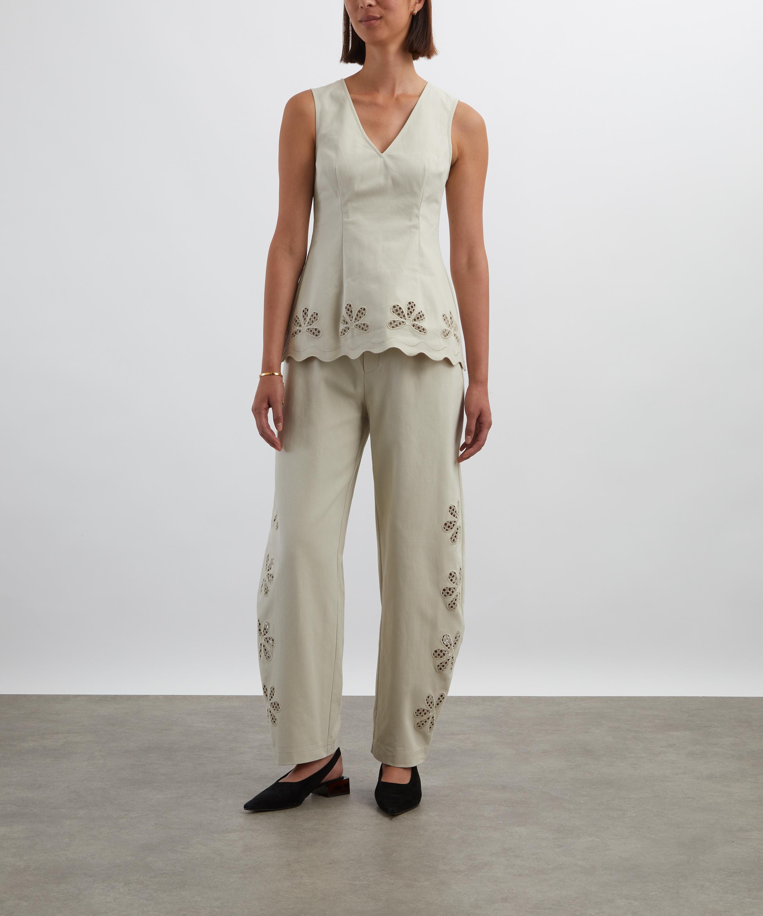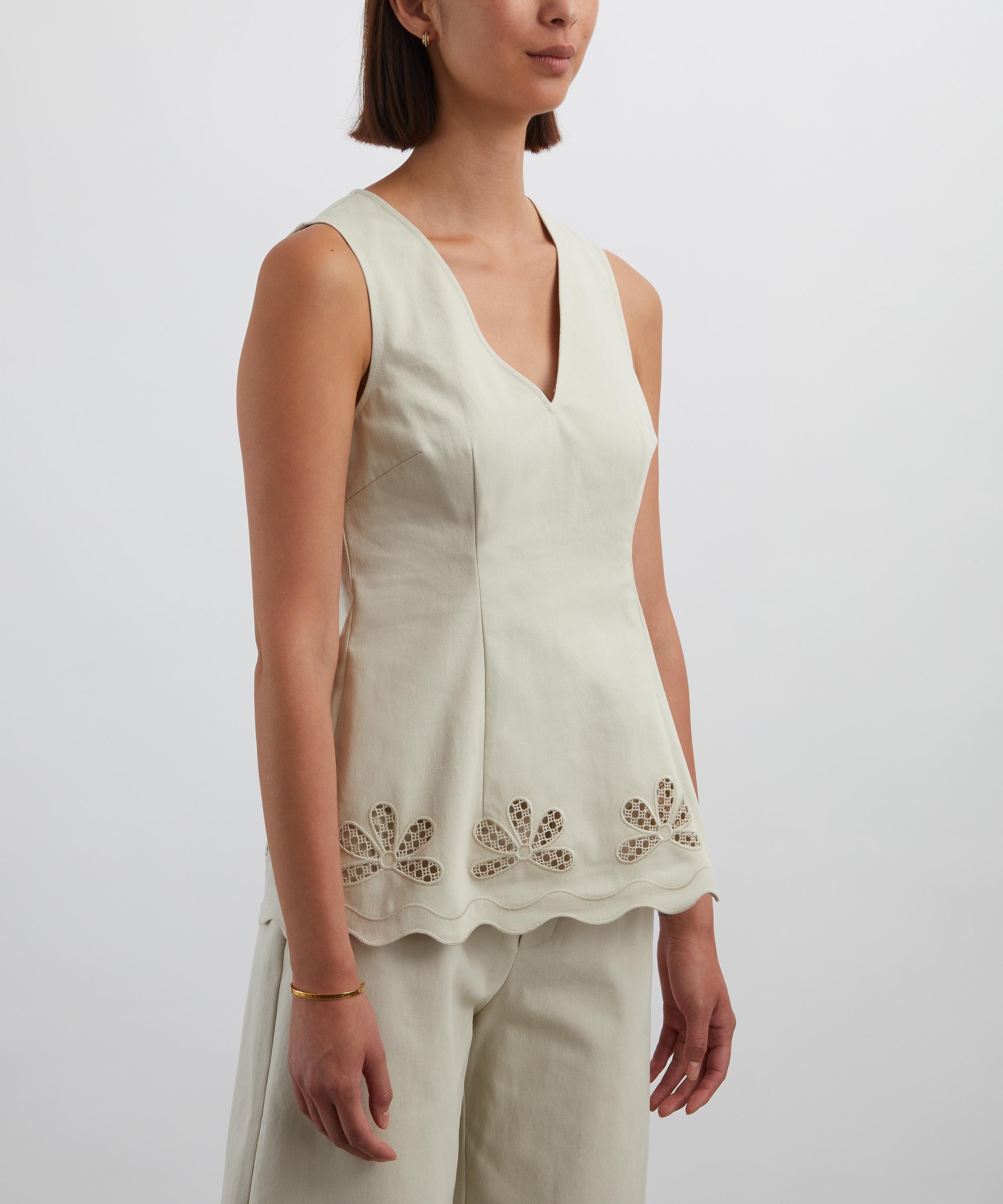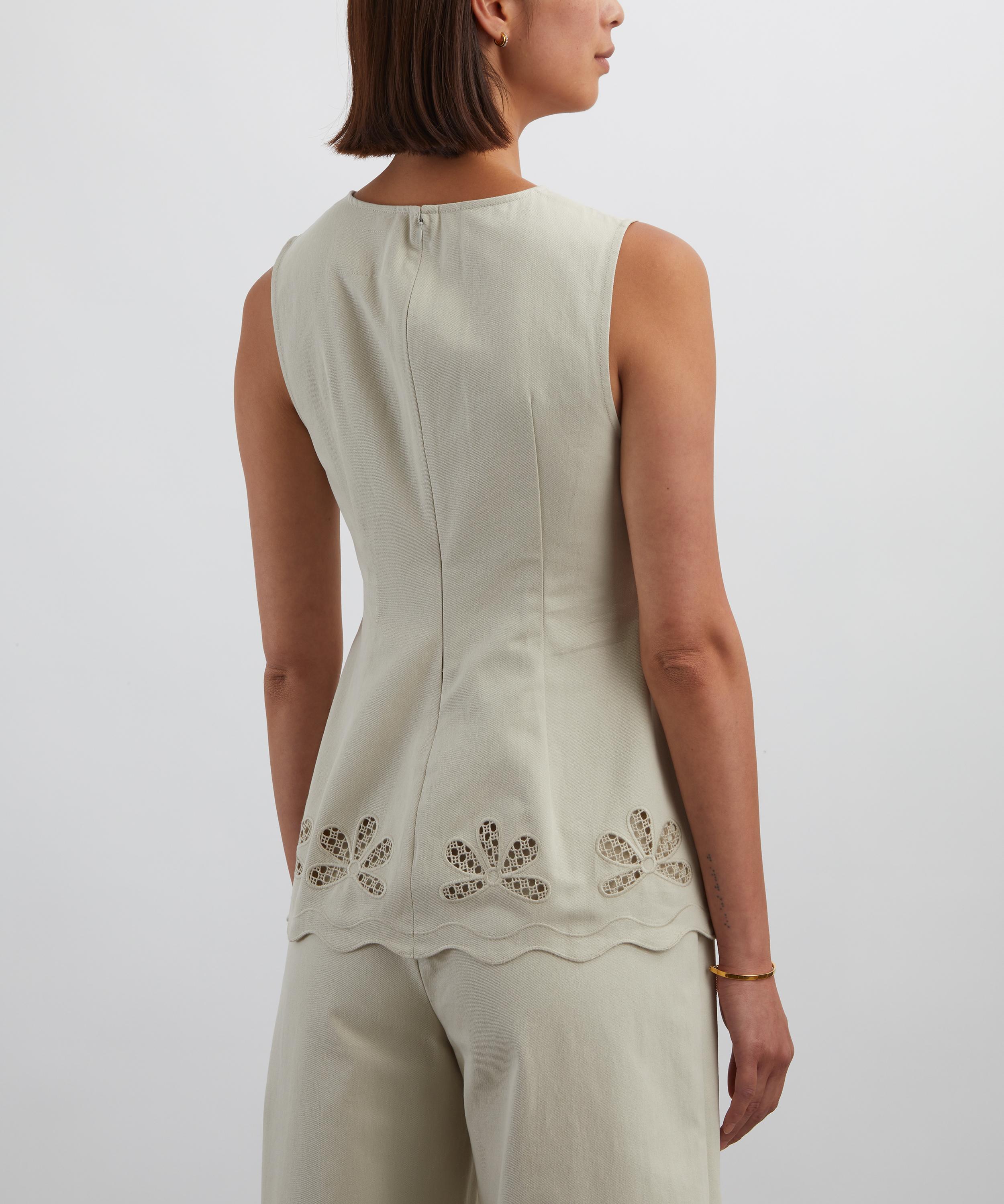The Gigi Top features a sculpted, sleeveless silhouette with a flattering V-neckline, shaped through bust and waist darts for a clean, tailored fit. Crafted cotton, it’s finished with scalloped edges, bespoke floral cutwork embroidery, and delicate honeycomb stitching.
