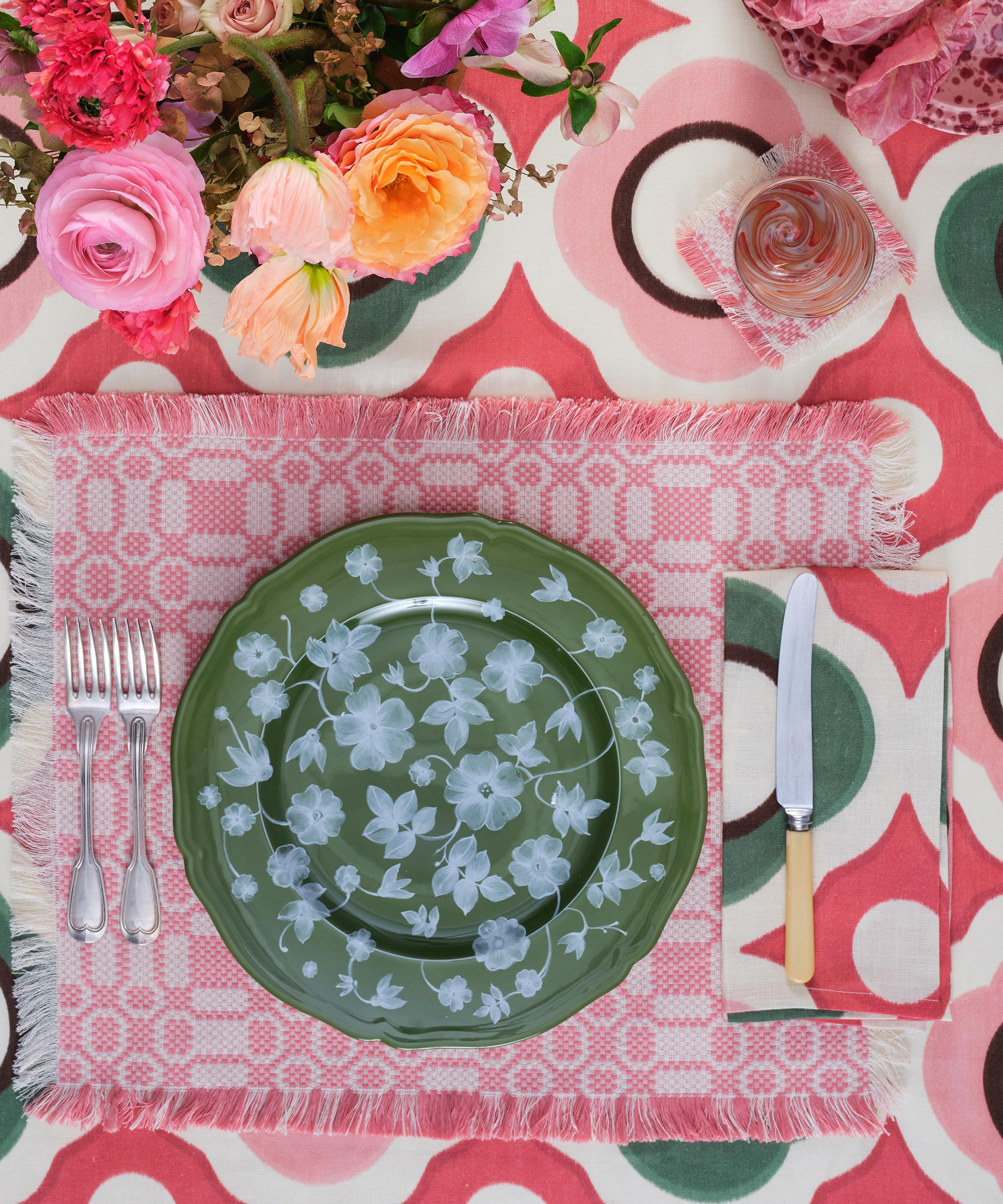 Handcrafted in Italy with a unique finish inspired by the soft transparency of watercolour paints, this charger plate features a sage green background contrasted with white floral motifs. An elegant and versatile tabletop addition, pair with Cabana’s floral printed table linen for an eclectic dining set up.