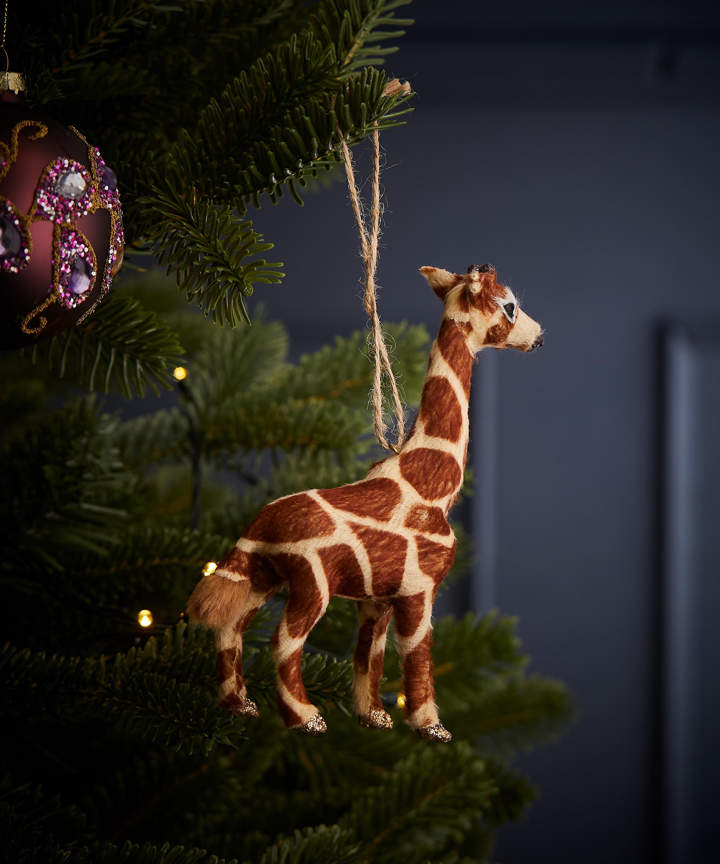 Radiating whimsical wonder, add the faux fur giraffe ornament to your Christmas tree for a unique approach to seasonal décor.