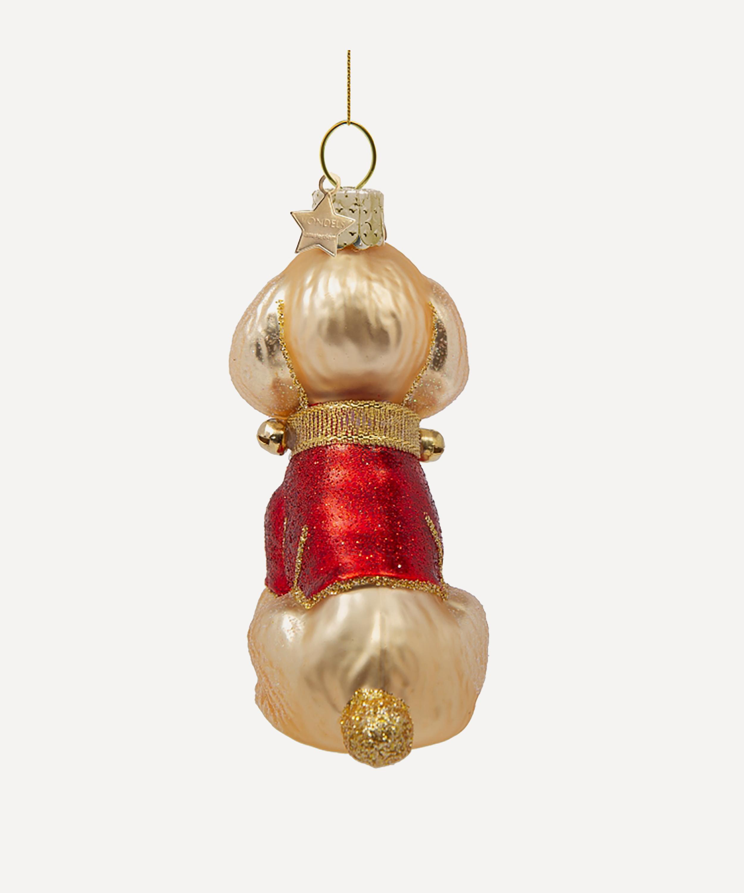 A charming addition to any bauble collection, this sparkly hand-painted poodle ornament is complete with a festive red t-shirt and a collar adorned with jingle bells.
