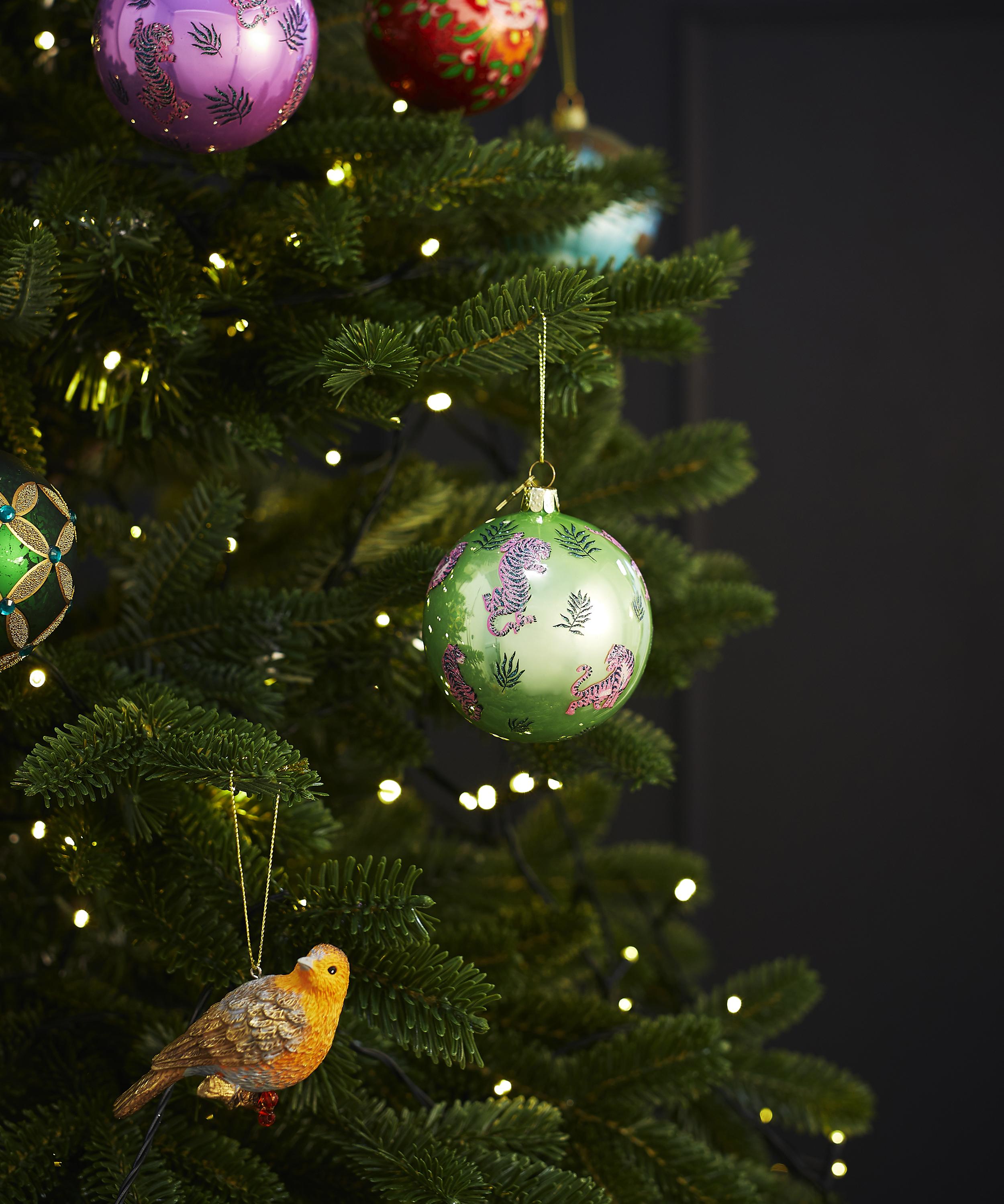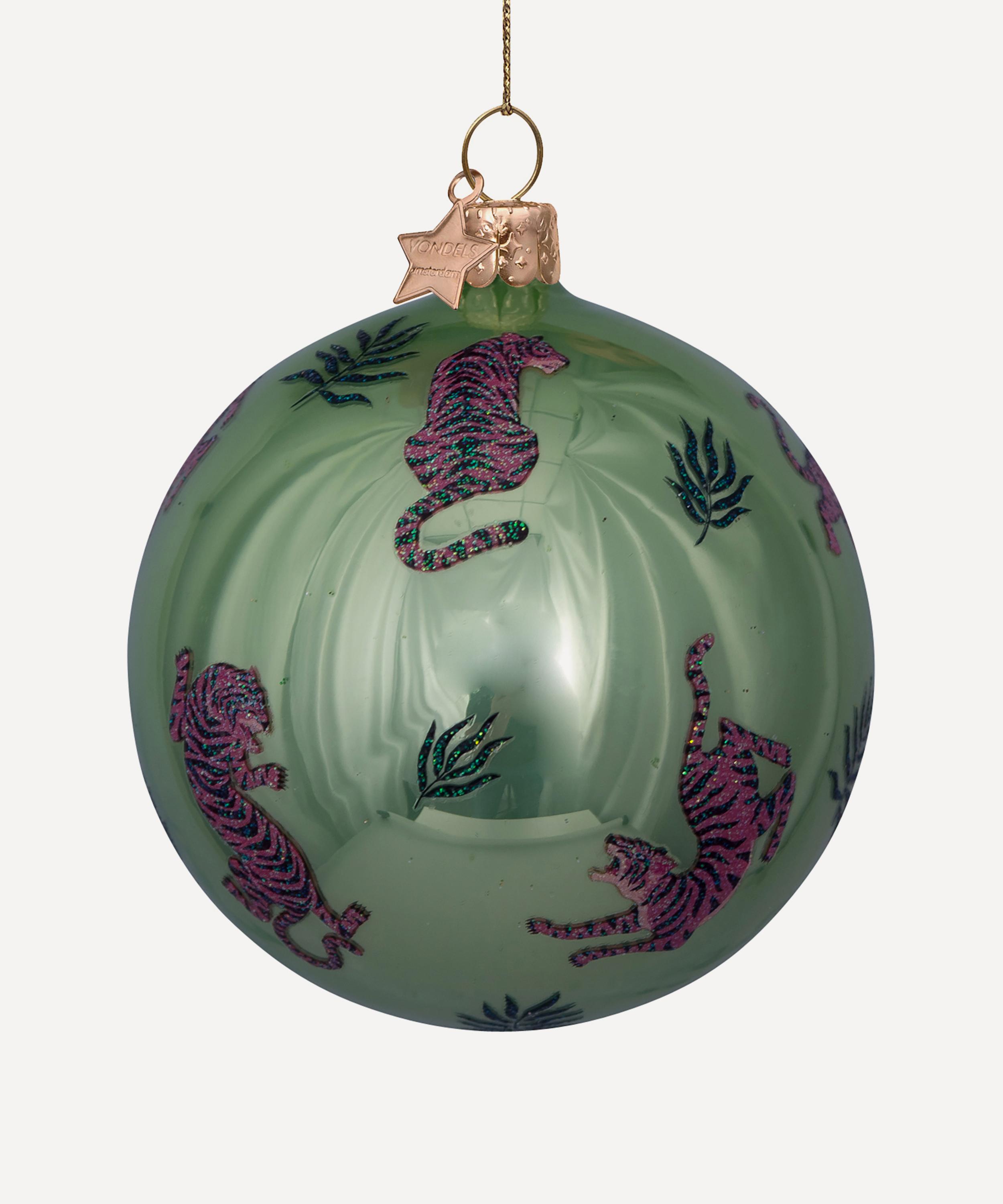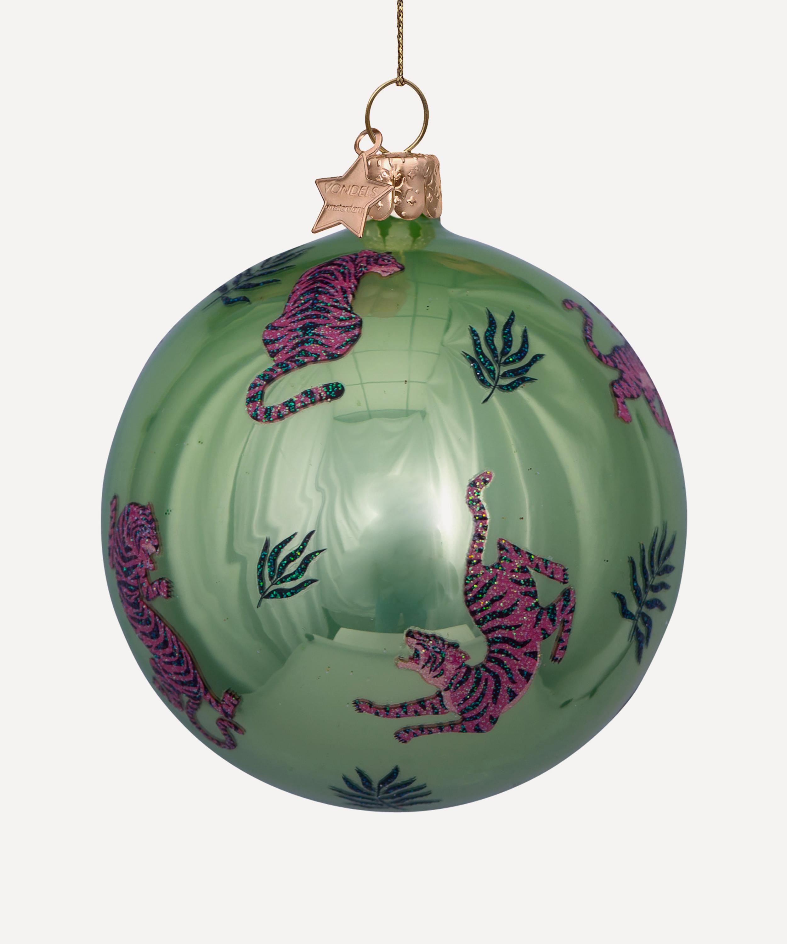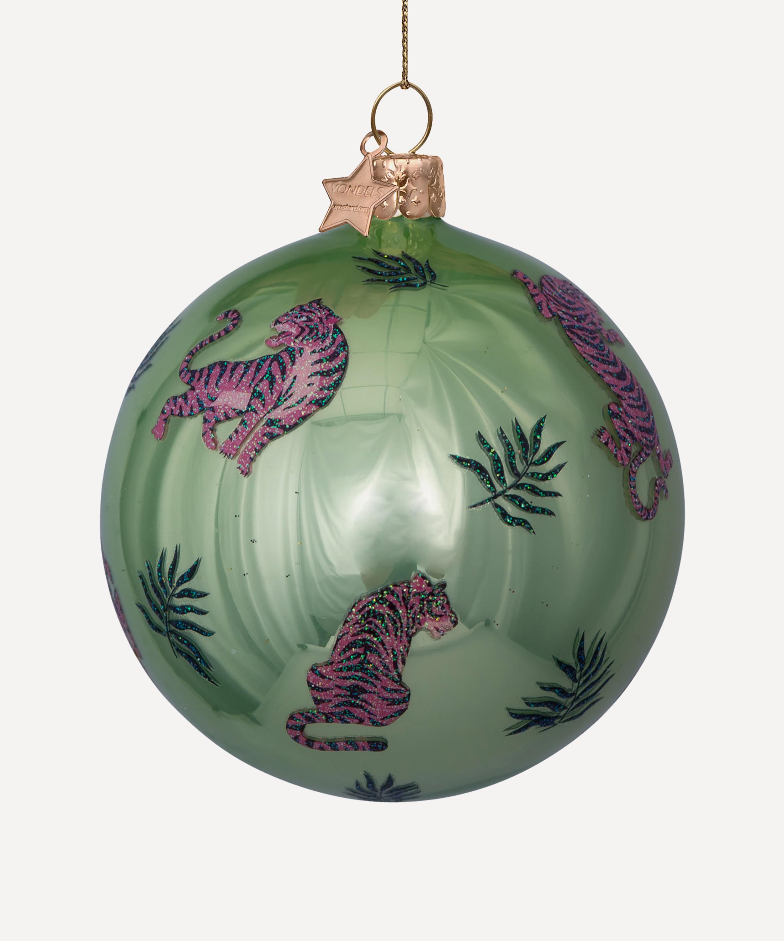 Designed in a classic spherical form, this beautiful, high-shine bauble is hand-painted with majestic tigers and palms with fine glitter detailing. An eye-catching ornament to adorn your tree with year after year.