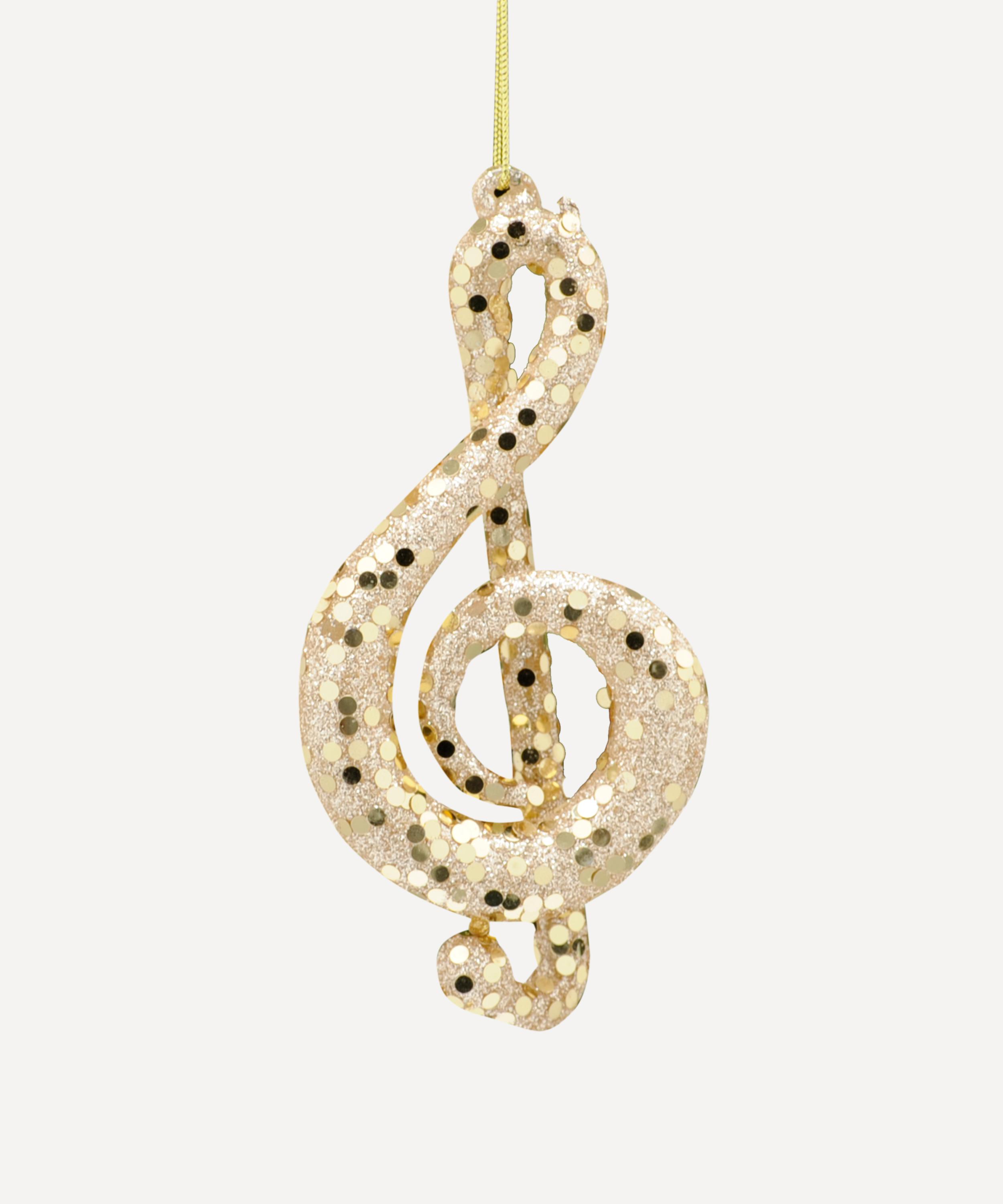 Add a flutter of magic to your evergreen pine this season with the Glitter Music Note ornament, exuding whimsical charm with a touch of opulence through its glittering gold details.