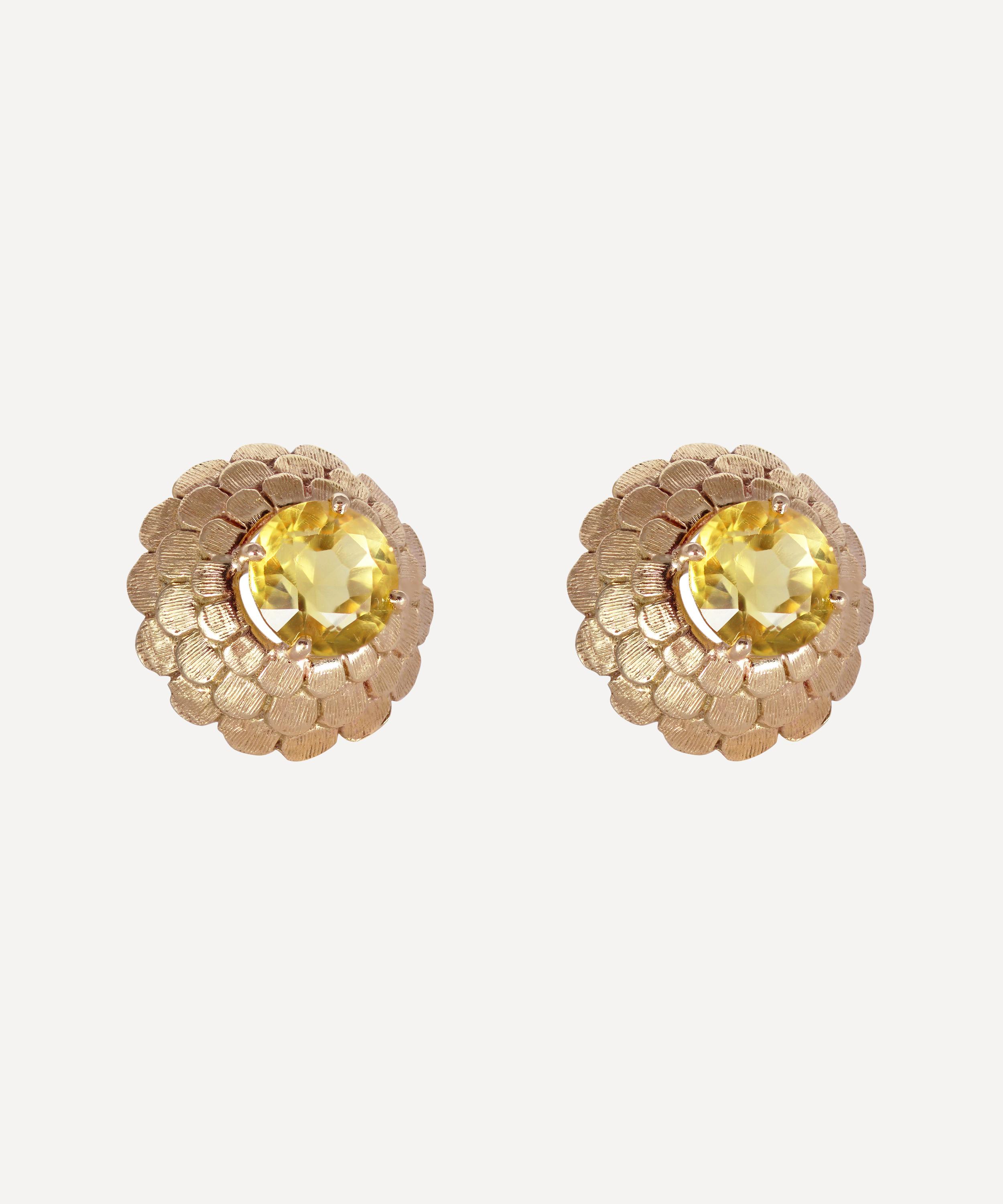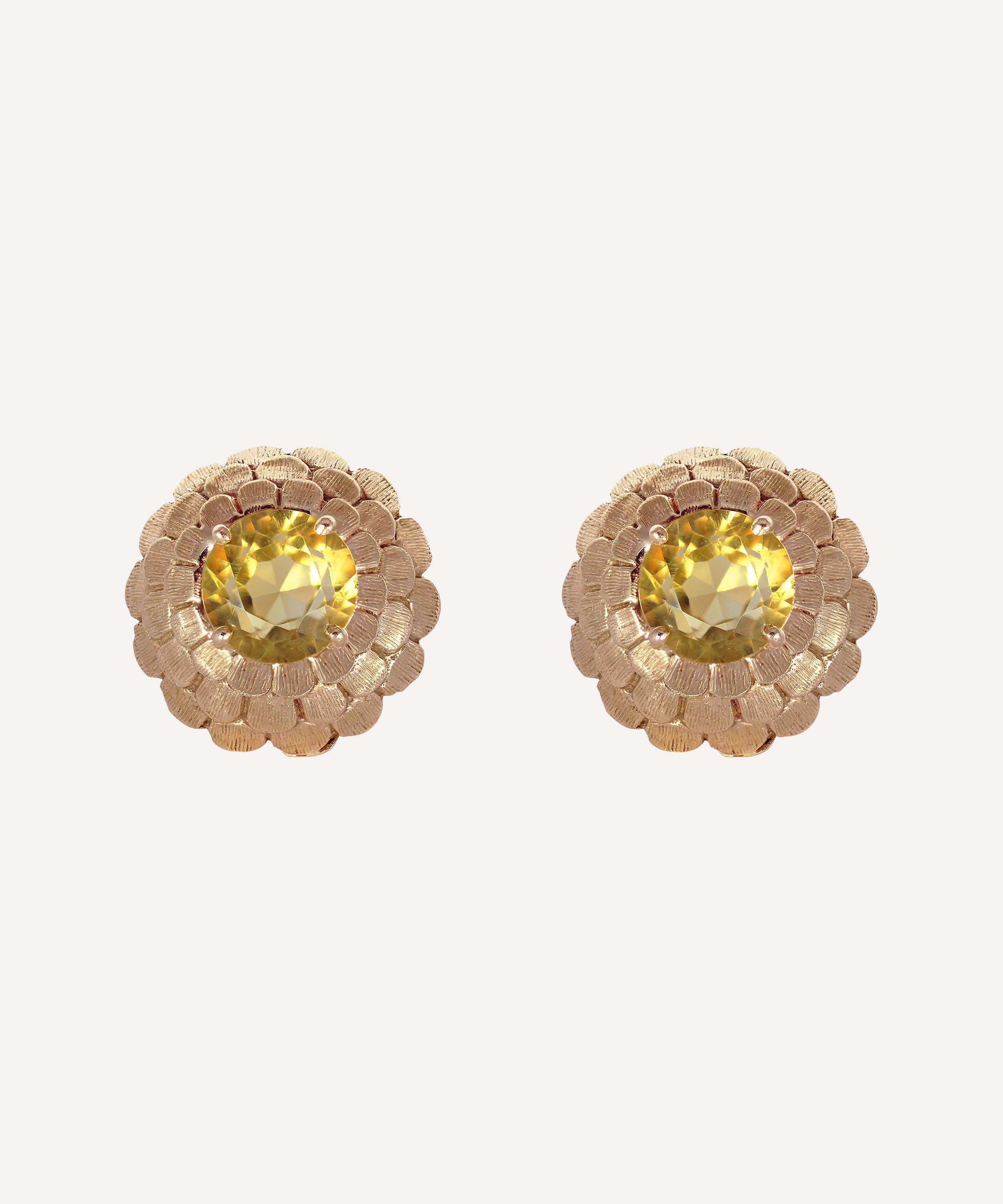 Crafted from solid 14 carat gold, each of these clip-on earrings features a domed floral silhouette with three rows of intricately textured, layered petals and a single round cut citrine in a classic prong setting at the centre. An elegant example of timeless vintage jewellery, try pairing them with a coordinating gemstone pendant or an array of single diamond studs for an unforgettable evening look.