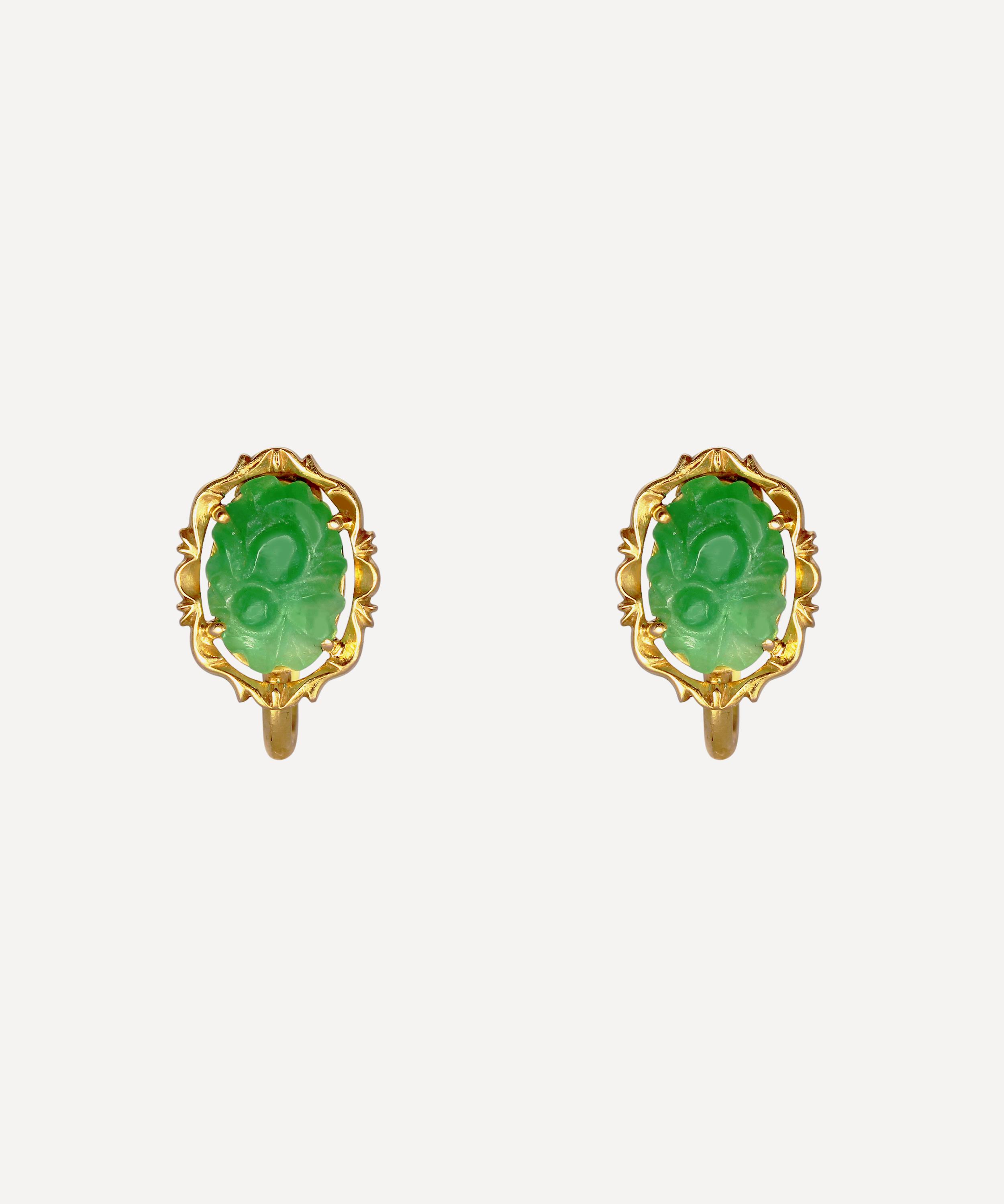 Crafted from solid 14 carat gold, each of these earrings features an oval-shaped, carved jade plaque, presented in a classic claw setting with a swirling decorative border. An elegant example of timeless vintage jewellery, try pairing them with a coordinating pendant necklace or an array of single gemstone studs for a show-stopping evening look.