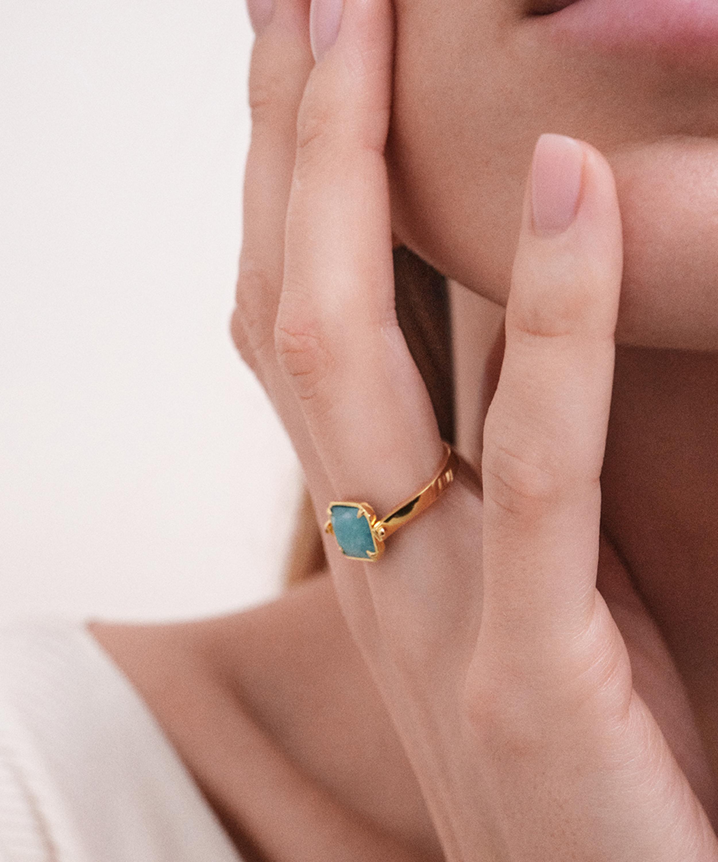 Exemplifying the geometric shapes that characterises the Deco collection, this ring features a spinner focal composed of amazonite and mother of pearl on opposite sides. Finished with a sleek gold band, try styling it with several other rings from the brand’s extensive collections for a bold stack.