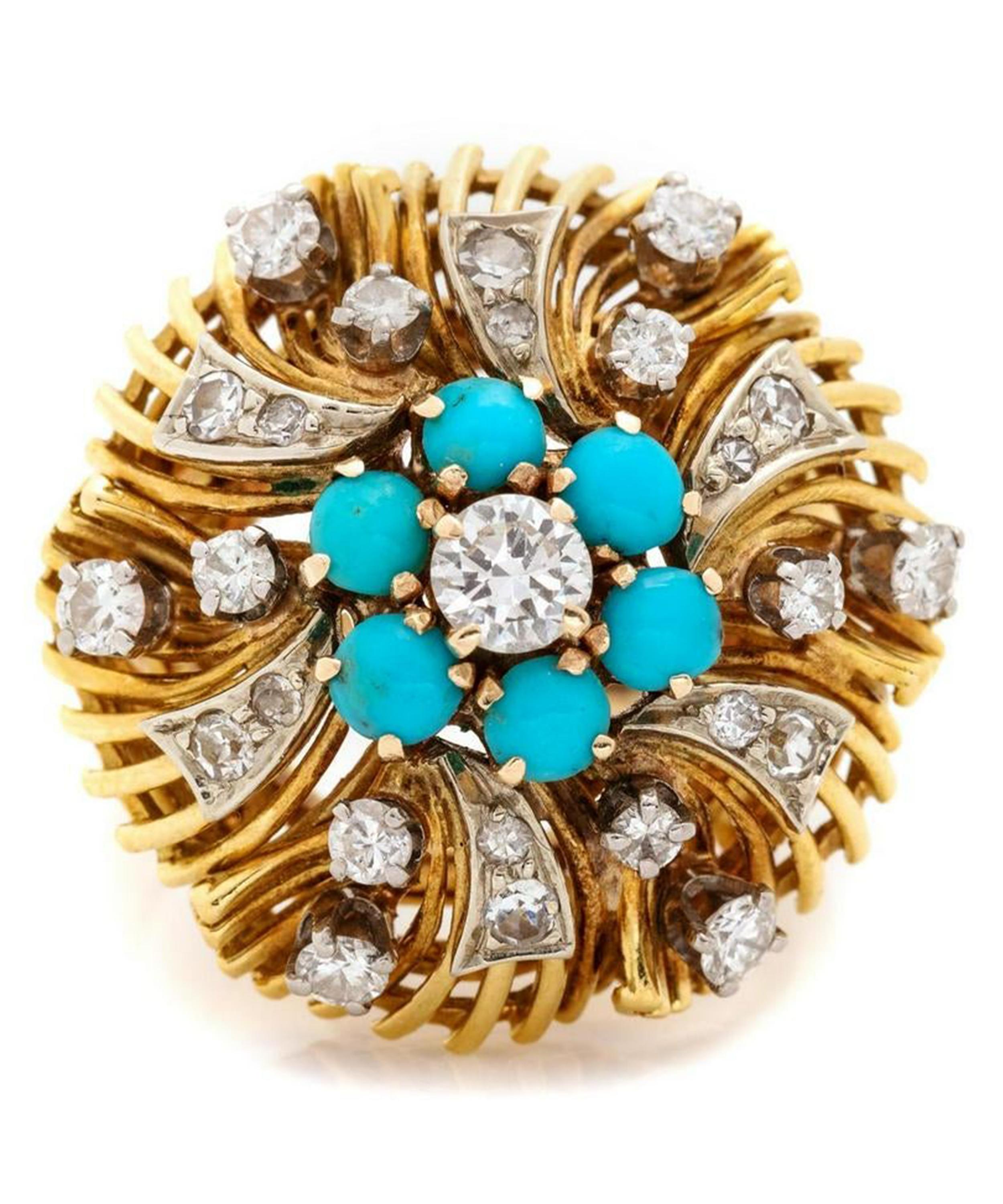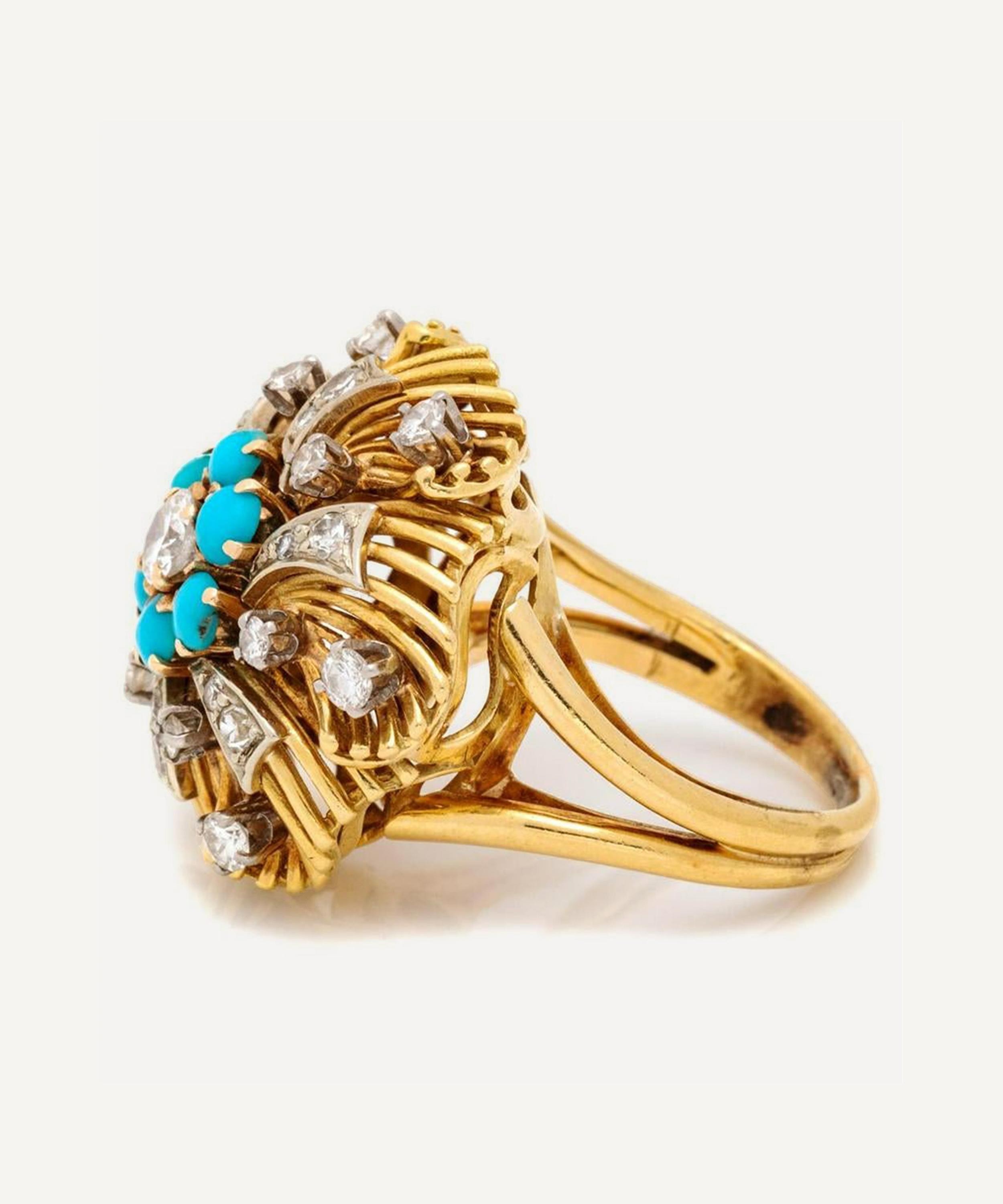 Crafted from polished 18 carat gold, this ring features a striking, floral-inspired design. A round, brilliant cut white diamond and six turquoise stones form a small floral cluster at the centre, while a decorative spray of twisted gold coils and additional scattered diamonds radiates out around the edge. An elegant example of classic vintage jewellery, wear this piece alone to showcase its unique brilliance, or incorporate it into a maximalist curation of bejewelled gold bands for a custom, contemporary approach.
