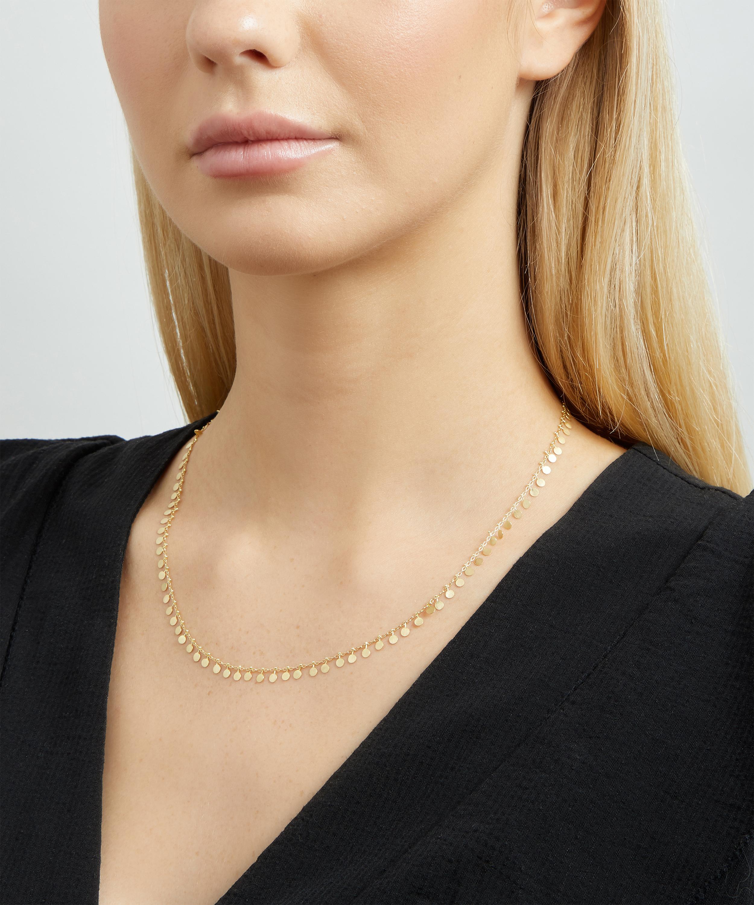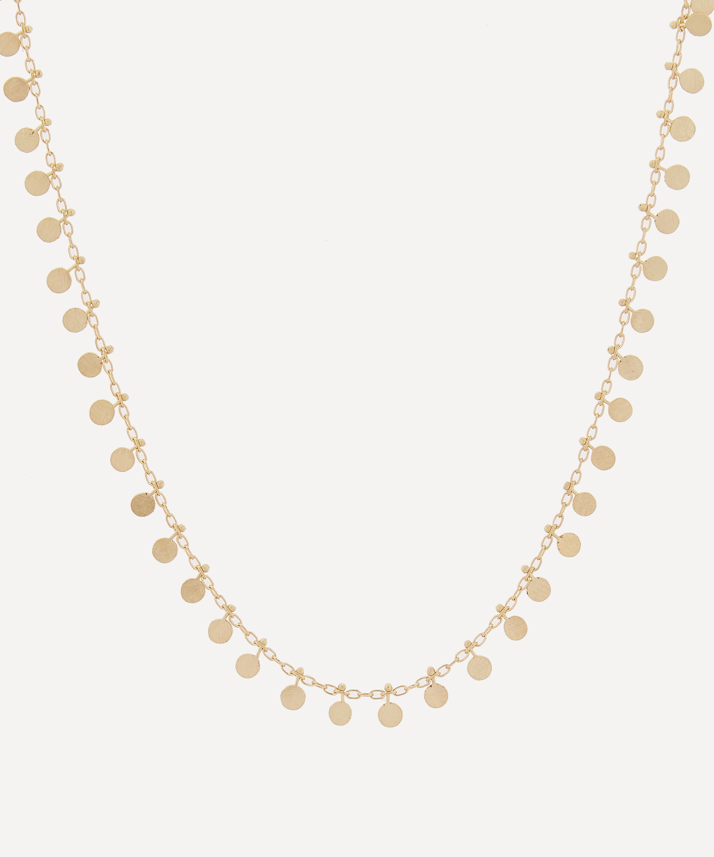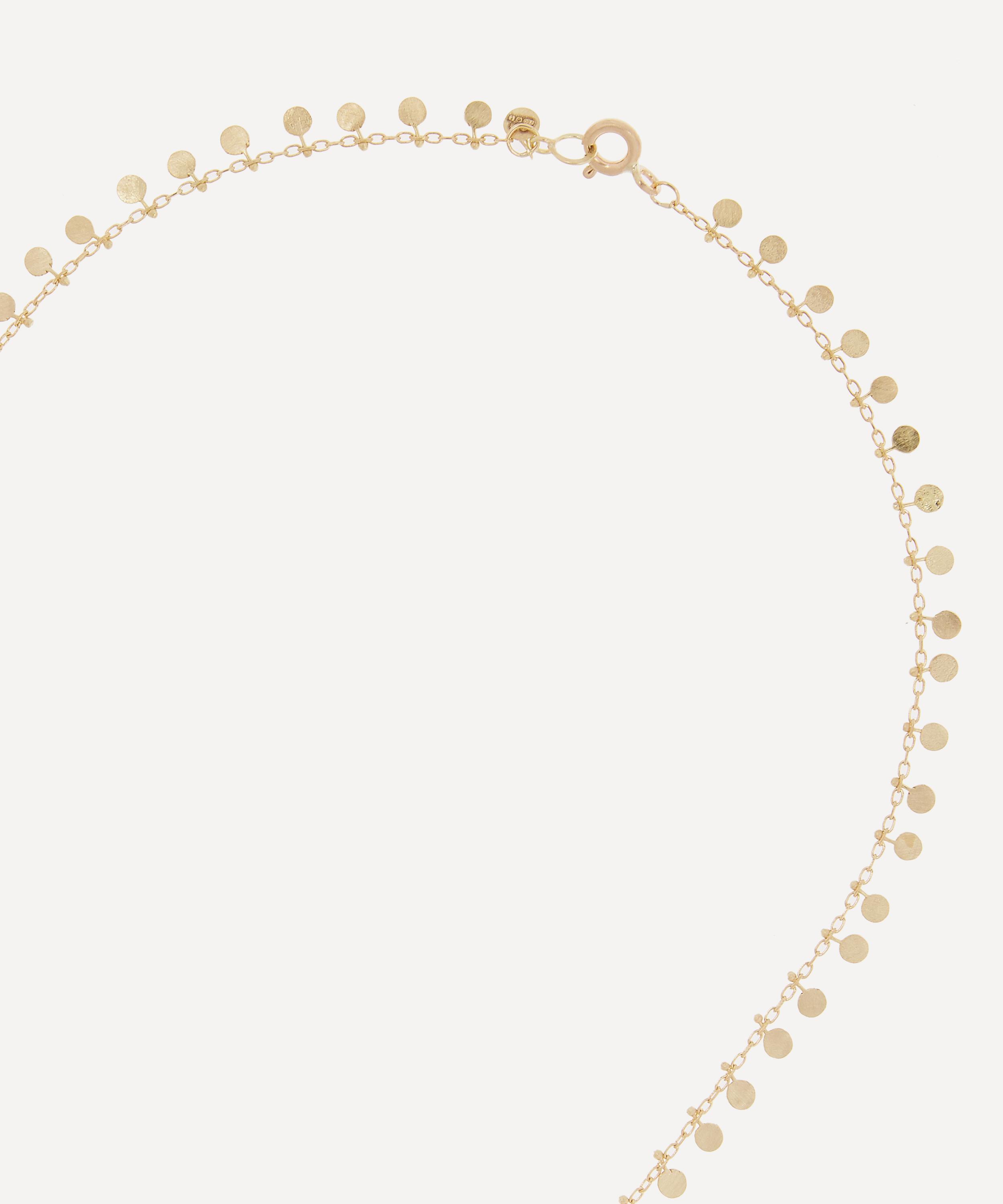 A slightly more regimented addition to the designer's signature dot collection, this Sia Taylor necklace is beautifully graceful, a flawless string of tiny dots adorning a mid-length petite chain for effortless wear. Designed to be styled in multiple tiers of varying lengths alongside more rustic designs from the collection, this rich 18 carat gold piece is also destined to be worn solo atop a loosely buttoned silk shirt.