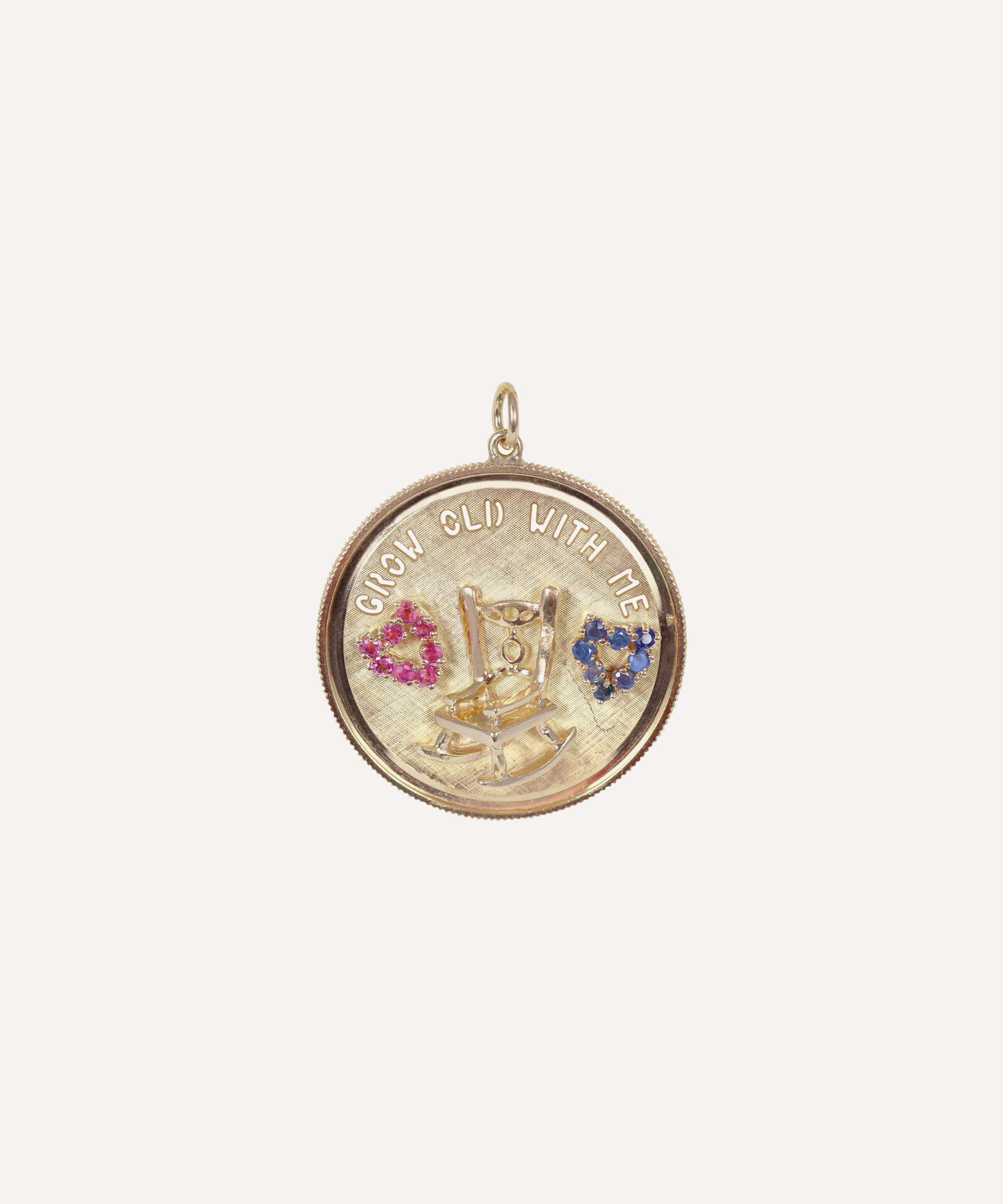 Crafted from solid 14 carat gold, this charm showcases a large brushed gold medallion with a polished rocking chair relief and two heart-shaped clusters of round cut rubies and blue sapphires. The perfect gift for your most cherished loved one, it's finished with raised 'Grow Old With Me' lettering on the front and a hidden message on the back that reads 'The Best is Yet to Be'. Style it solo on a simple chain necklace for a sentimental addition to your everyday jewellery line-up.