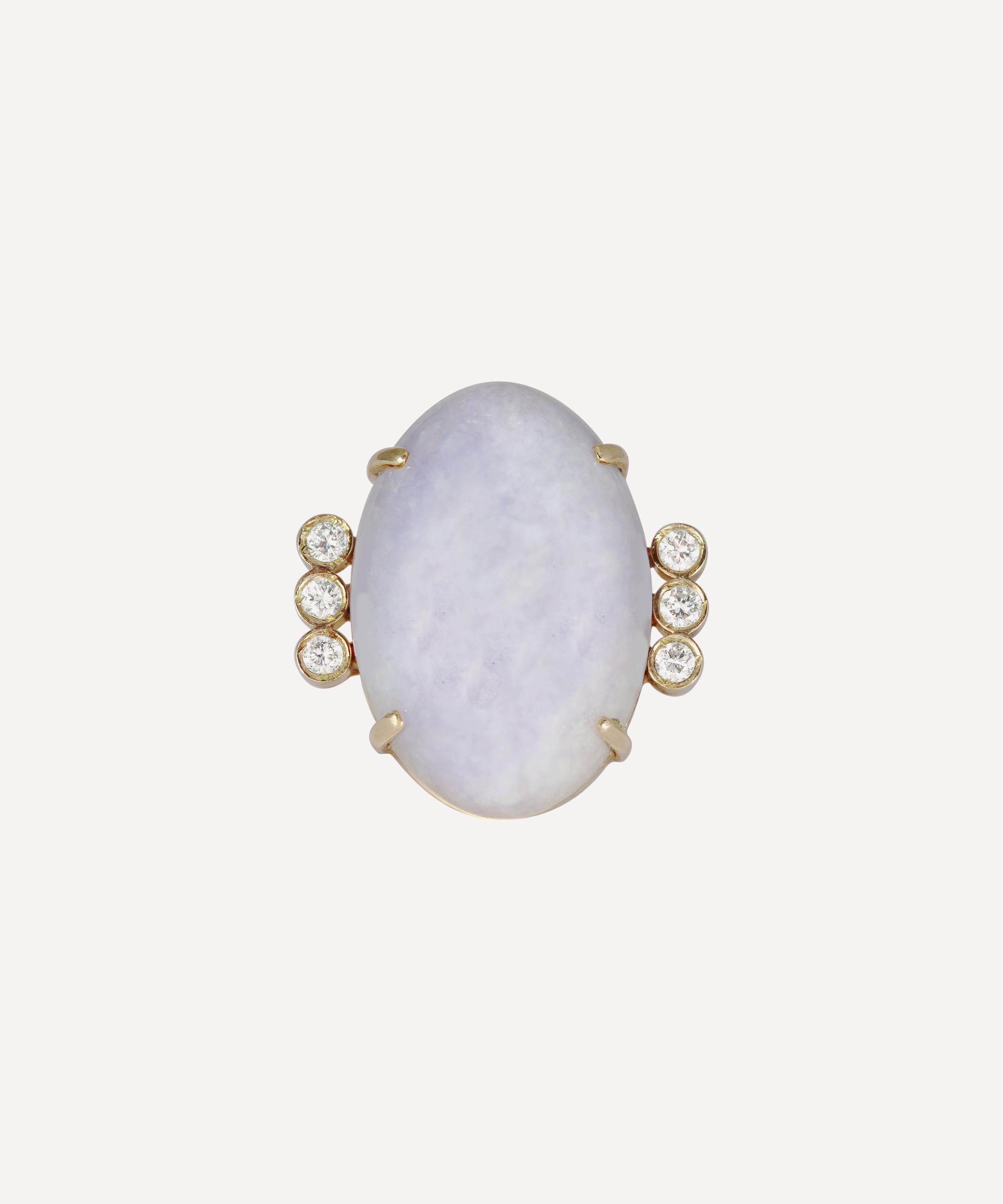 Crafted from solid 14 carat gold, this ring features a large, oval cut lavender jade cabochon in a minimal claw setting on an elevated gallery, with a trio of round, brilliant cut white diamonds lining each side. An elegant example of timeless vintage jewellery, wear this piece alone to showcase its unique brilliance, or incorporate it into a maximalist curation of dazzling gemstone cocktail rings for an unforgettable evening look.