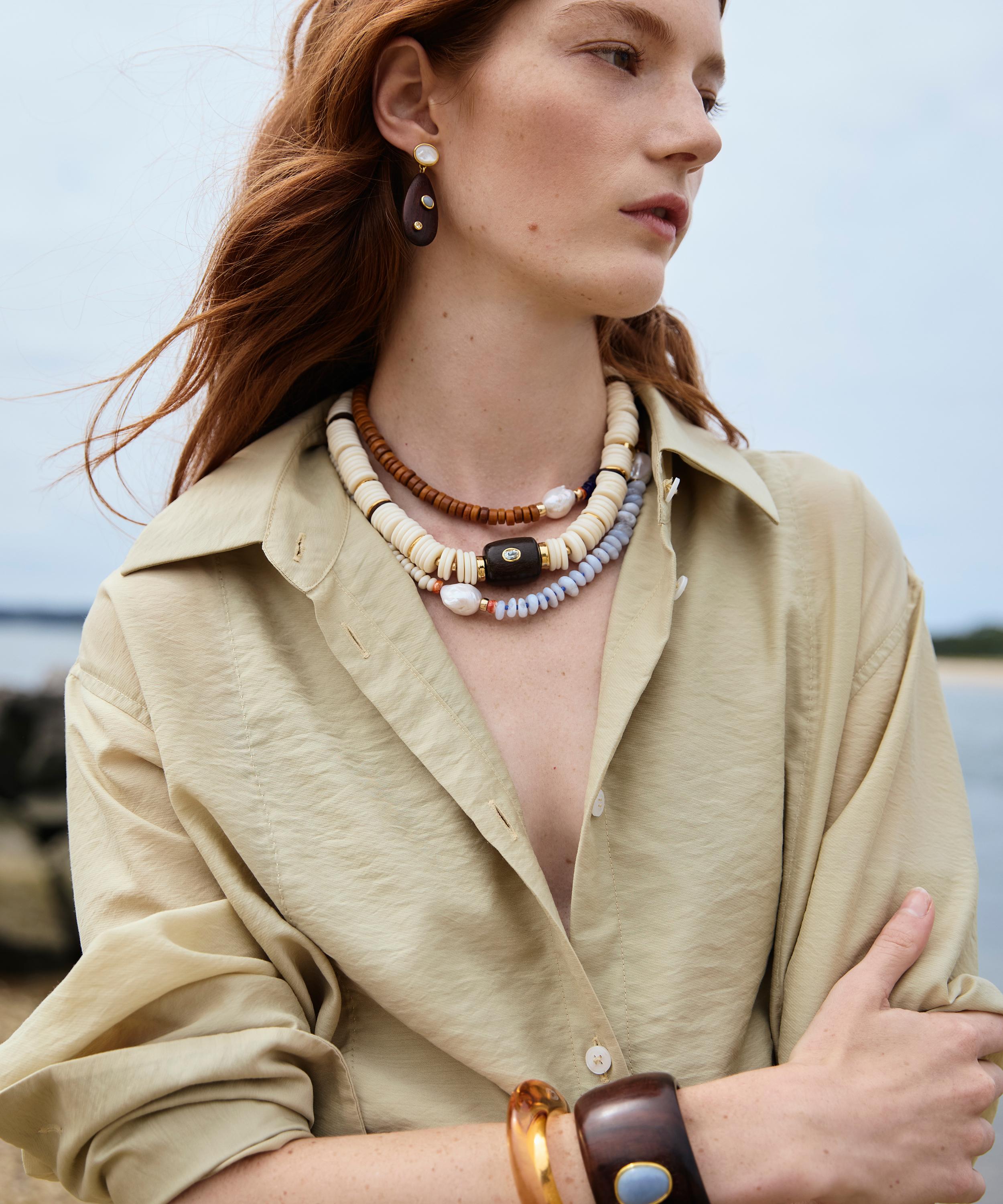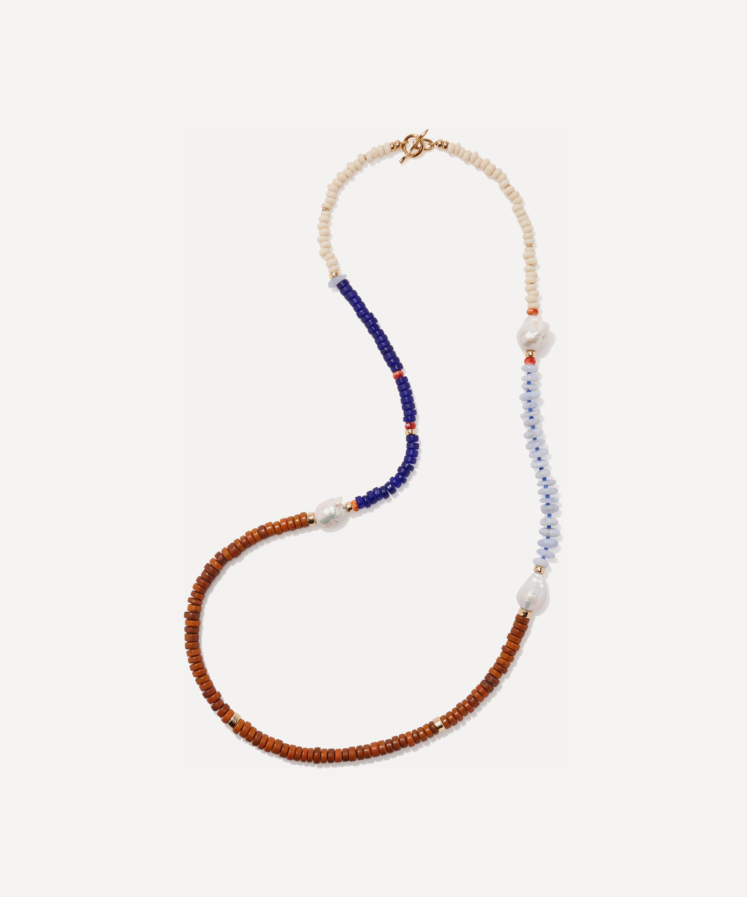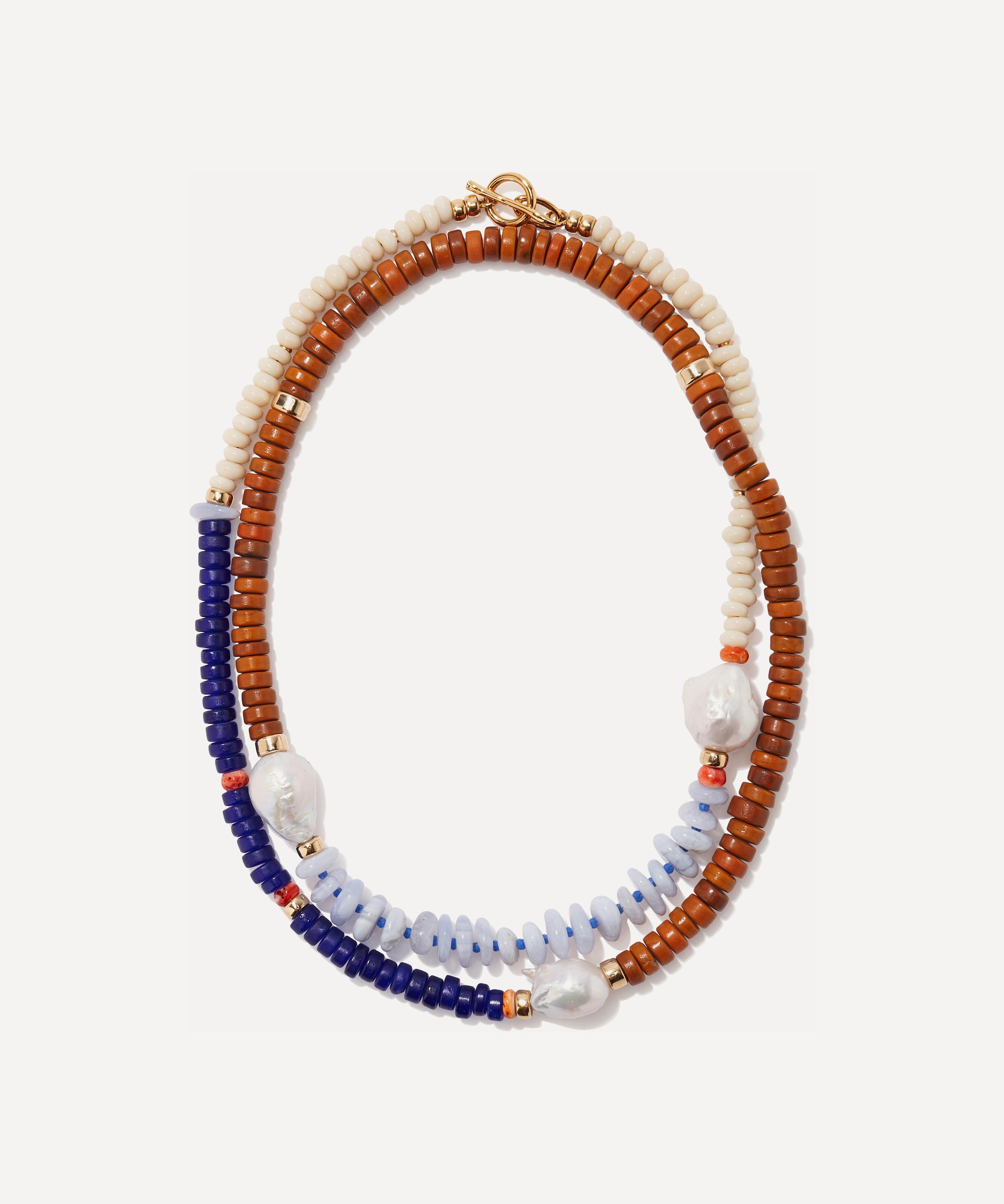 Express your personal style and make a distinctive statement with Lizzie Fortunato’s attention-grabbing Cabana bead necklace. This vibrant piece features a colour-blocked design, composed of cream, cobalt and terra cotta-coloured glass beads, interspersed with blue lace agate, oyster shell accents and freshwater pearl. Offering plenty of statement appeal on its own, it can be stacked with chunky chains, pendants and other beaded necklaces for a layered look.