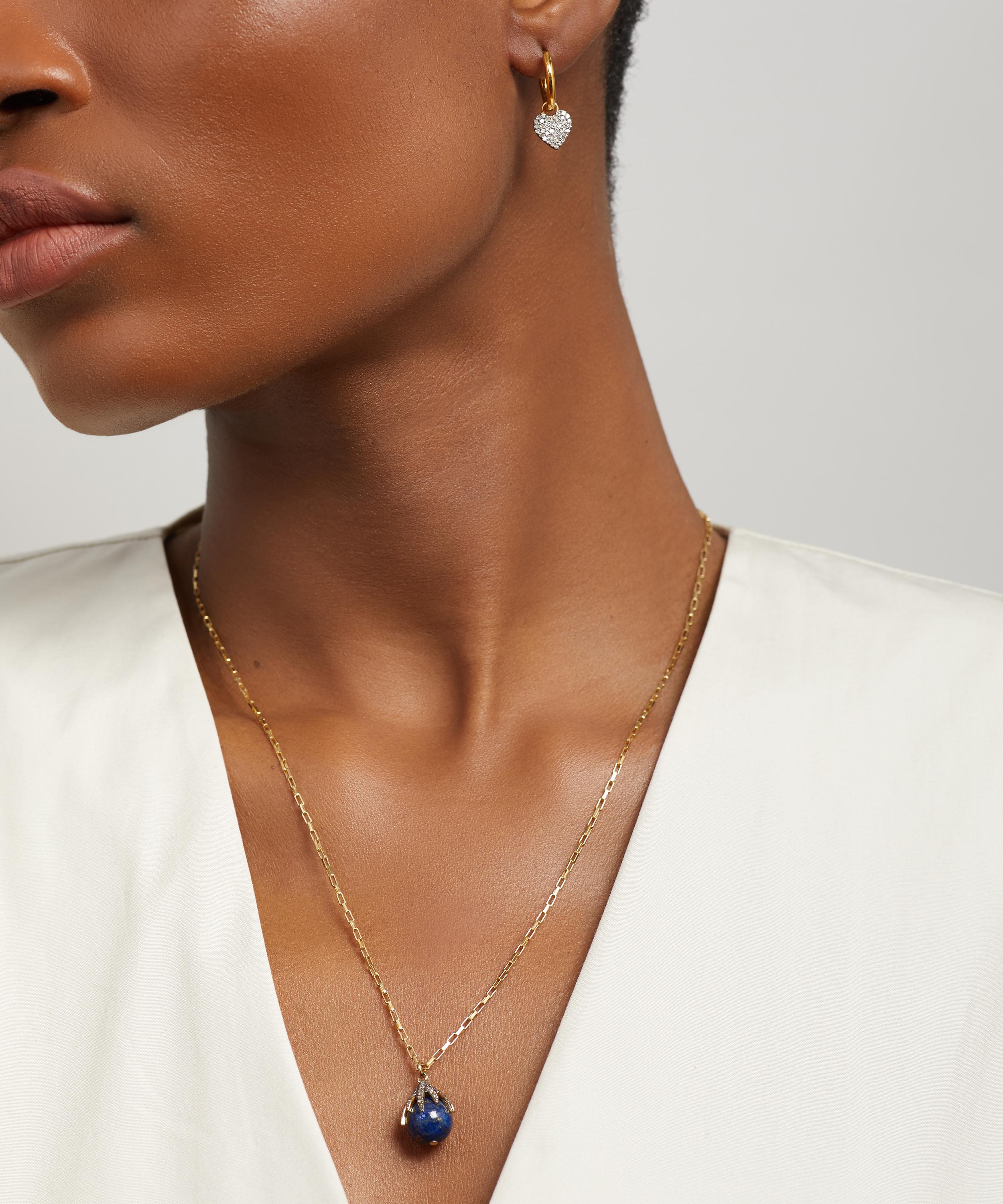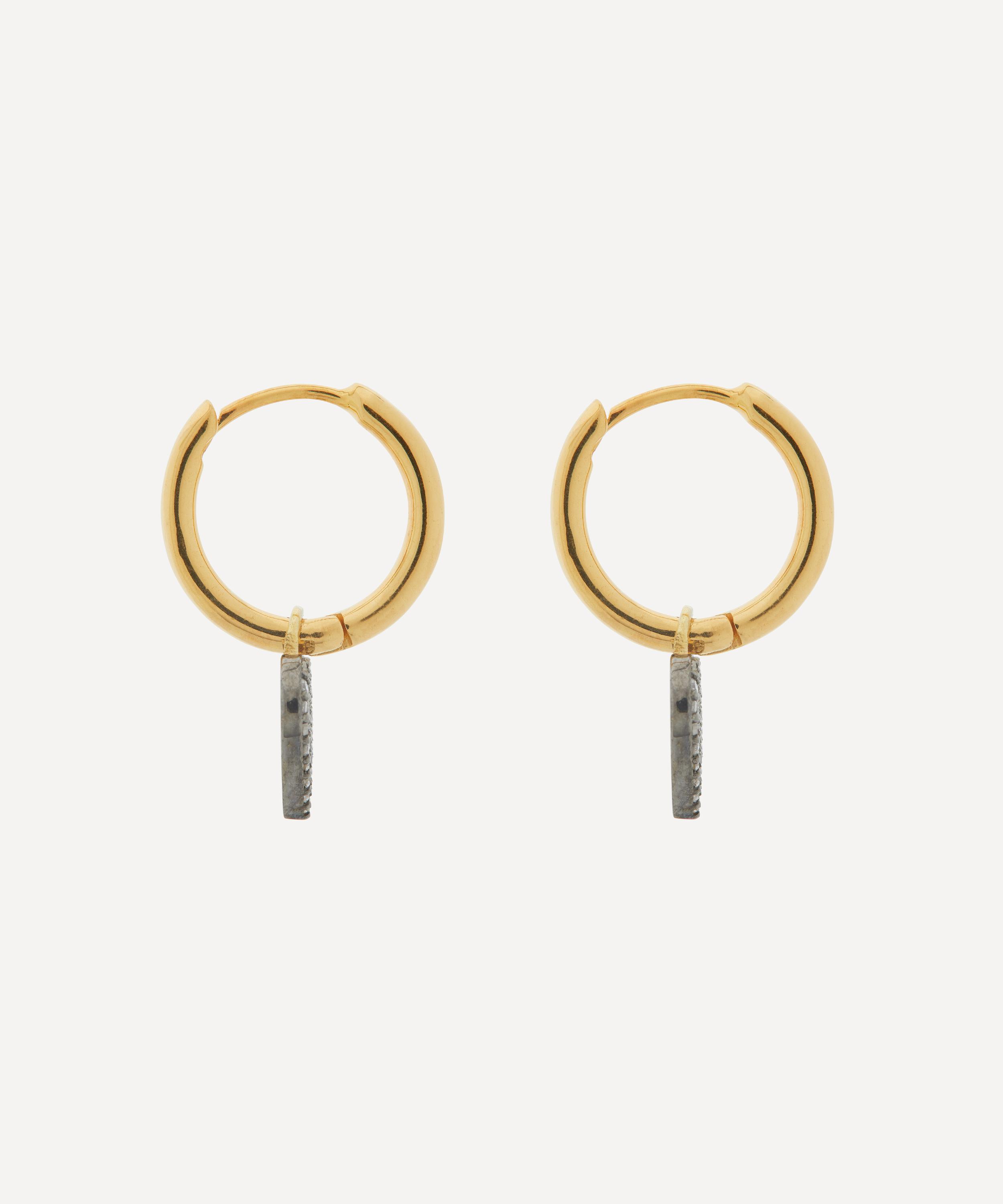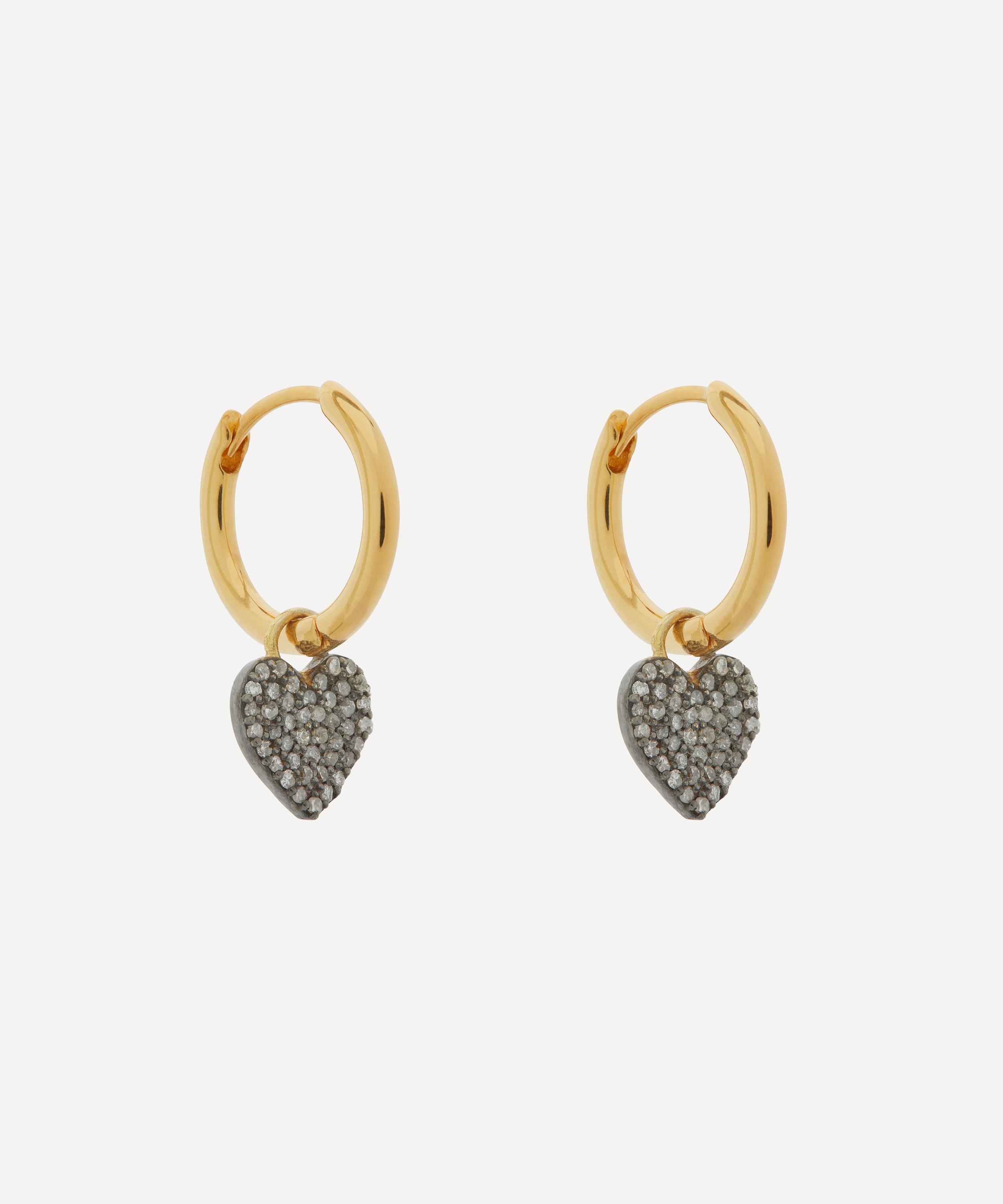Interlacing edgy style with a soft femininity, each earring features a gold-plated hoop adorned with a heart charm drop covered in pavé set diamonds. Wear this pair as they are, or incorporate them into a curated ear stack.
