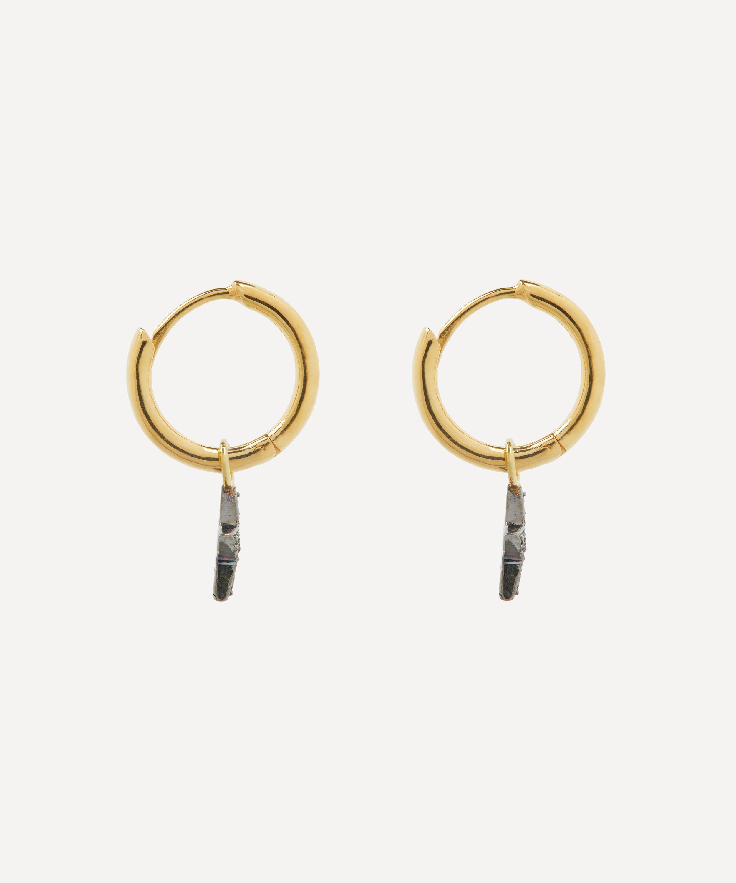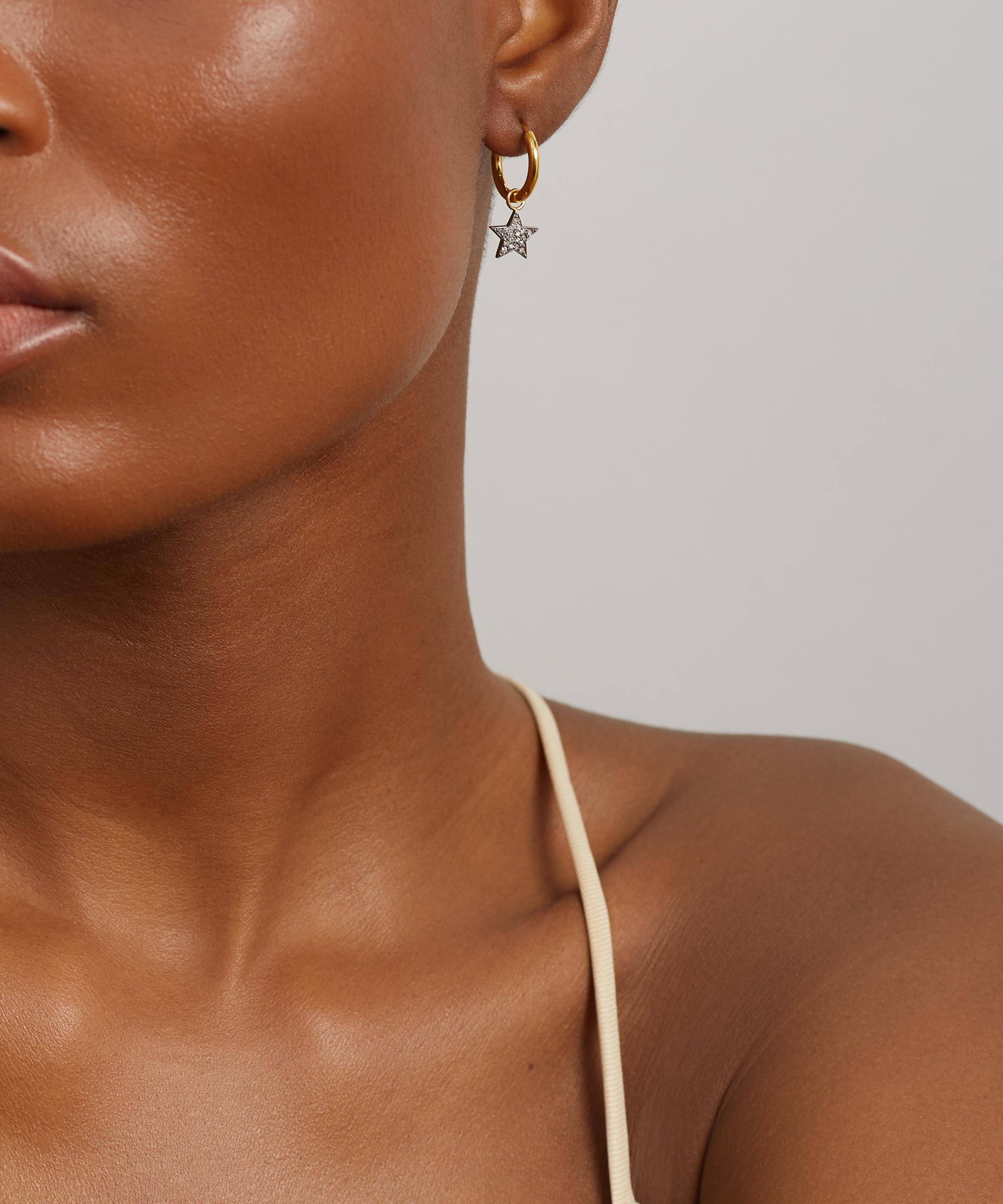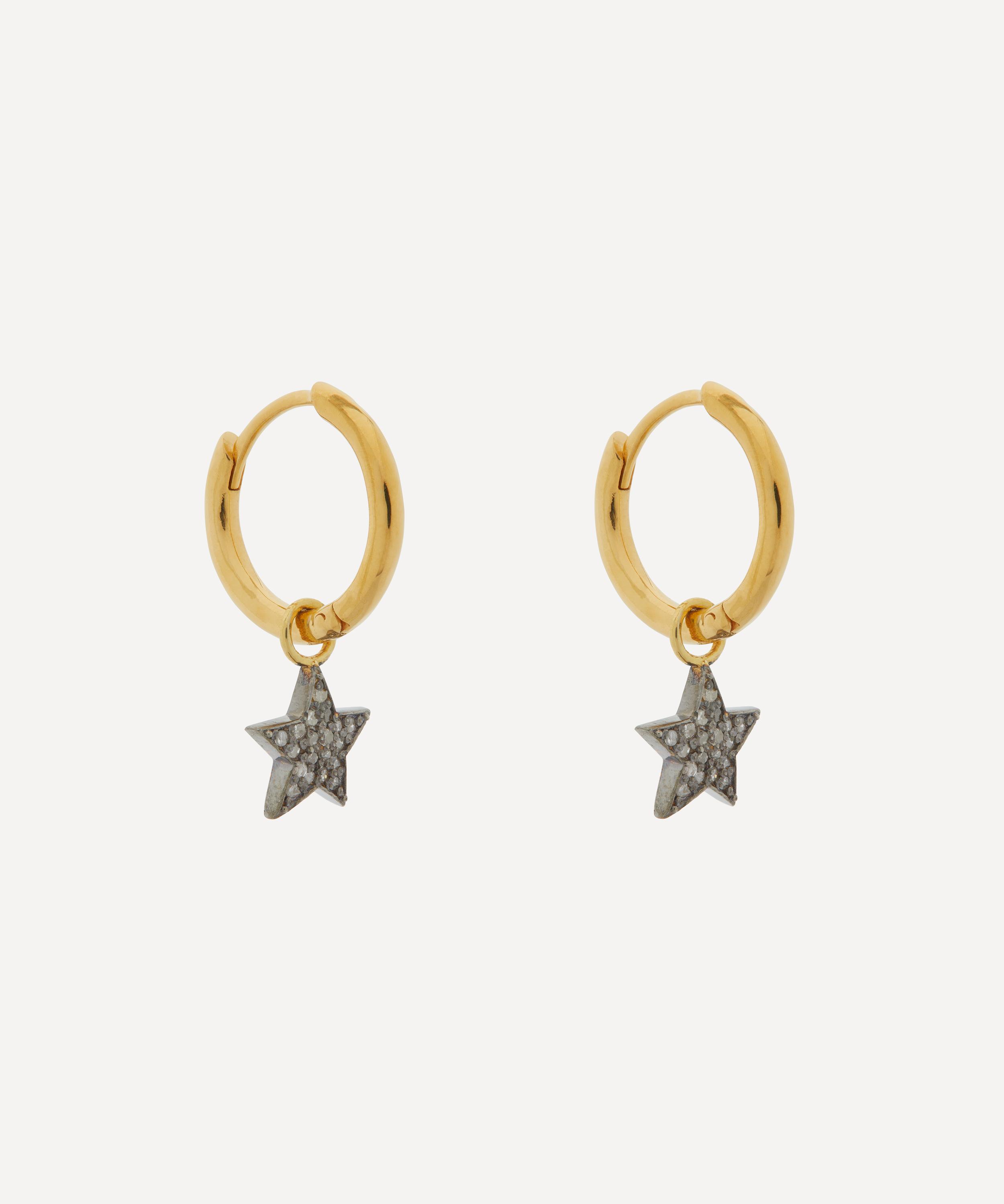 Interlacing edgy style with a soft femininity, each earring features a gold-plated hoop adorned with a star charm drop covered in pavé set diamonds. Wear this pair as they are, or incorporate them into a curated ear stack.