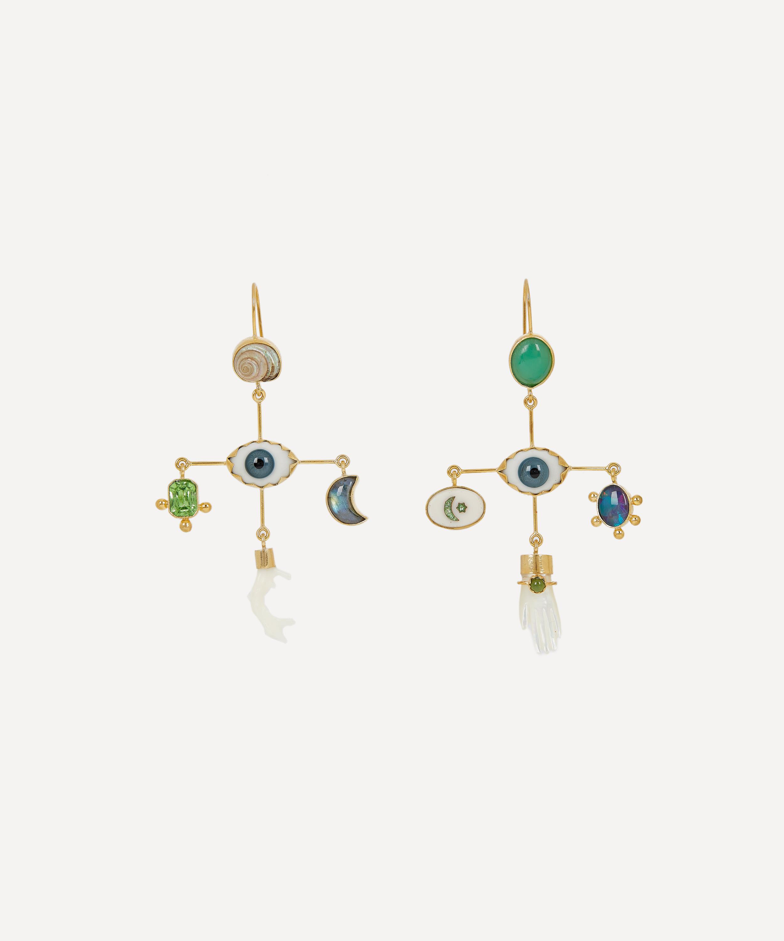Handmade in Edinburgh, every Grainne Morton creation is formed of a wonderfully unique curation of found objects, coloured gems and tiny trinkets. Each of the Eye Cross earrings features a cross-shaped, chandelier drop formed of an antique glass eye and an asymmetric assortment of shells, antique buttons and mixed-cut gems. Set within 18 carat gold-plated silver, they are an unexpected juxtaposition of vintage and contemporary styles - perfect for adding visual interest to everyday looks.
