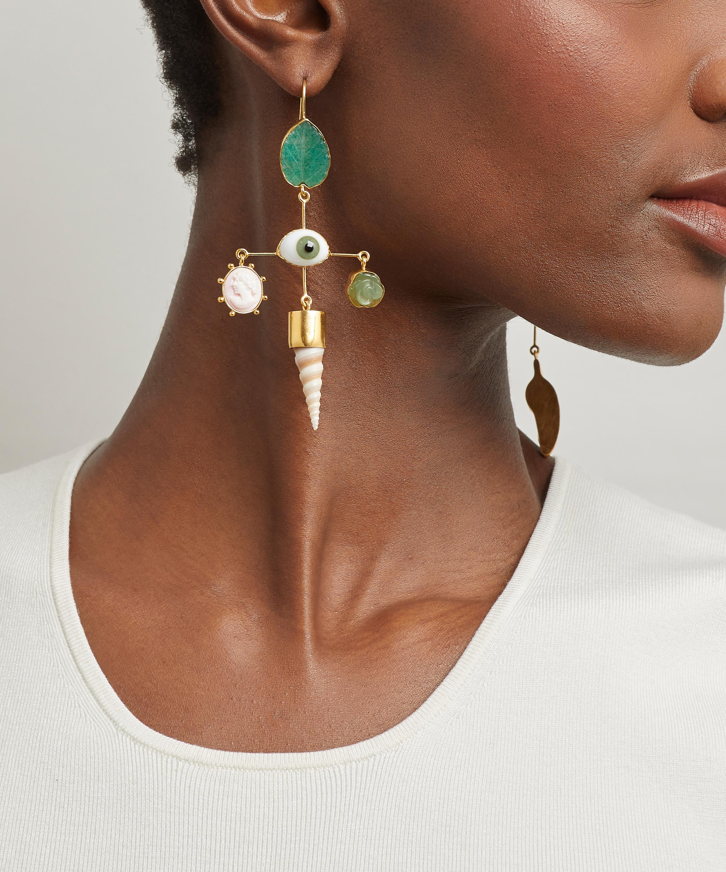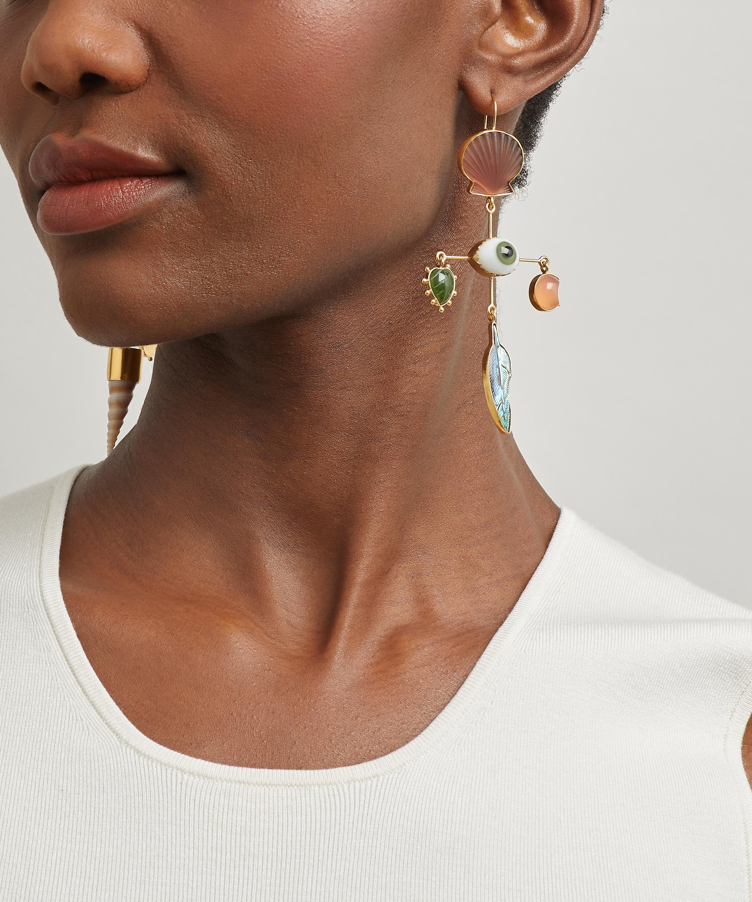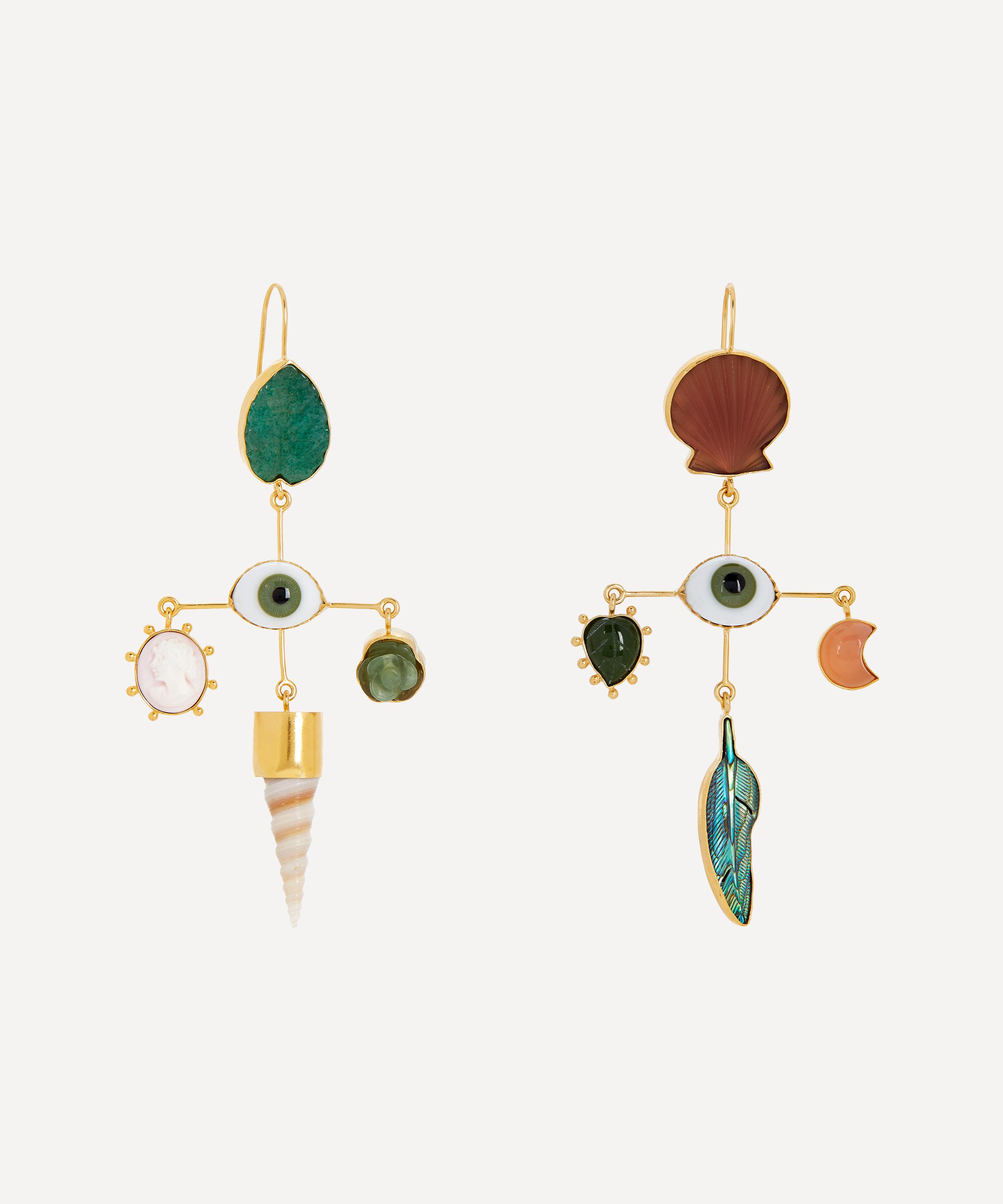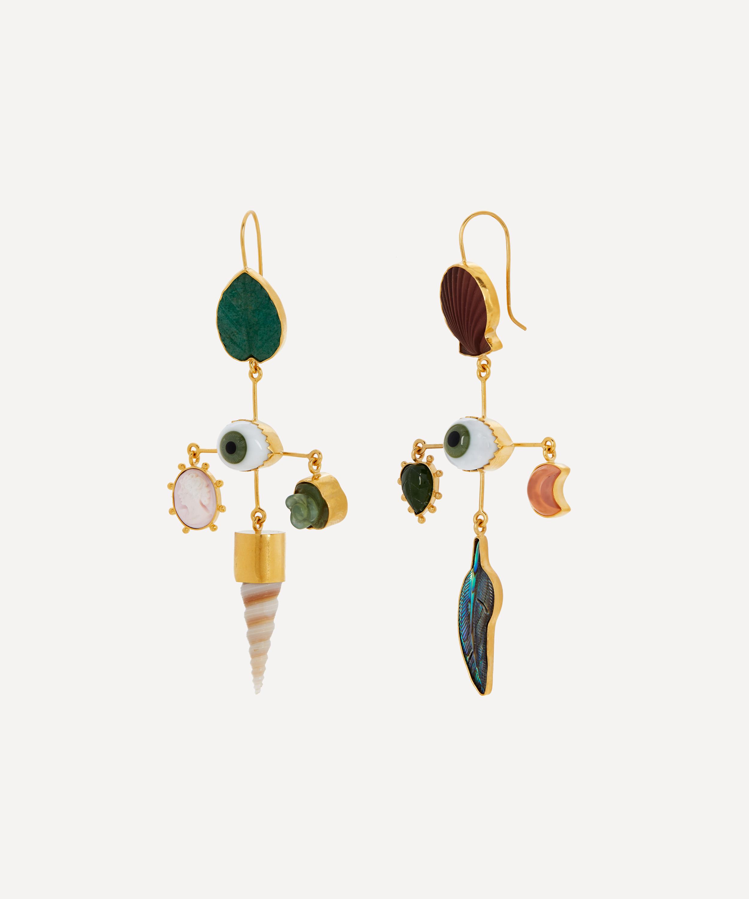 Handmade in Edinburgh, every Grainne Morton creation is formed of a wonderfully unique curation of found objects, coloured gems and tiny trinkets. Each of these cross-shaped drop earrings features a single antique glass eye and four mismatched gemstone charms, including a leaf, a shell, a crescent moon and a rose. Set into 18 carat gold-plated sterling silver, they offer an unexpected juxtaposition of vintage and contemporary styles - perfect for adding visual interest to special occasion looks.