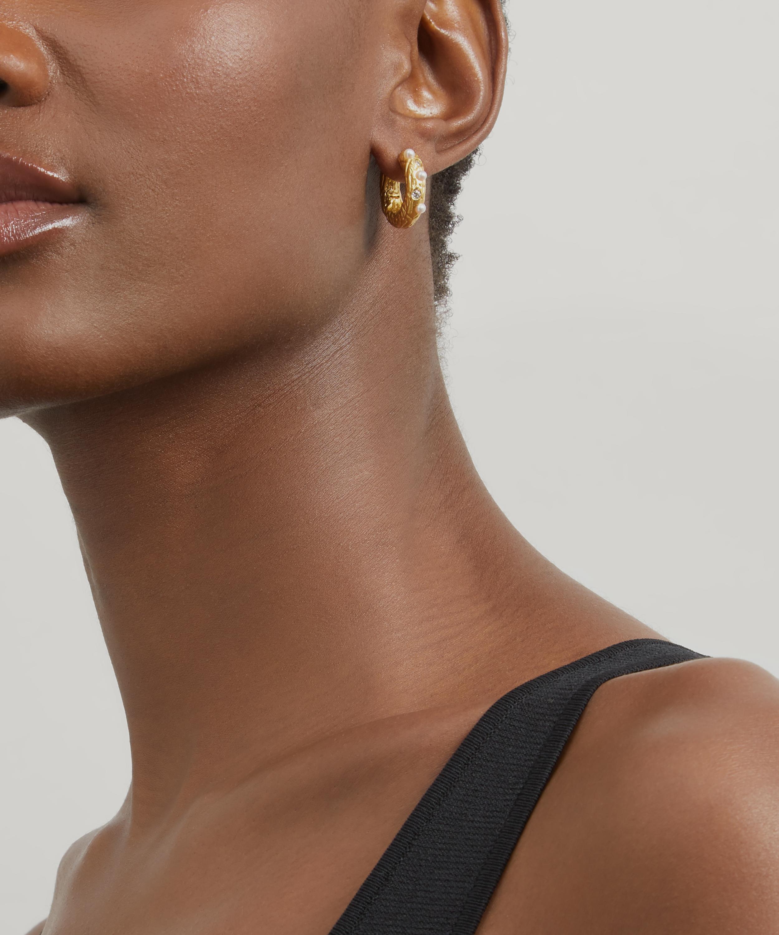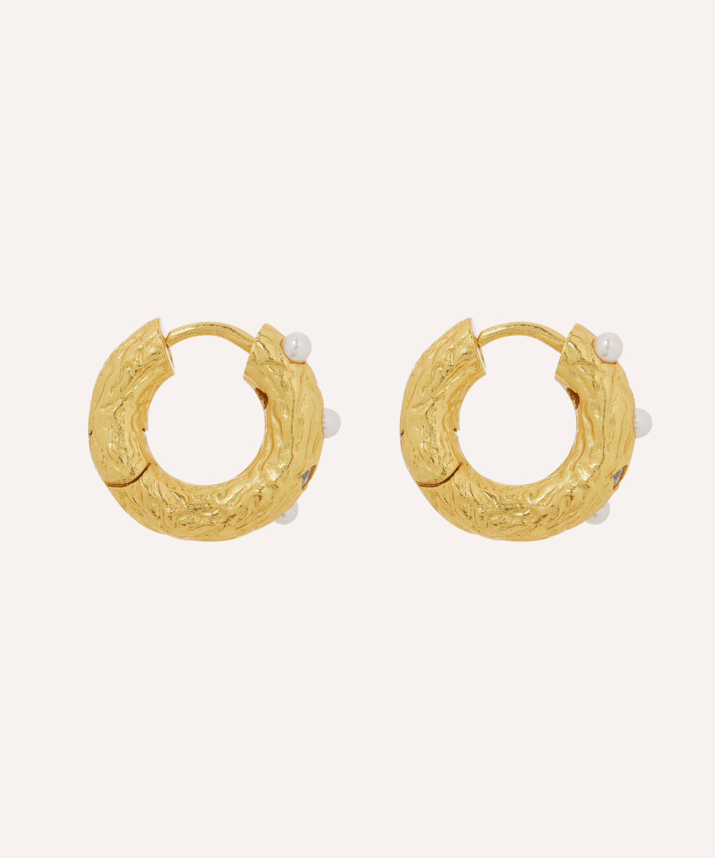A stripped-back alternative to the brand's signature beaded designs, each of these high-polished hoop earrings features five glittering white crystal and pearl cabochon accents set into the front edge, while the hammered texture of the metal creates an organic, antique effect. Effortlessly stylish and endlessly stackable, try them with a graduating row of smaller hoops trailing up the side of the ear, or add an array of mismatched studs to channel the brand's playful, free-spirited aesthetic.