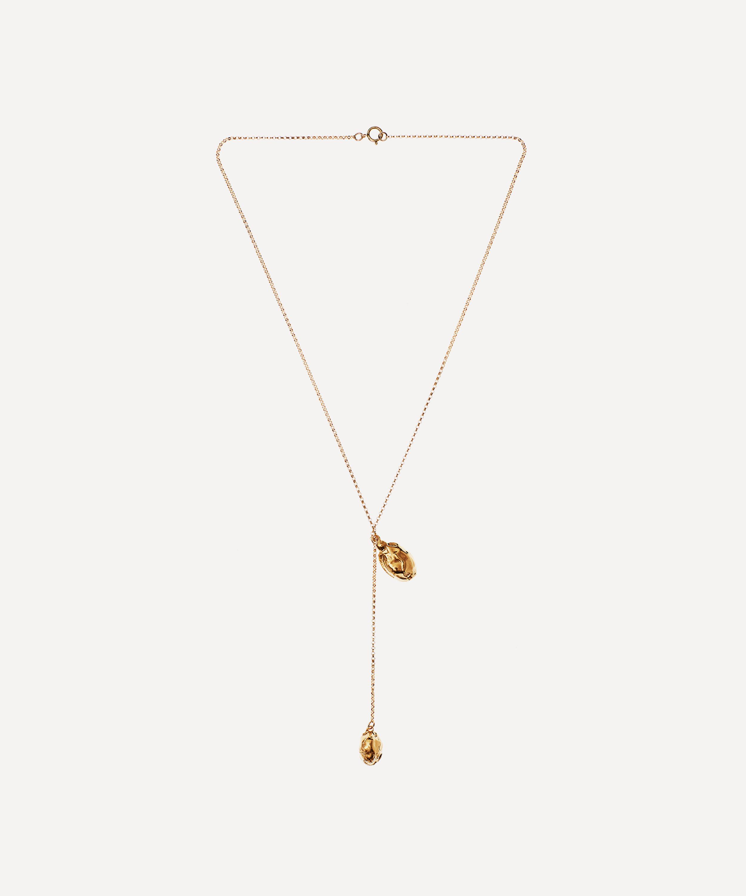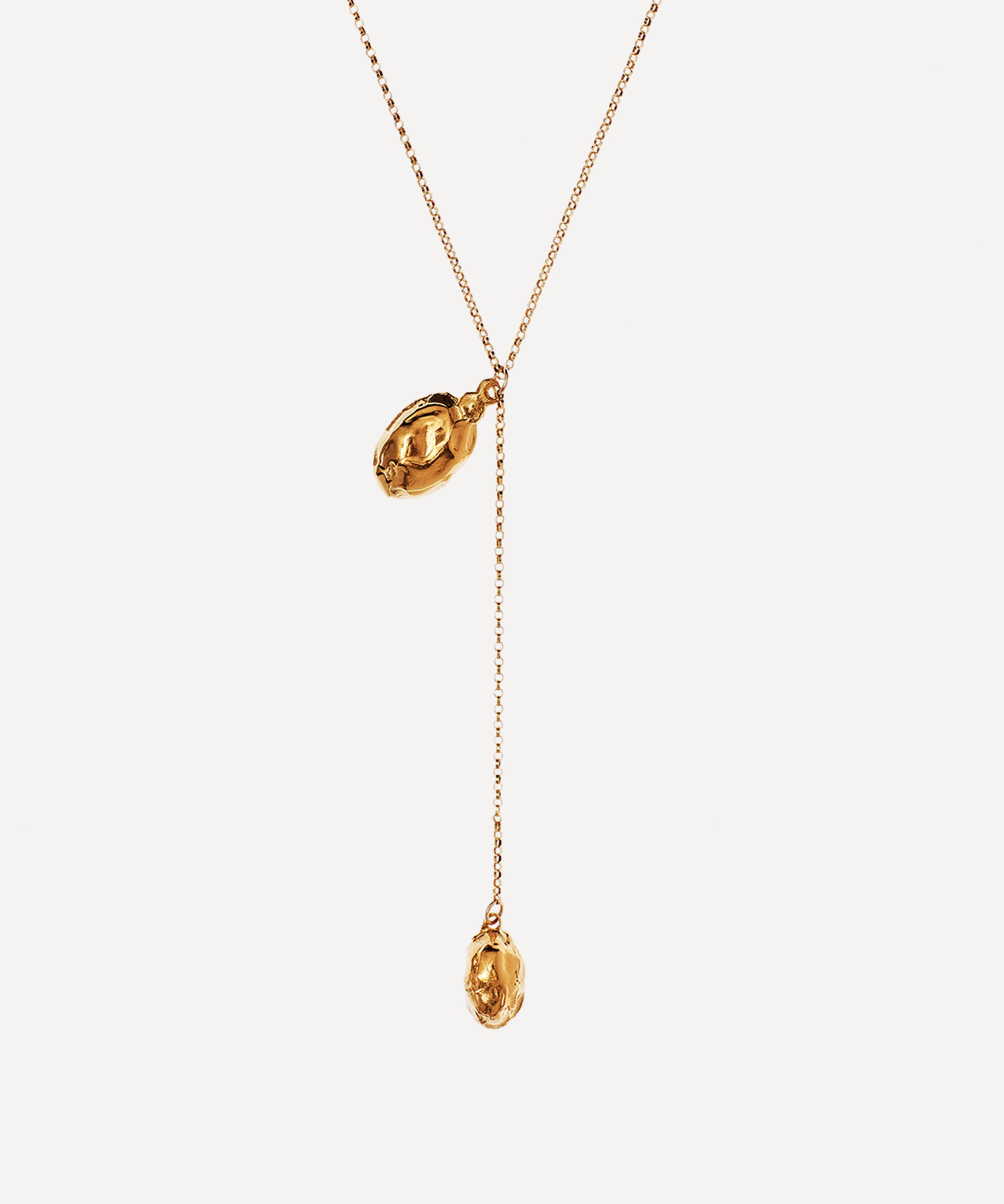 Inspired by Dante's arrival into the magical sphere of the moon in the Divine Comedy, Alighieri's Many Moons Ago collection draws on the light and serenity of the lunar sphere after many months of darkness. Crafted from 24 carat gold-plated bronze, this necklace features a gold-filled rolo chain with a long Y-shaped drop and two textured rock pendants that are designed to resemble little craters of the moon. Wear it with a plunging V-neckline to elegantly frame the lariat-style design.