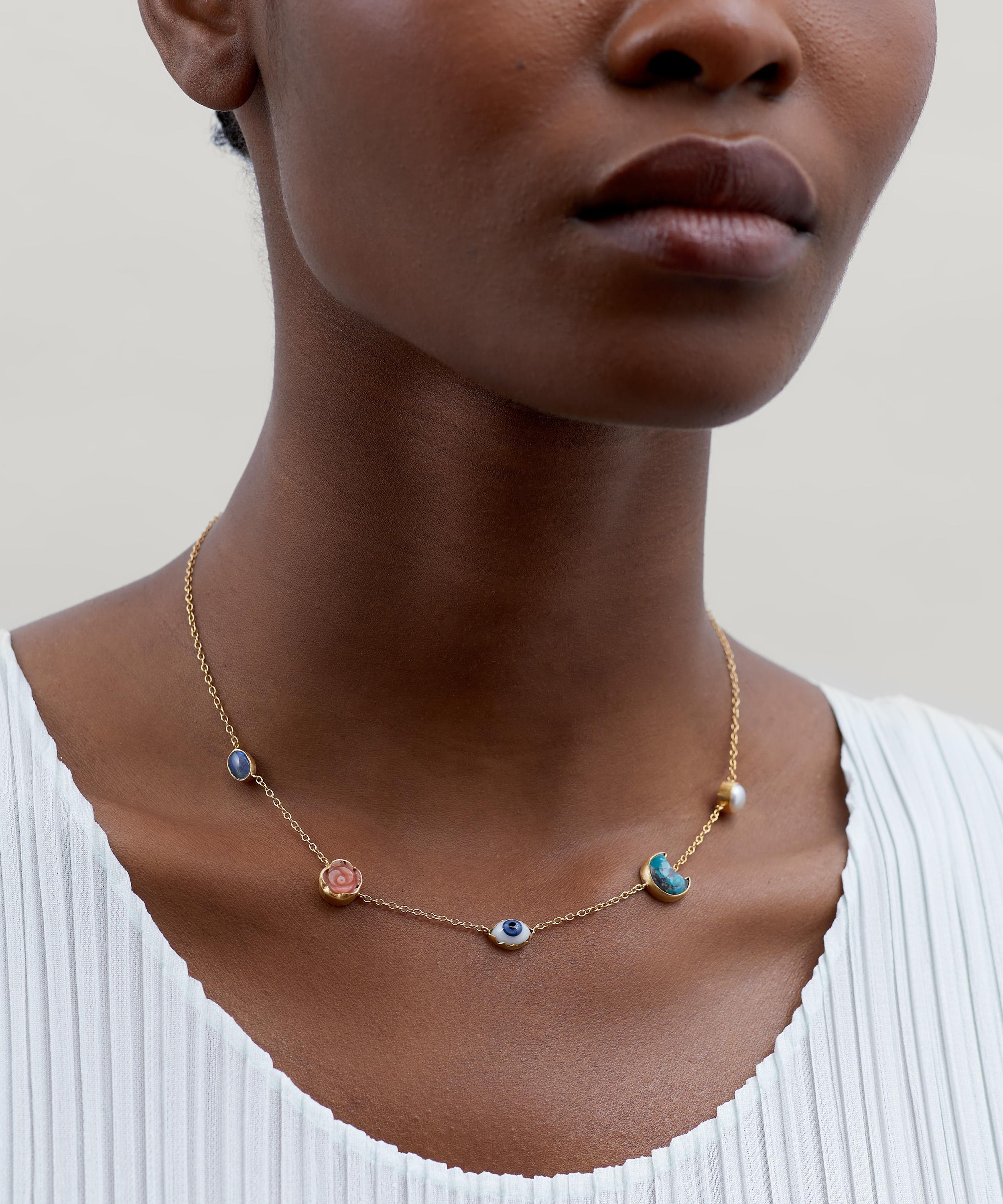 Handmade in Edinburgh, every Grainne Morton creation is formed of a wonderfully unique curation of found objects, coloured gems and tiny trinkets. Crafted from 18 carat gold-plated sterling silver, this fine chain necklace features five mini charms, including a vintage glass eye, a pearl, a carved coral flower and two mixed-cut turquoise and opal stones. Finished with a simple toggle clasp, it offers an unexpected juxtaposition of vintage and contemporary styles - perfect for adding visual interest to everyday looks.