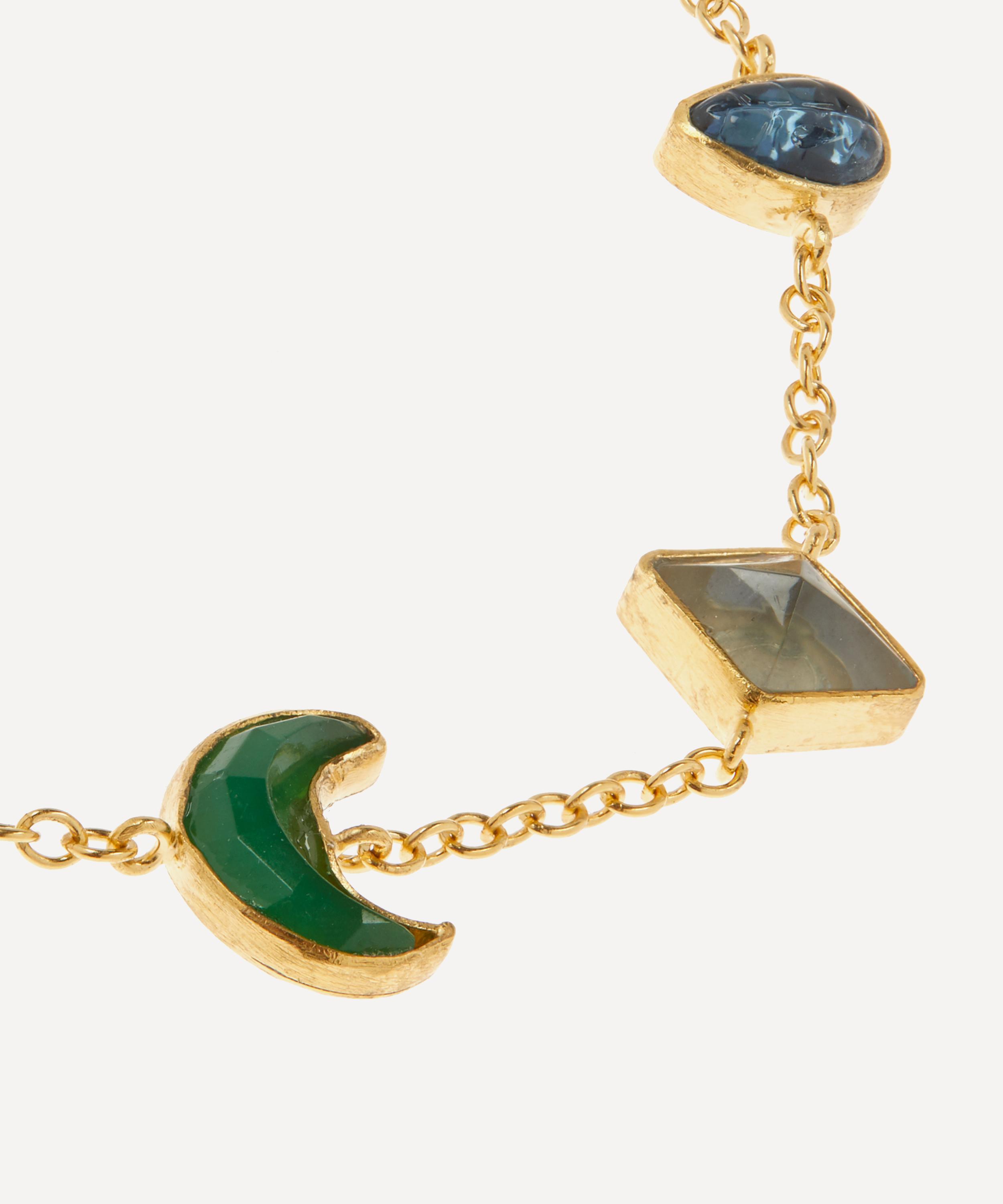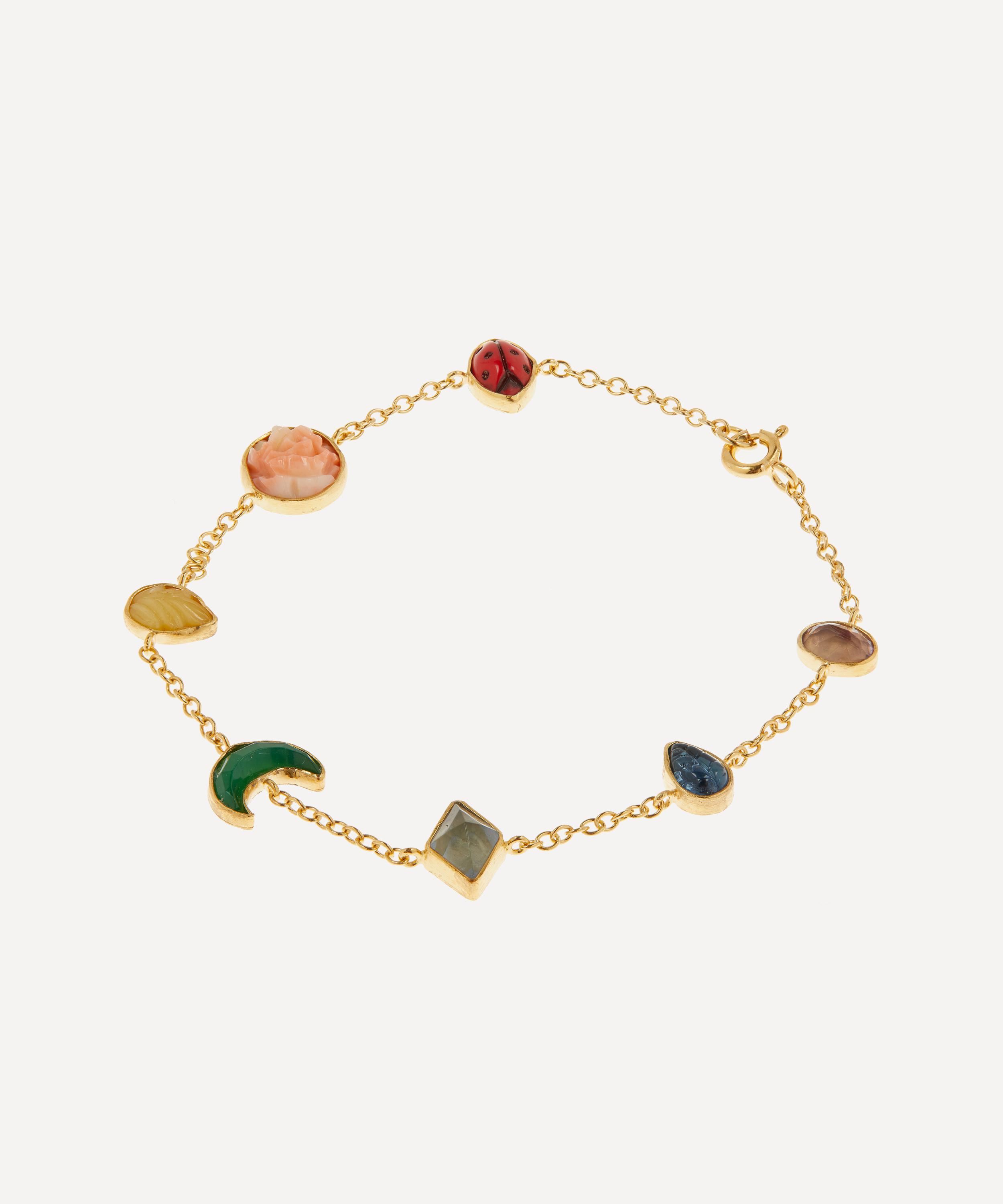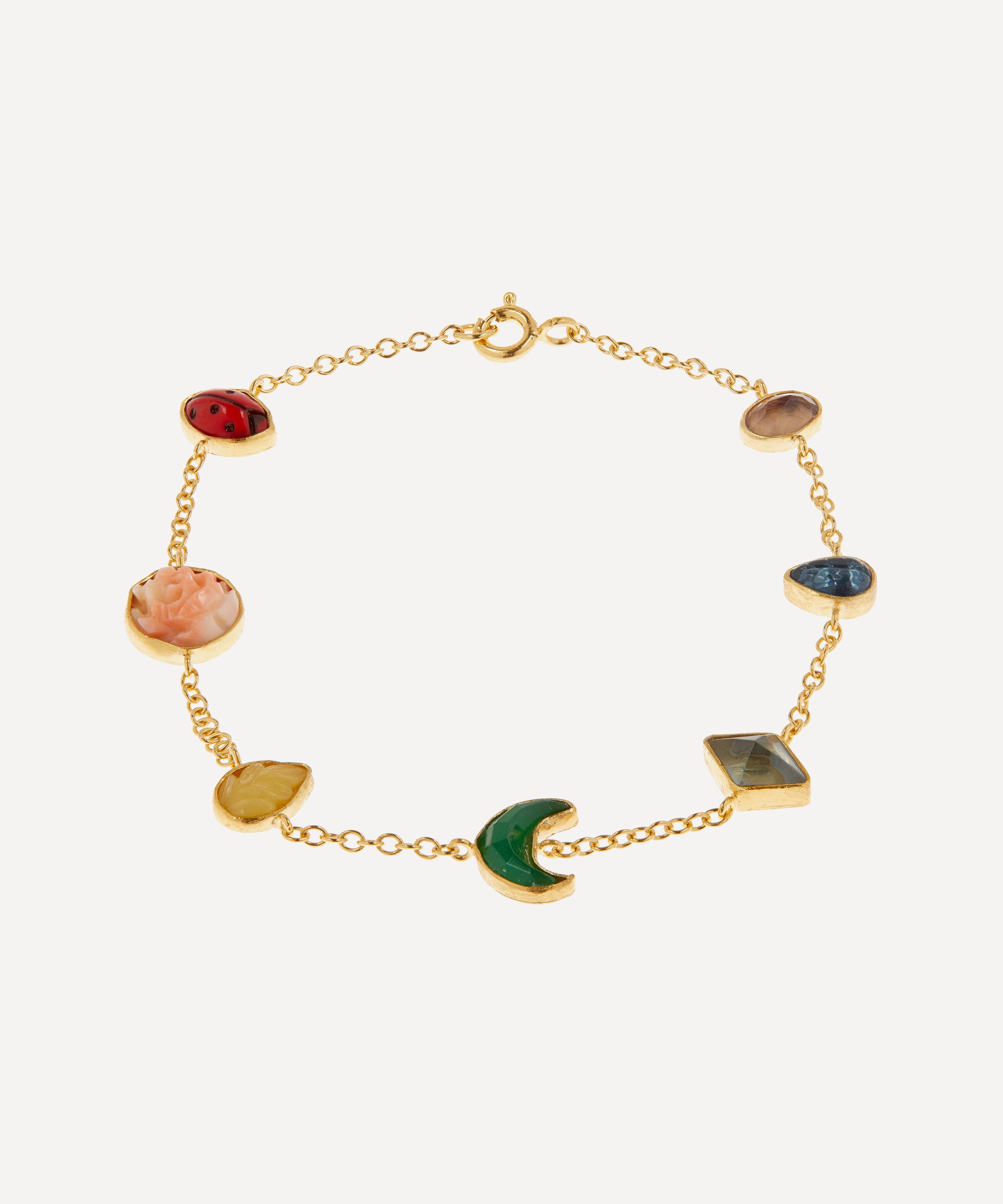 Handmade in Edinburgh, every Grainne Morton creation is formed of a wonderfully unique curation of found objects, coloured gems and tiny trinkets. Crafted from 18 carat gold-plated sterling silver, this delicate chain bracelet features seven mini charms, including a ladybird button, floral and leaf carvings and several mixed-cut, multi-coloured gems. Finished with a simple spring clasp, it offers an unexpected juxtaposition of vintage and contemporary styles - perfect for adding visual interest to everyday looks.