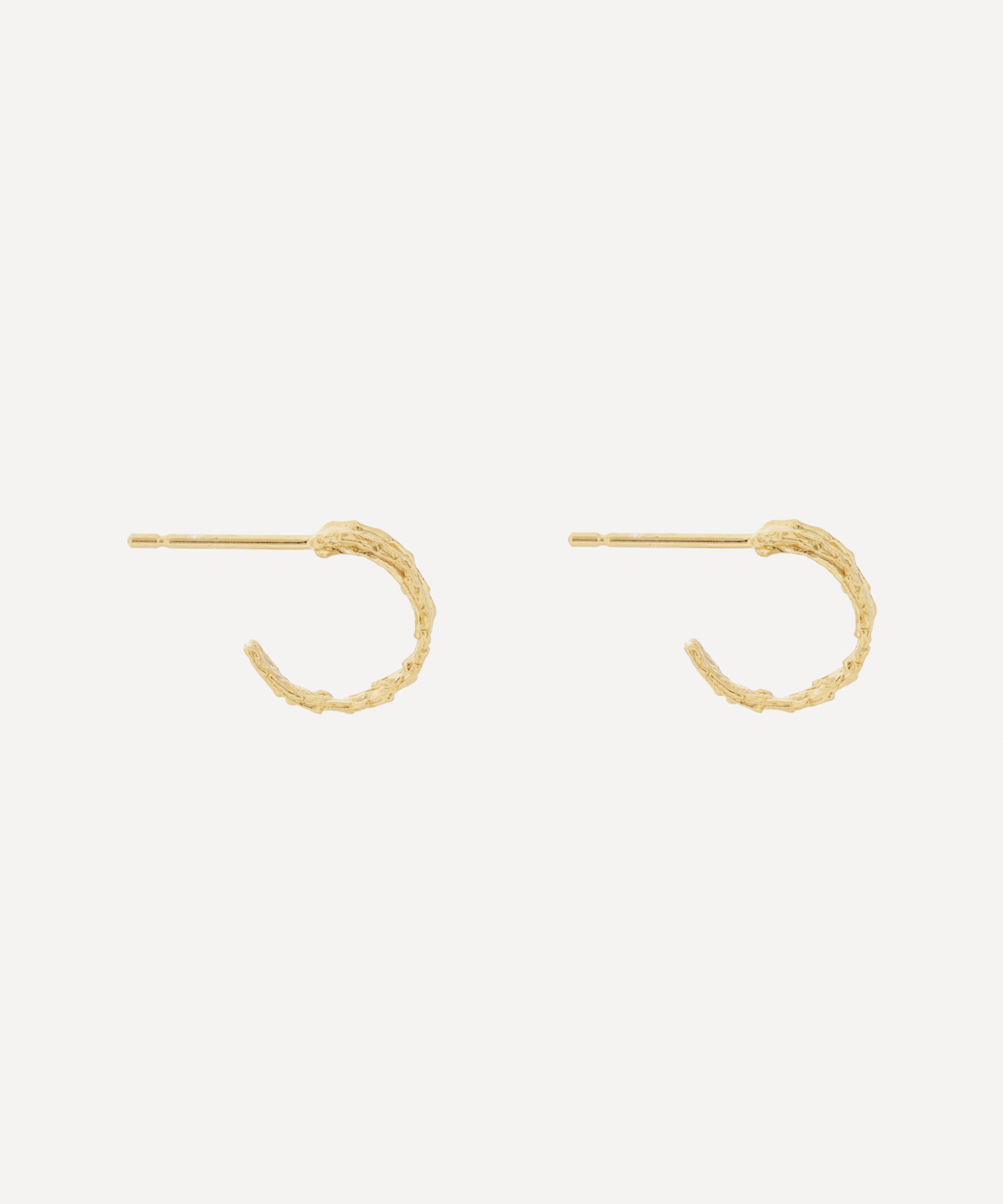 Alex Monroe's Nest Structure mini hoop earrings showcase the designer's affinity for natural motifs. Handcrafted in the brand's London studio from gold-plated silver, each earring features an open hoop accented with an organic textured detailing – inspired by the intricate structures of nesting birds. Mix and match with other natural motifs from the brand's collections for a wearable representation of the elegance and delicacy of the natural world.