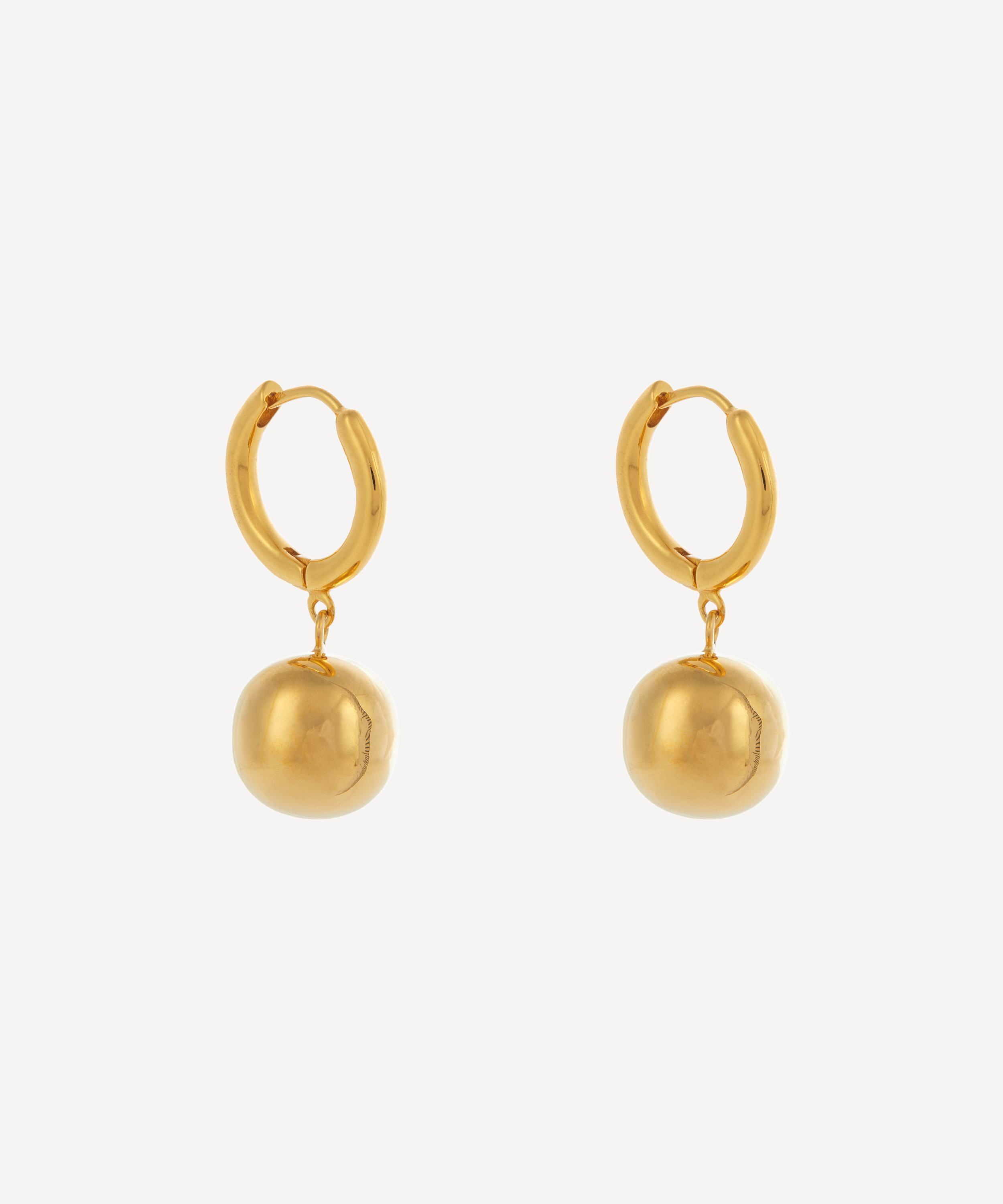 Crafted from 22 carat gold-plated sterling silver, each of these earrings features a high-polished huggie hoop with a solid ball drop charm dangling from the base. The clean, contemporary design is perfect for both day and night dressing - style them solo for an elevated everyday look, or wear them with a chunky chain necklace and an array of mismatched gold studs for an elegant evening-ready approach.