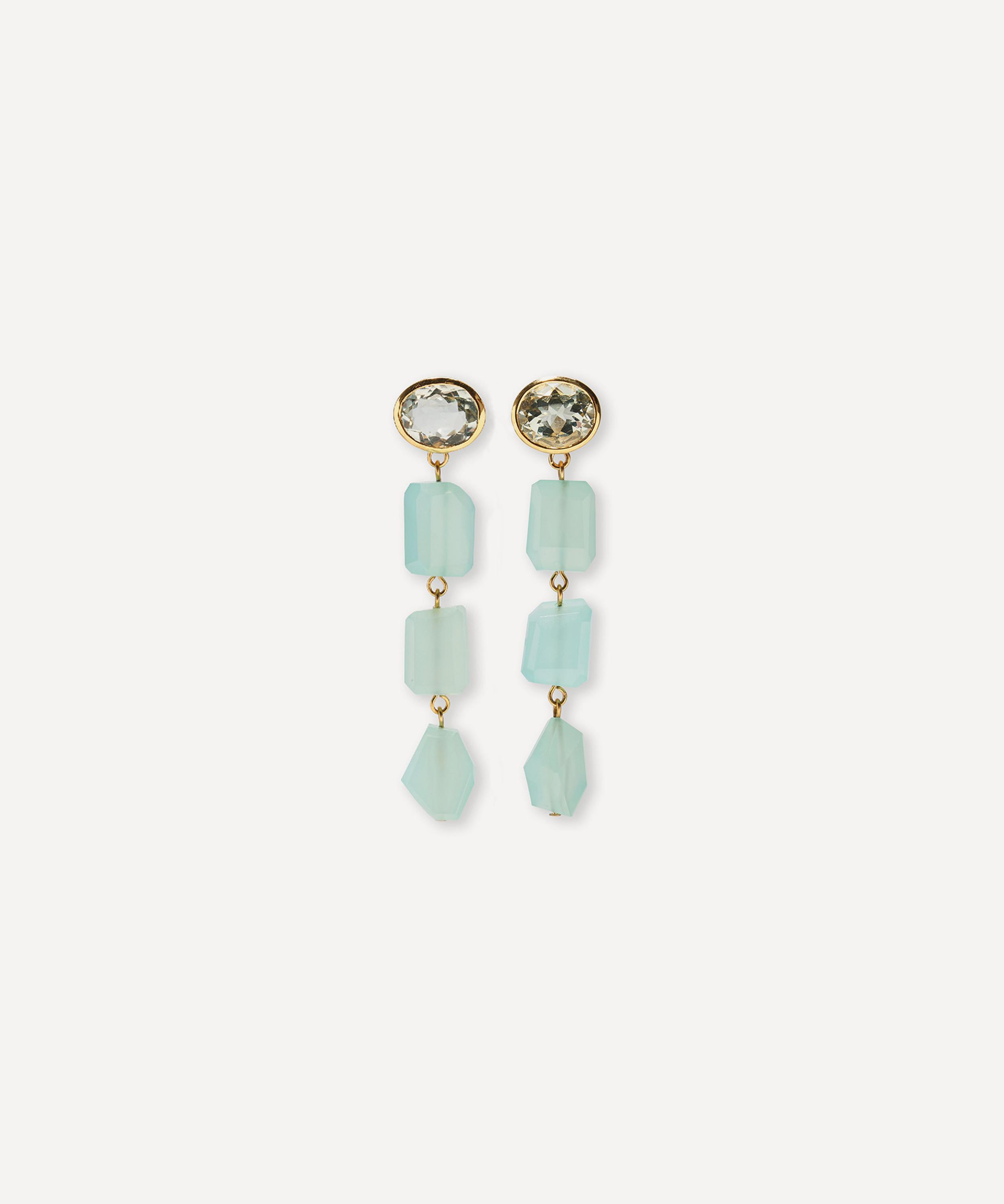 Crafted from gold-plated brass, each earring features a faceted green amethyst top and is linked chalcedony stone drops, with a post and butterfly fattening to finish.About Lizzie Fortunato