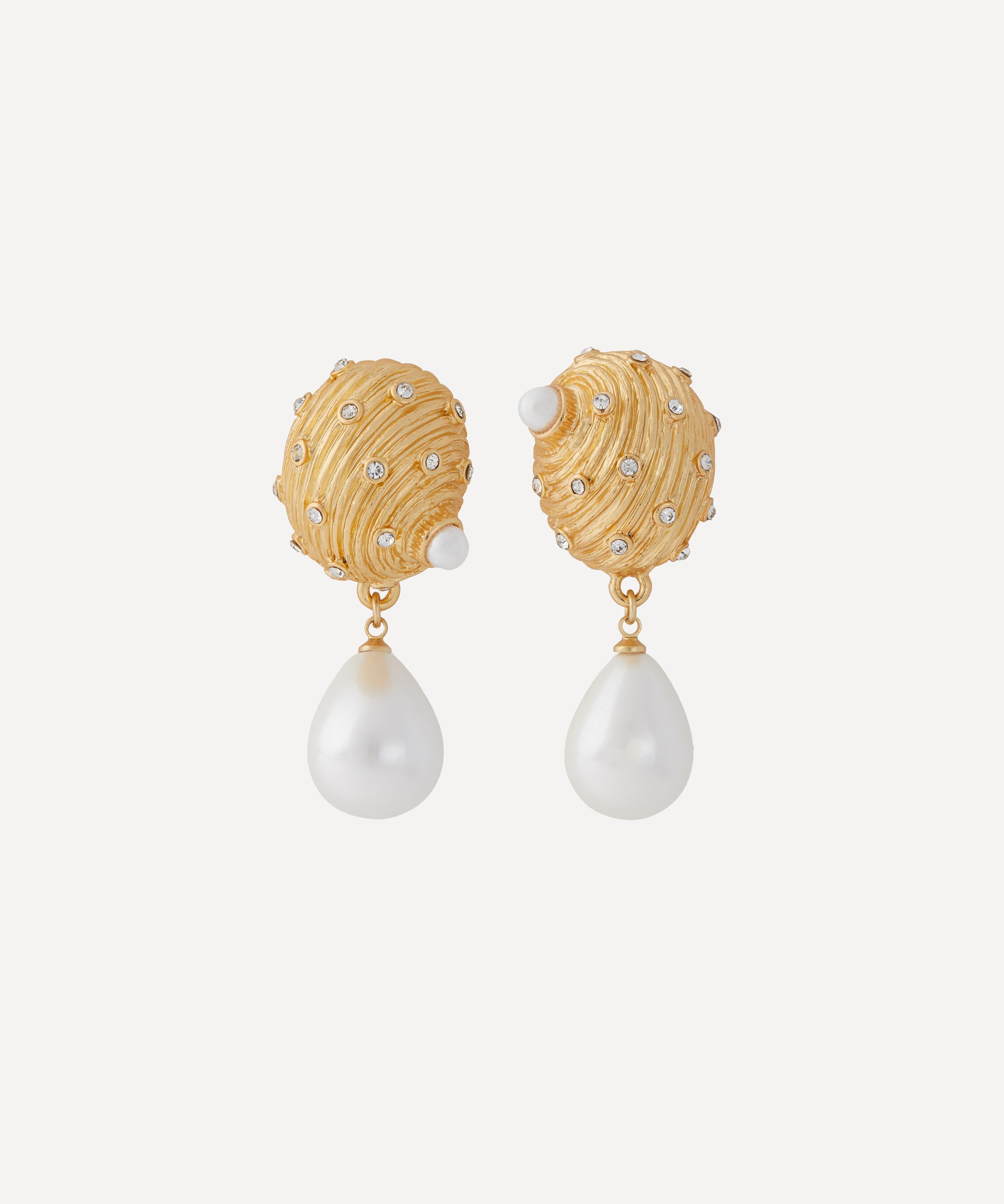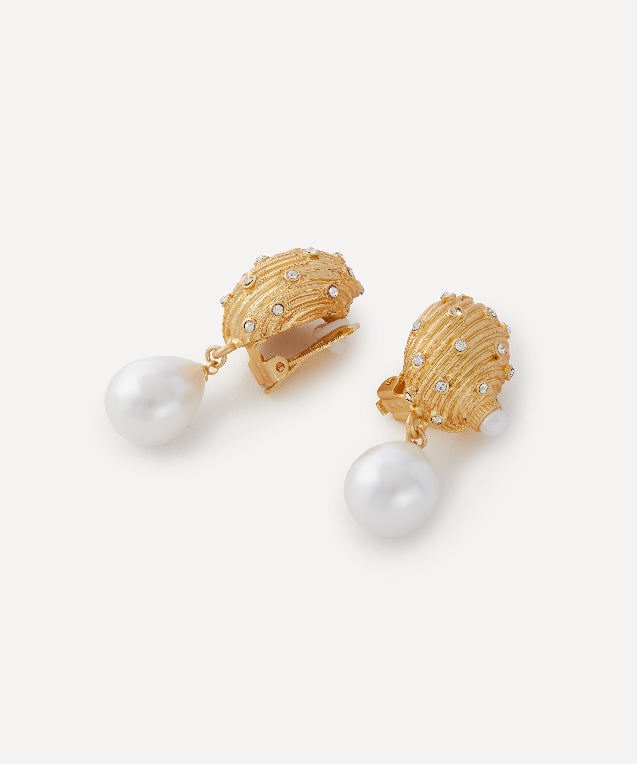 Crafted from gold-plated brass, these elegant earrings feature a seashell design with a textured finish and sparkling crystal accents, a dropped faux pearl, and a classic clip-on backing. Exemplifying the extravagant opulence and effortless elegance that have defined the label for almost 60 years – pair with other pieces from the brand for a maximalist jewellery curation.