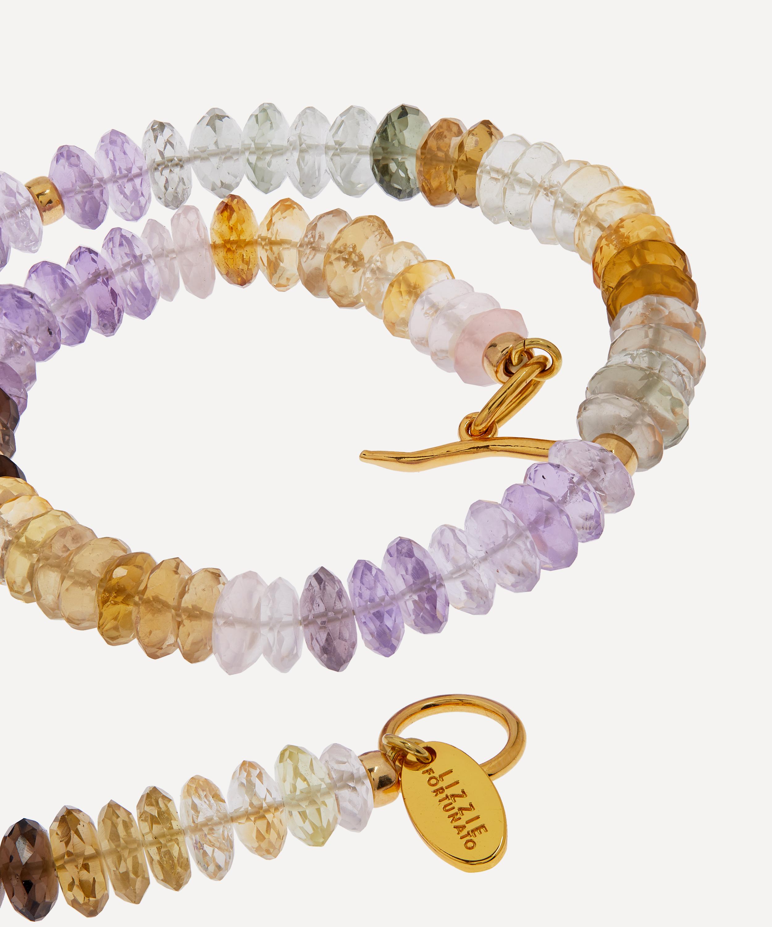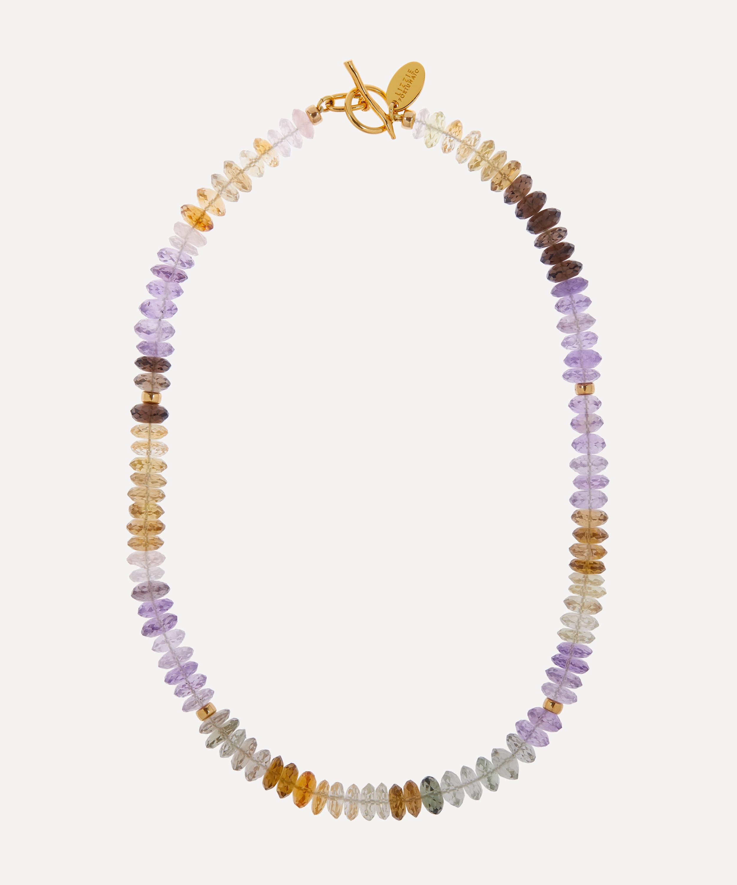 Exemplifying her affinity for raw, natural gemstones, Lizzie Fortunato presents the Selena necklace. Boasting a striking statement piece, this necklace features a beaded ombre design composed of multi-coloured quartz stones. Complete with a gold-plated toggle clasp, it can be worn solo for an understated pop of colour, or mixed with layered chains for a contrasting look.