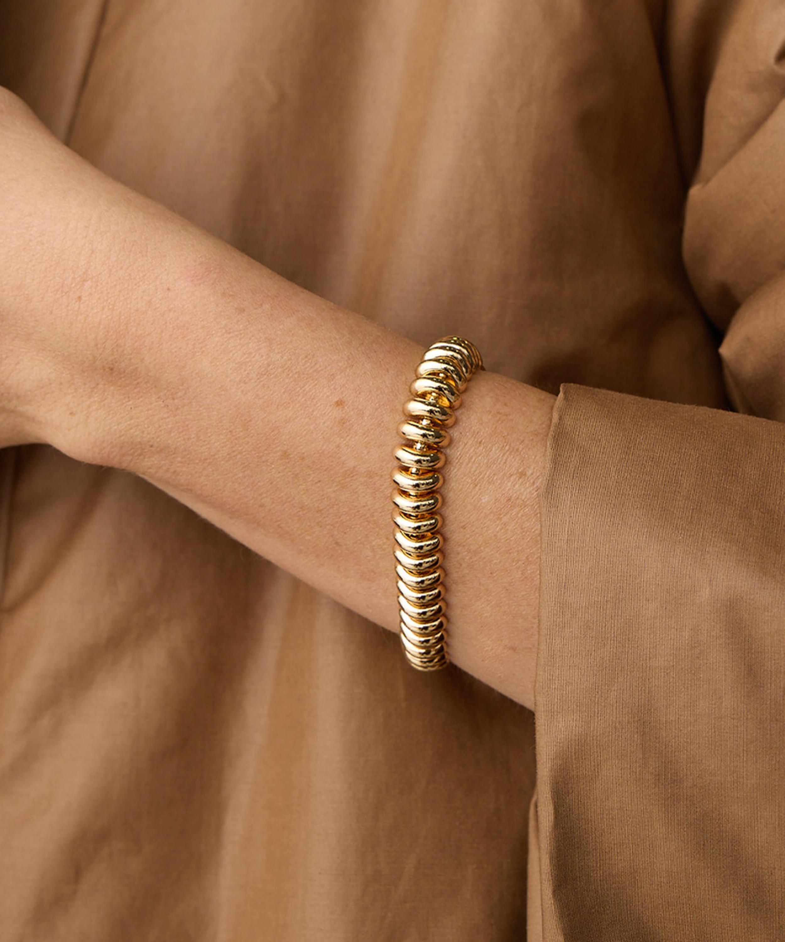 Celebrate the power of good style and the art of getting dressed with the Sofia bracelet from JENNY BIRD. Fashioned with a ribbed texture through a unique caterpillar construction in gold-plated brass, the design is finished with a high-polish finish. Fashionable and ultra-versatile, it can be worn as a solo piece or layered with other necklaces to create a trend-led stack - try teaming it with the matching Sofia Choker Necklace for a co-ordinating look.