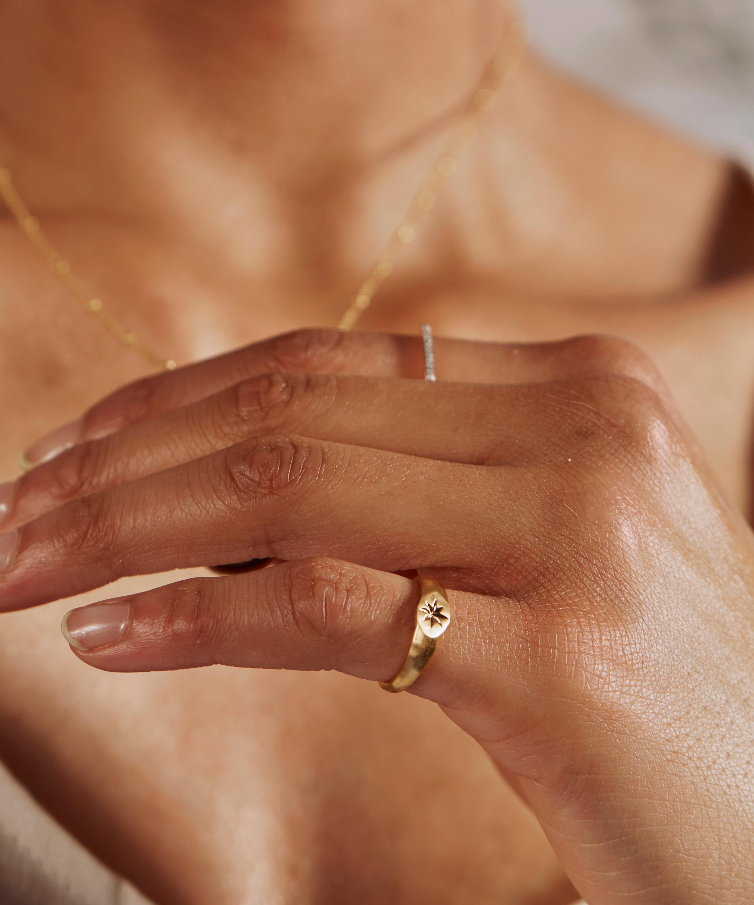 Boasting with vintage appeal, this ring features a classic signet silhouette with a satin-finish and high-polished engraved star motif - symbolising guidance and protection. Transform your regular ring stack with this luxurious piece, or wear it solo for a minimal statement.