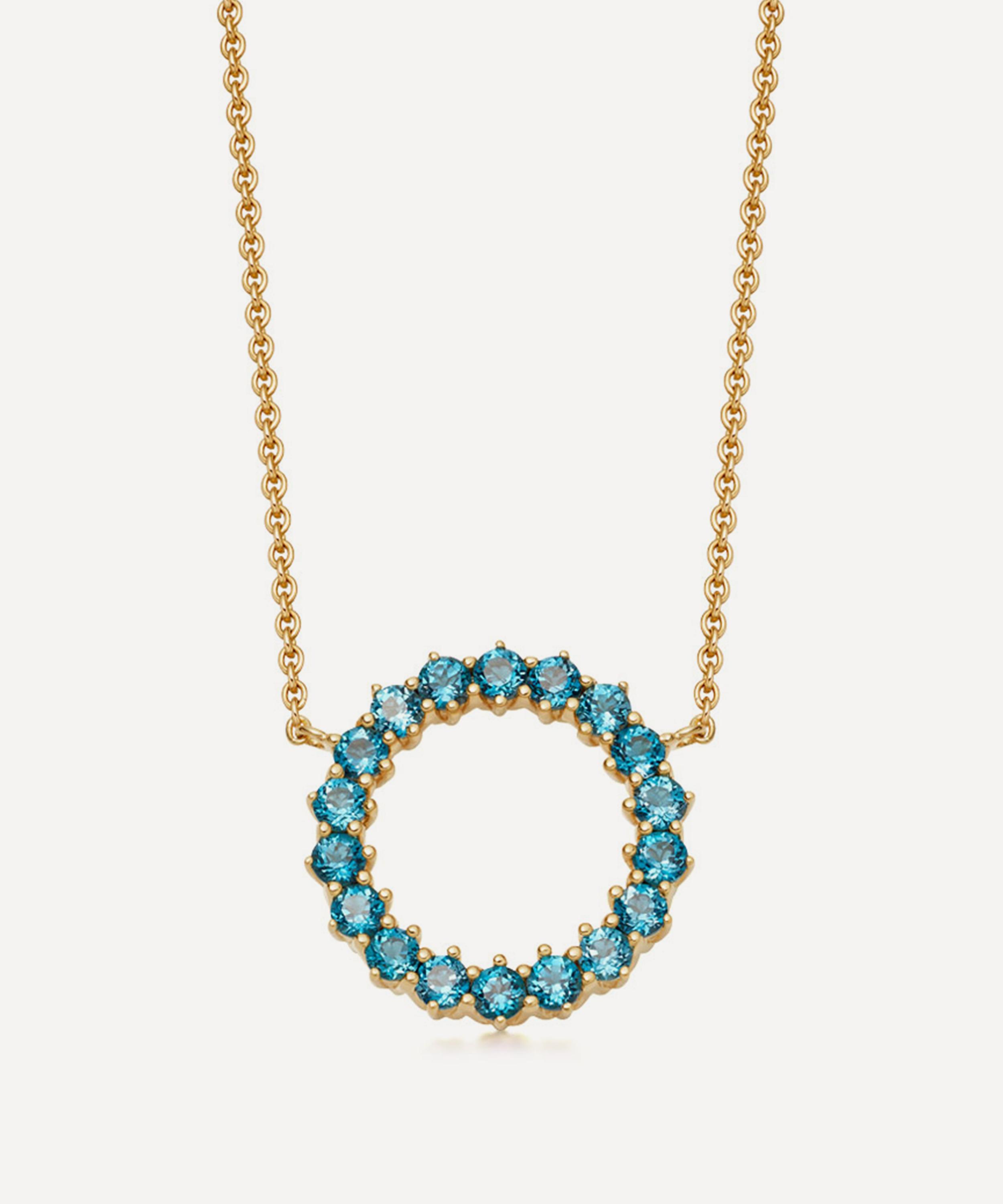 Characterised by a fine trace chain that sits just below the collar bone, this necklace features an open circle pendant formed of 18 faceted London blue topaz stones - each presented in one of the brand’s decorative Linia six-prong settings. An elegant addition to any jewellery curation, it styles beautifully with other understated gold chains or several coordinating styles from the collection for an opulent evening look that's bursting with colour.