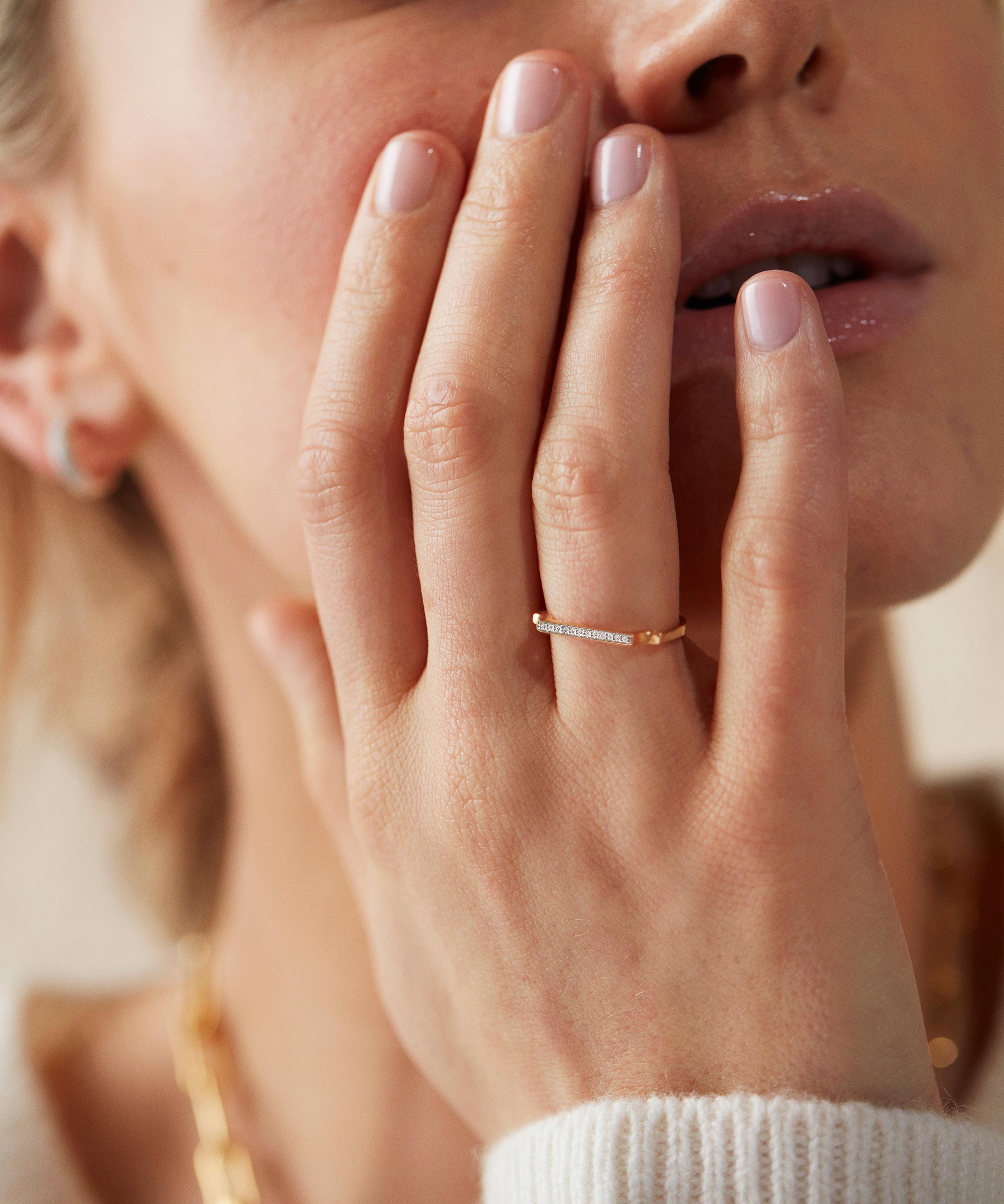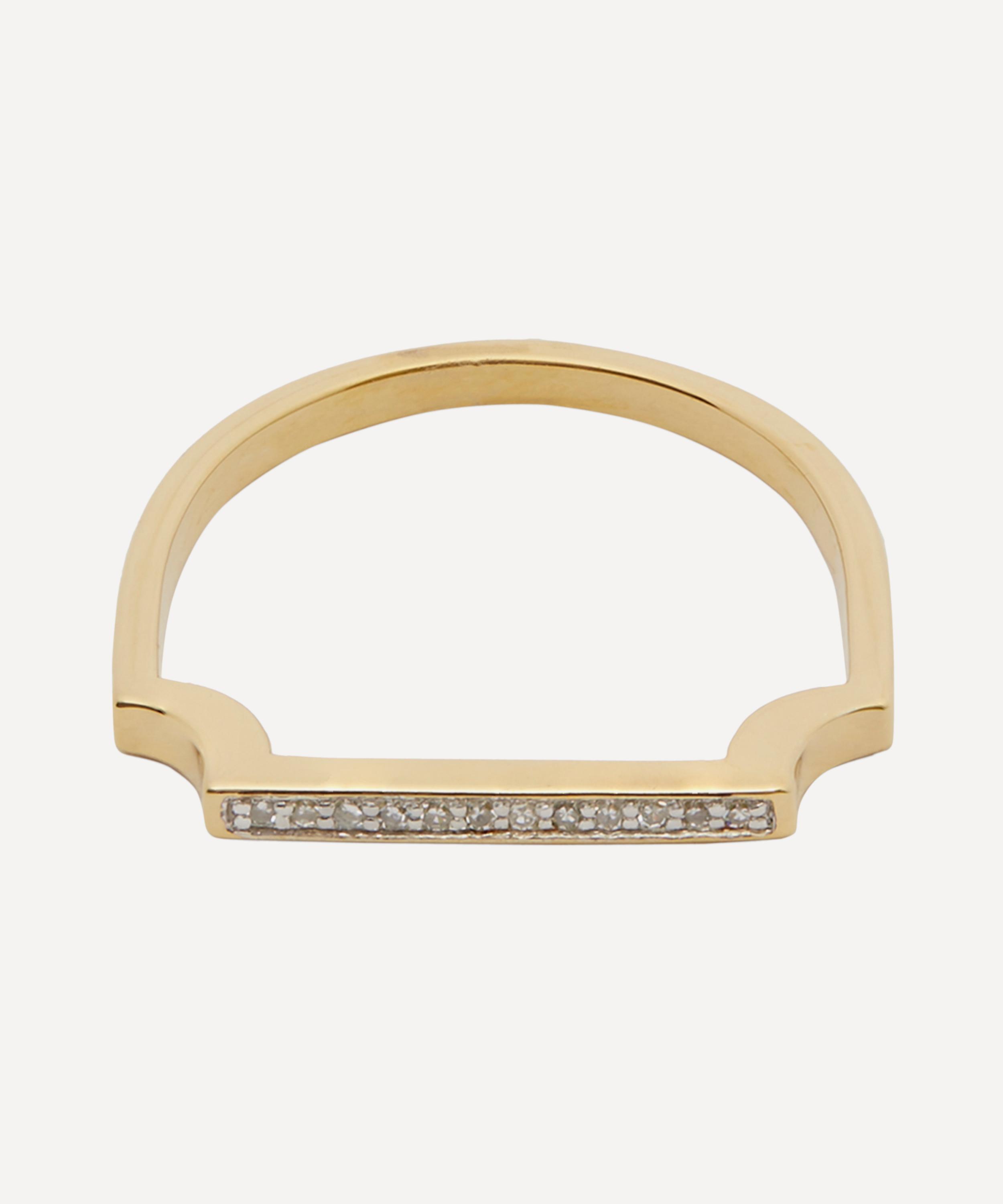 Combining strong clean lines with flowing curves, each piece in Monica Vinader's Signature collection is brimming with modernity and femininity. Crafted from polished 18 carat gold plated vermeil silver, this slim ring showcases an elegantly curved design, finished with a pavé white diamond-encrusted bar and inverted corners. Wear it alone as an everyday statement piece or style it as part of a careful curation of glittering bands.