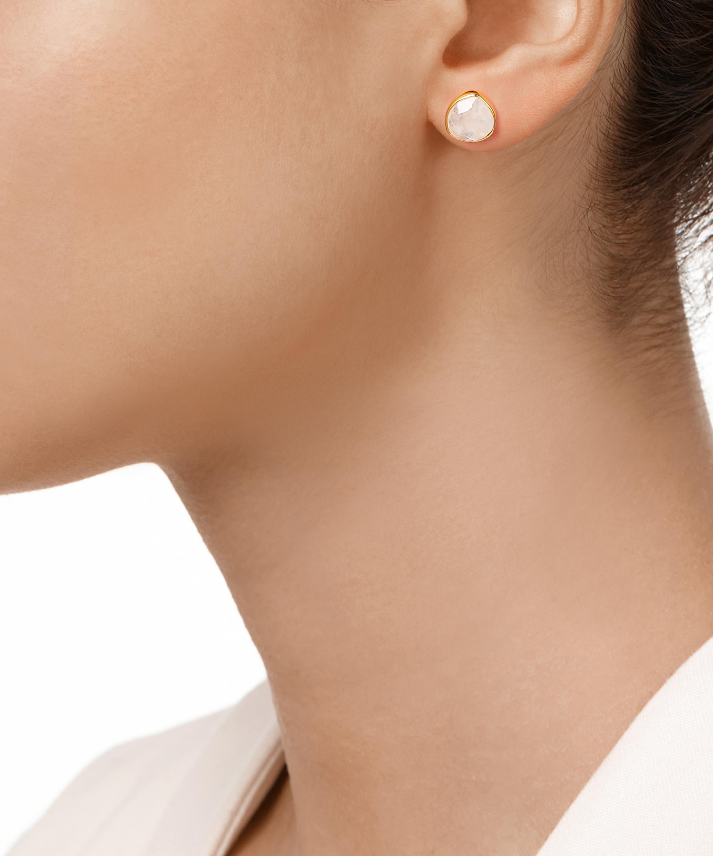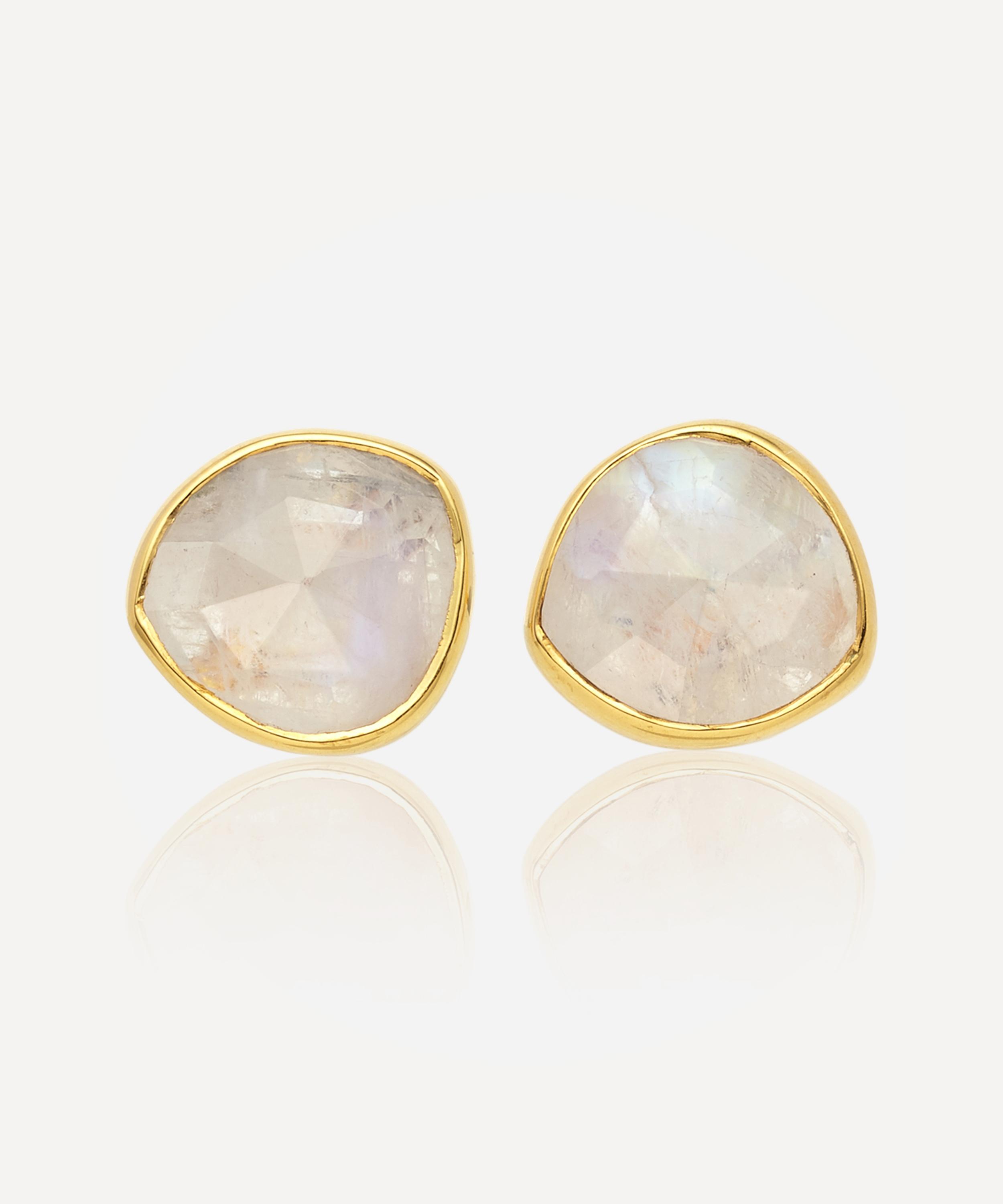 Crafted from high-polished 18 carat gold plated vermeil silver, these earrings are irregularly shaped with an organic aesthetic reminiscent of pebbles found on the seashore. Two rose cut, bezel set moonstones take centre stage for a subtle luminous glow. A bold yet beautifully simple statement pair, they look equally elegant whether worn alone or styled with other gemstone pieces from the collection and beyond.