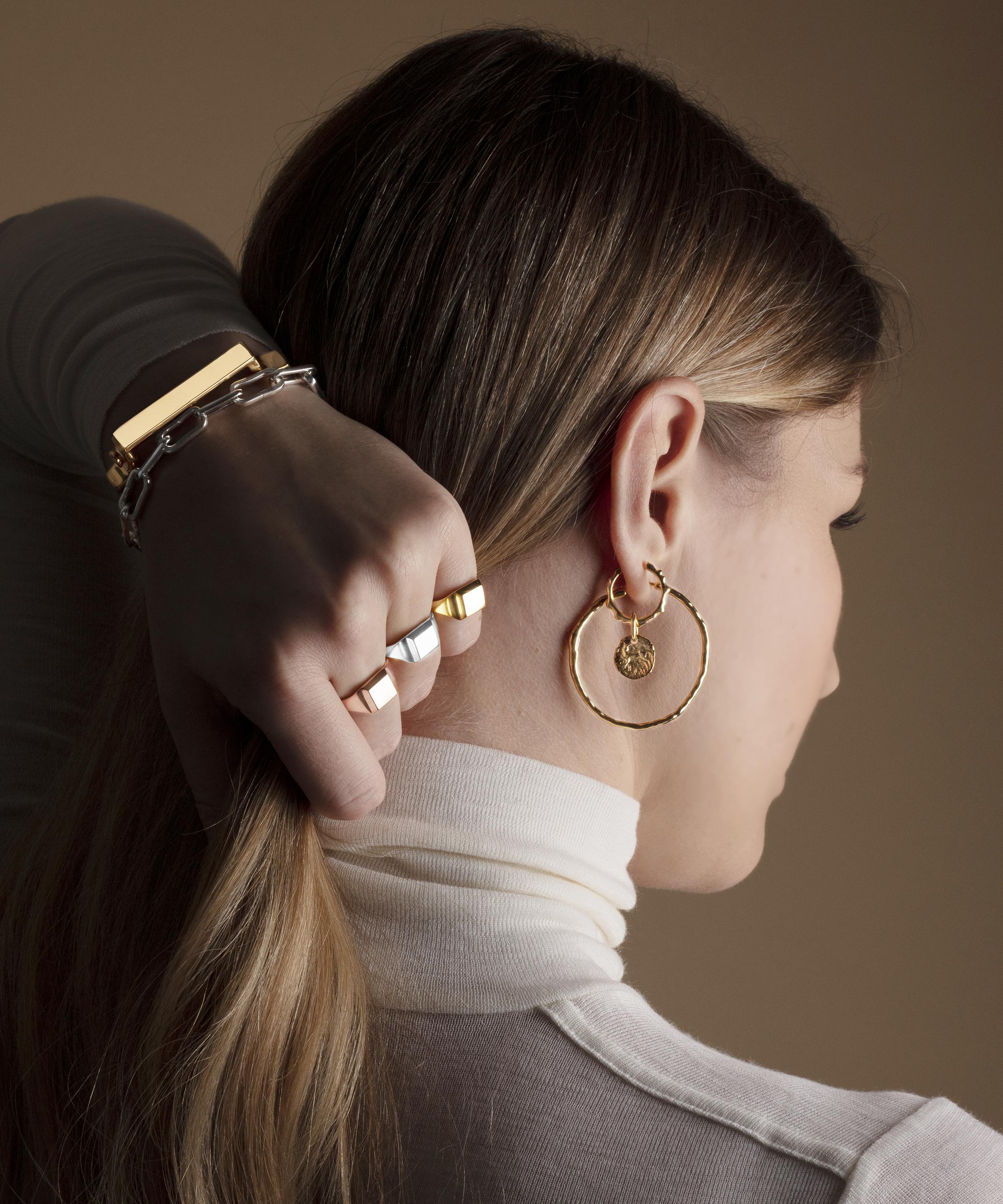 Perfect for stacking or styling alone, each of these slim hoop earrings showcases an organic, lightly hammered silhouette that's reminiscent of the sea. Designed with both style and versatility in mind, try layering them with a pair of smaller Muse hoops or add a personalised touch with a bespoke selection of the designer's signature pendant charms.