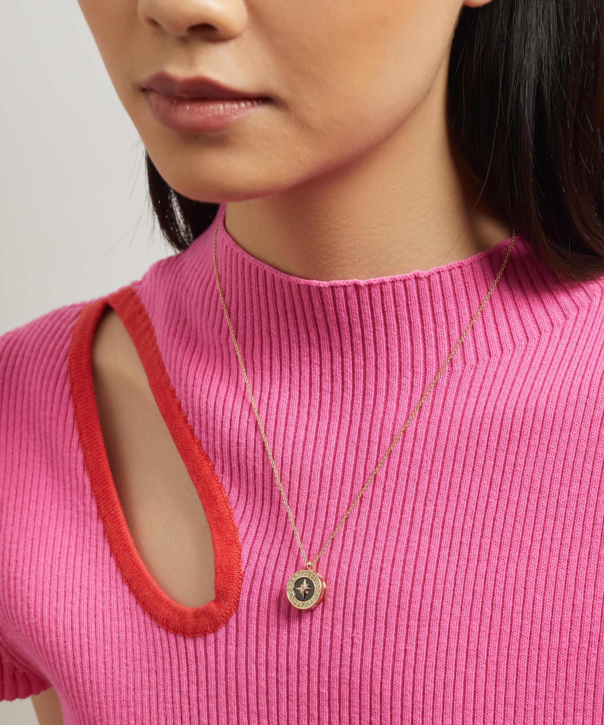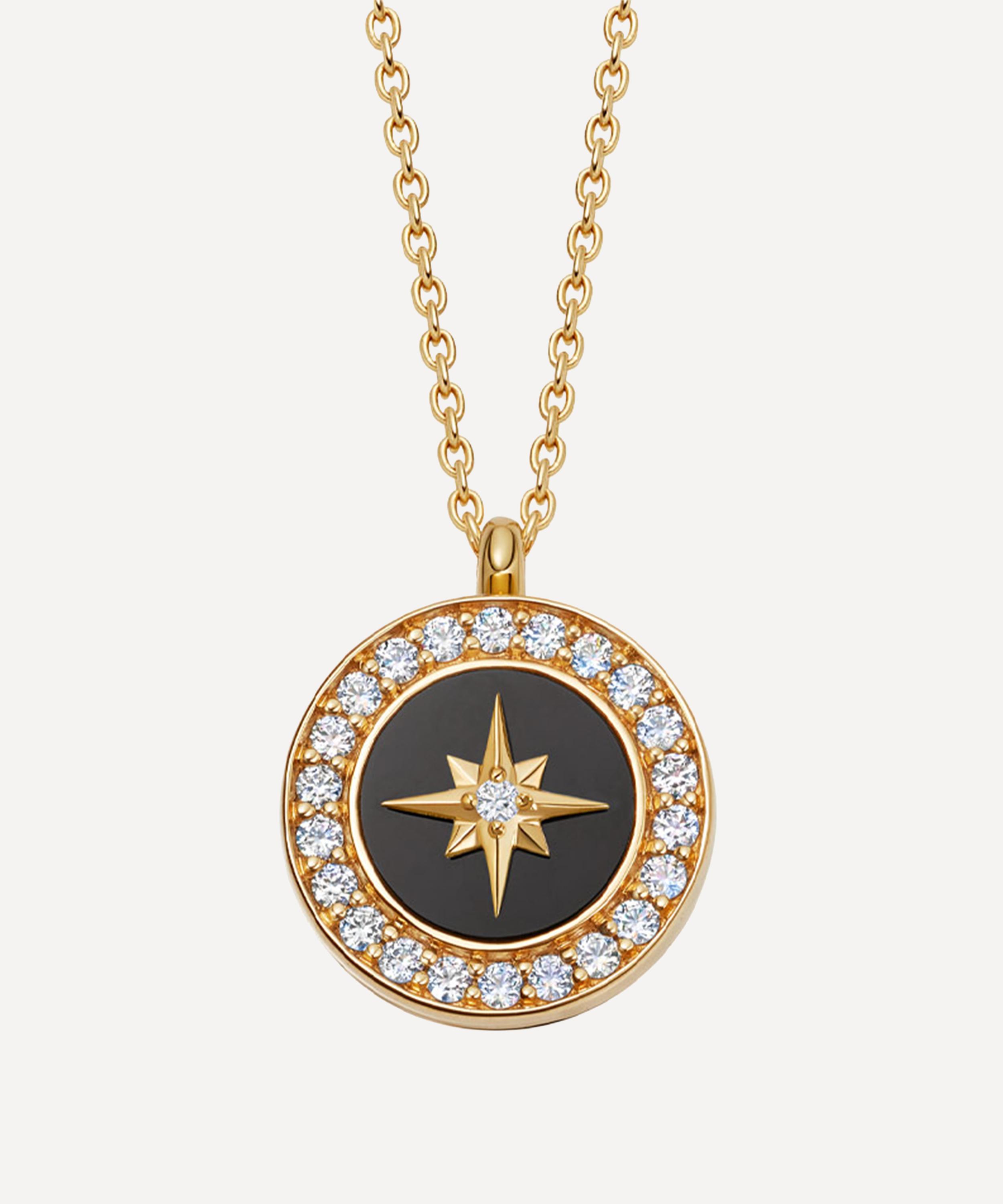 Inspired by the beauty of the North Star, this necklace features a small round locket pendant detailed with a central sapphire set star motif surrounded by black onyx and encircled with glittering white sapphires. Perfect for gifting or adding to your own jewellery line-up, it can be worn alone, layered with other chains or styled with several coordinating pieces from the collection for a bold, contemporary take on a classic celestial motif.