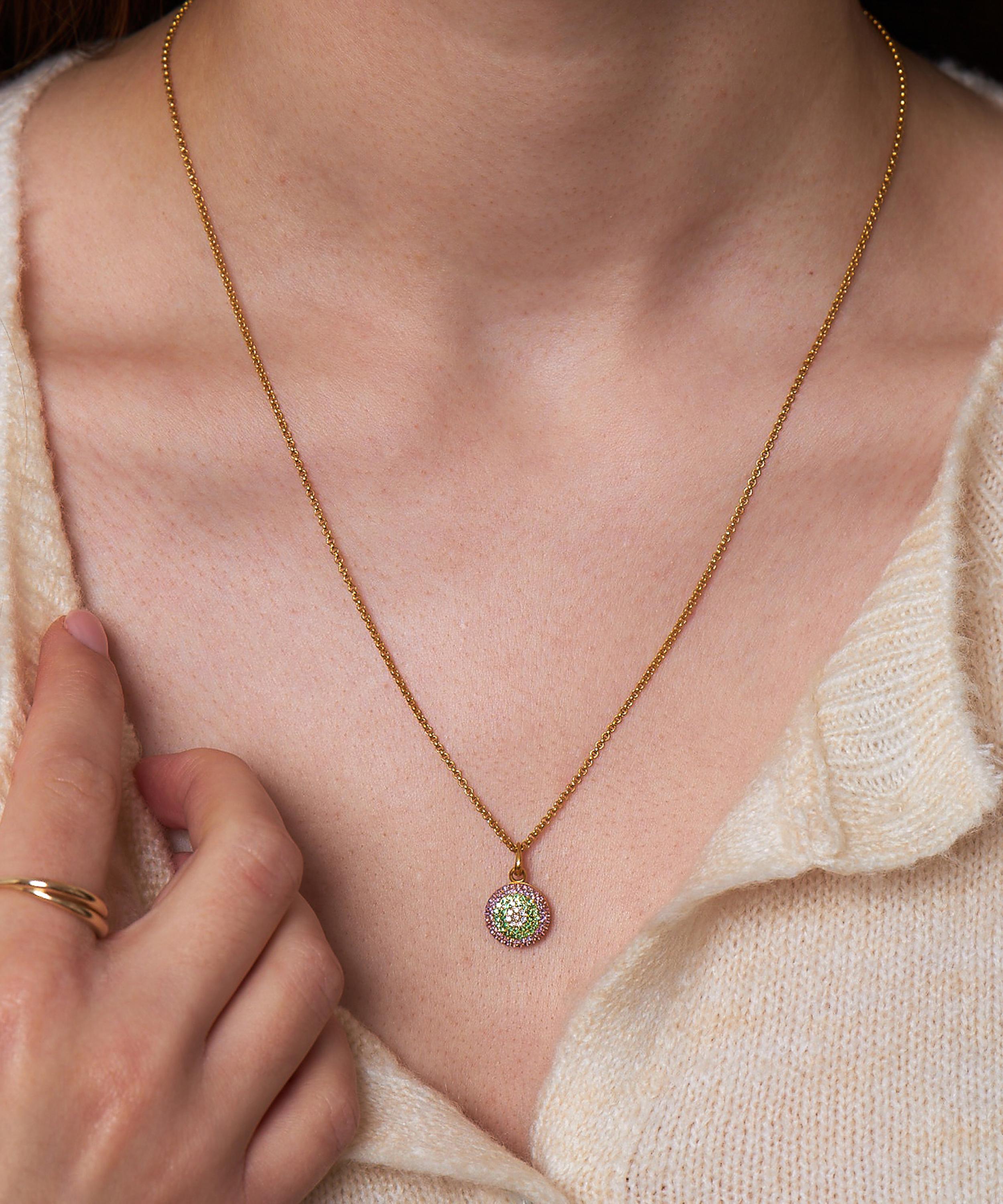 For this capsule collection, Dinny Hall drew inspiration from the array of Suffragette jewellery that was produced and worn by supporters of the movement over 100 years ago. This round button locket captures the three symbolic Suffragette colours with three rings of glittering pavé gemstones - violet amethyst for dignity, green tsavorite for hope and white diamond for purity. Suspended from a fine rolo chain, it's finished with an engraved 'Take Courage' quote on the inside as a wearable reminder of this pivotal moment in history.