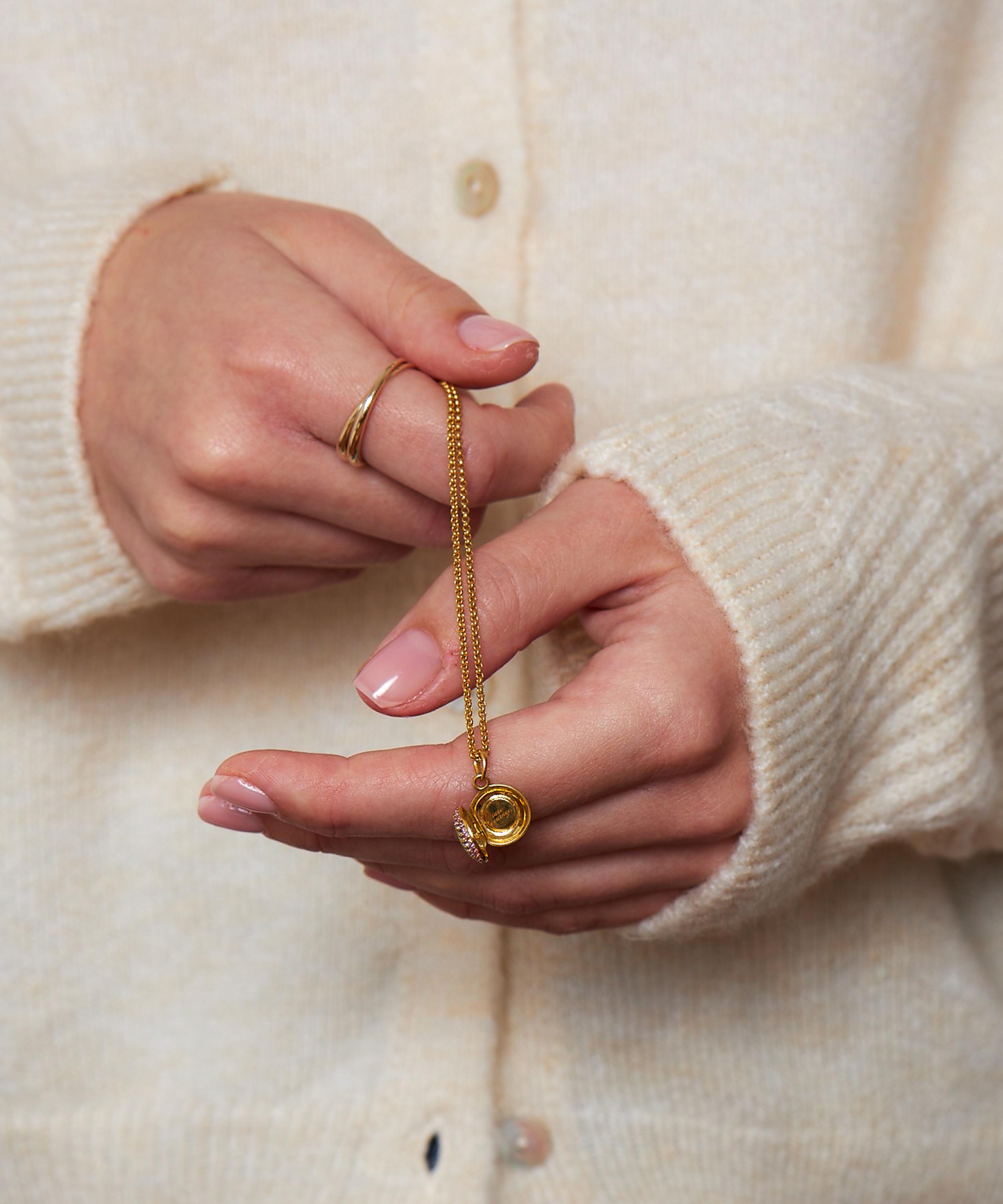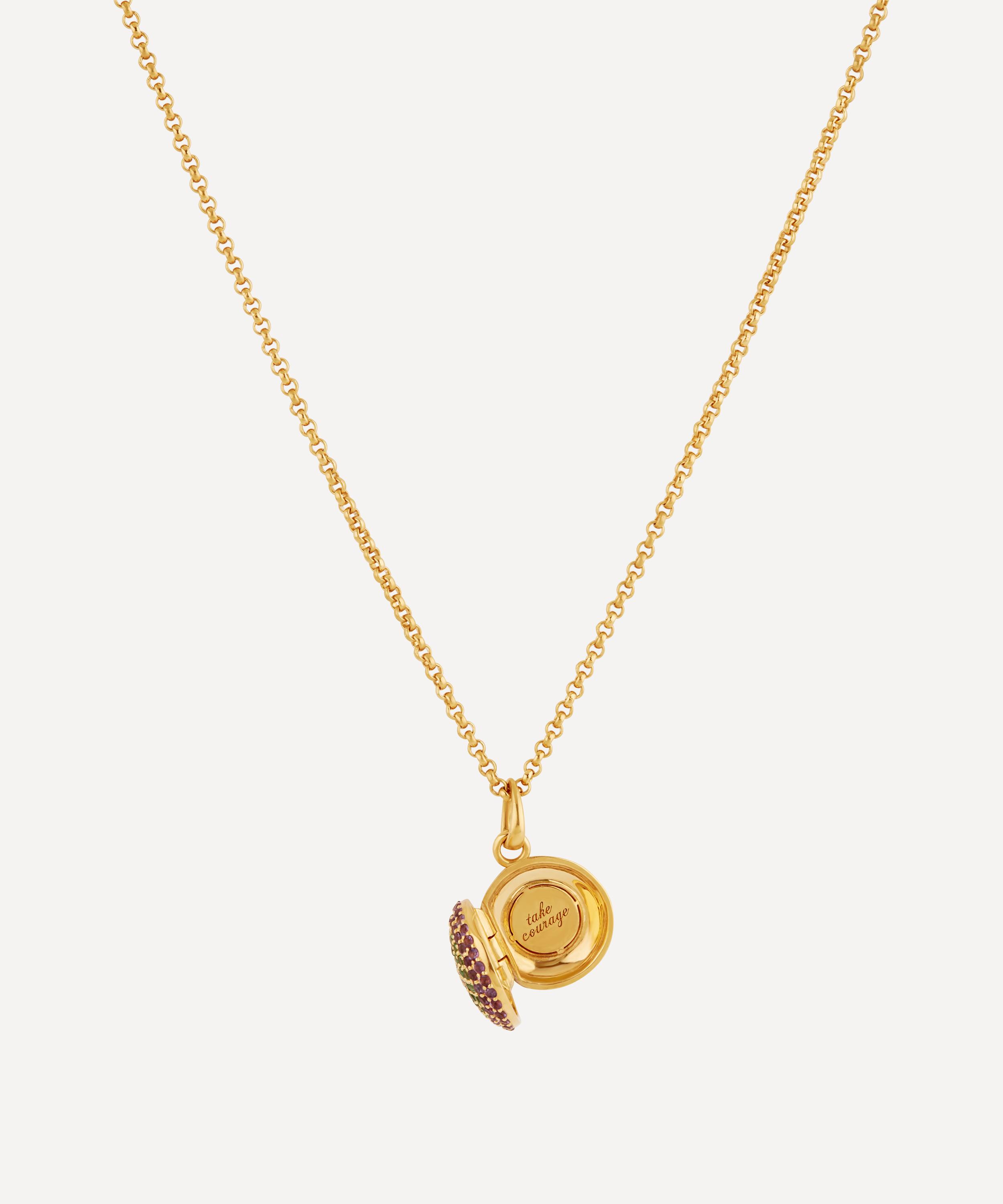 Crafted from sterling silver plated in 22 carat gold vermeil, this pavé gemstone locket necklace is from Dinny Hall's Suffragette collection, designed to celebrate and honour the fight for women’s suffrage.