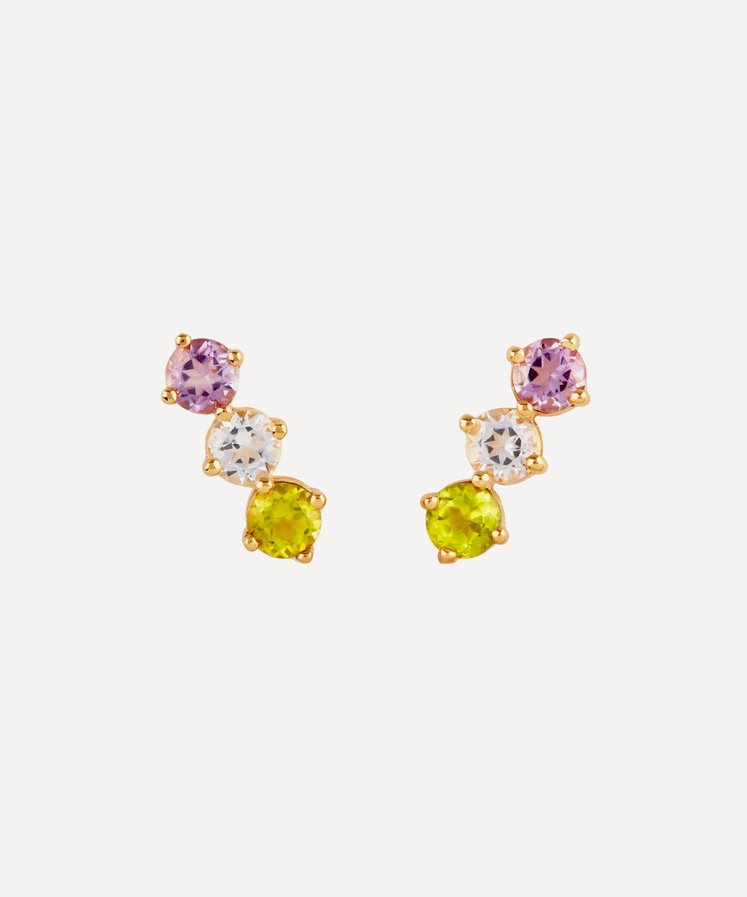 These gold plated vermeil silver bar stud earrings from Dinny Hall feature a three-stone gem drop of amethyst, white topaz and peridot, designed to celebrate and honour the Suffragette movement.
