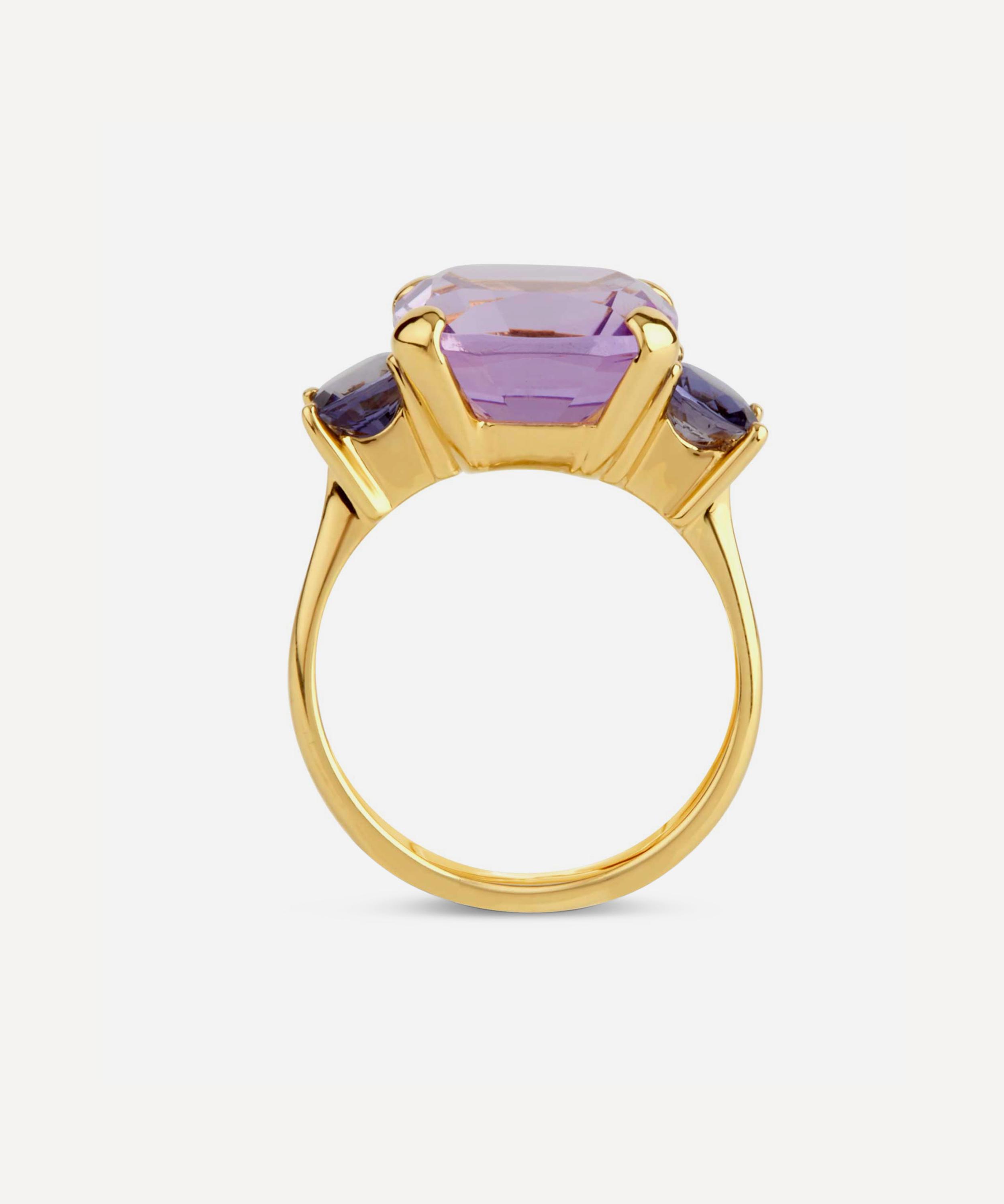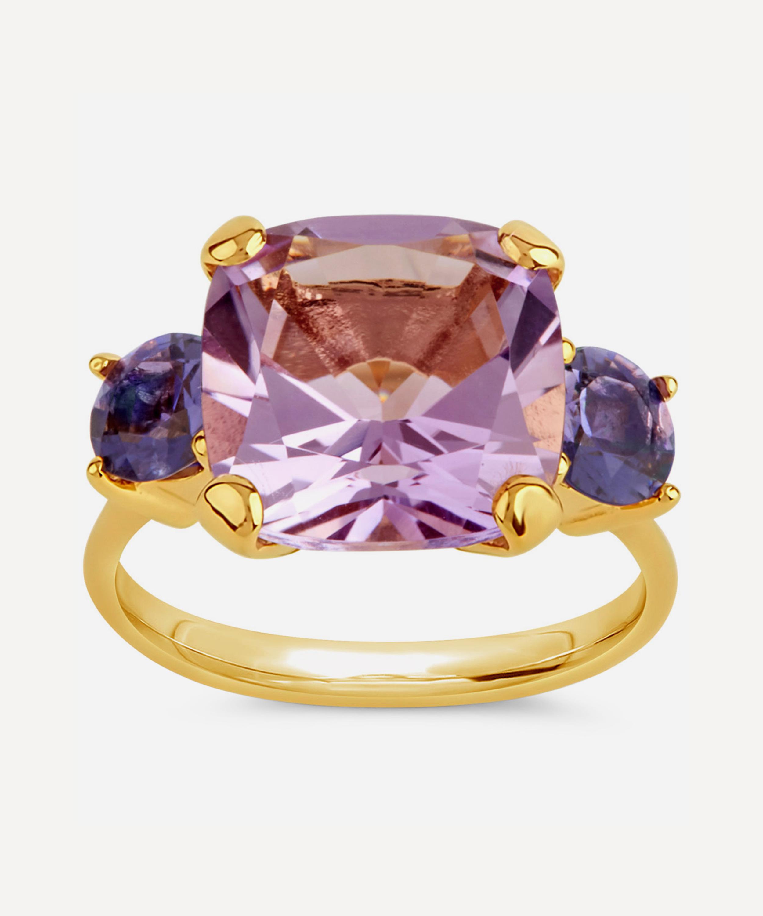 Exemplifying the designer's passion for coloured gems, this statement ring showcases a cushion cut, pale pink-purple amethyst, flanked by two round cut purple iolite stones in a classic trilogy arrangement. The perfect starting point to a show-stopping curation of stacked rings and glittering gems, this piece will bring an impressive burst of colour to any special occasion look.