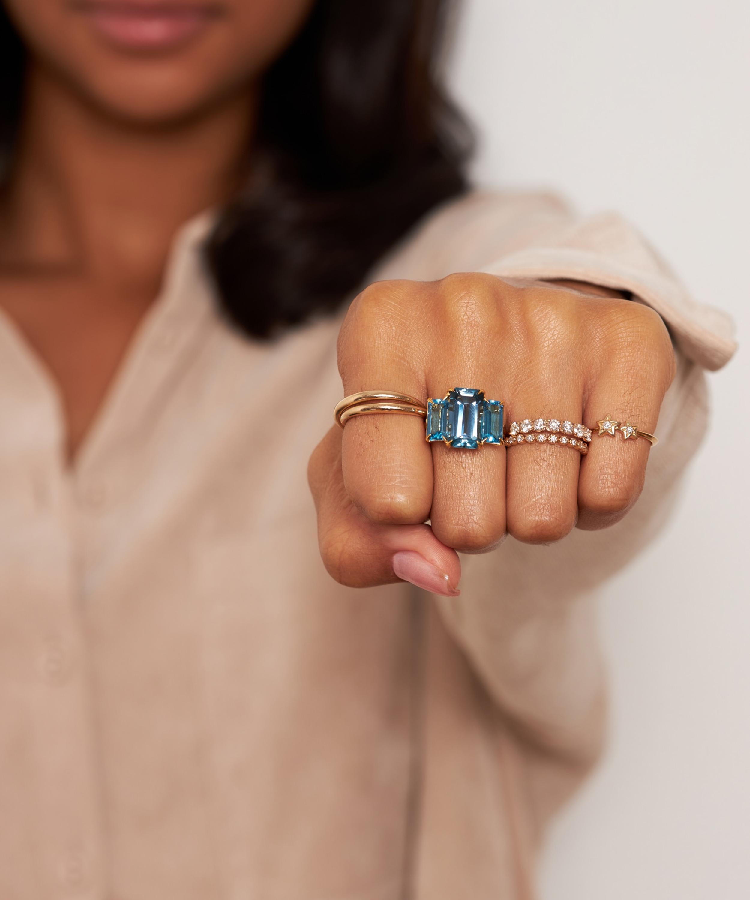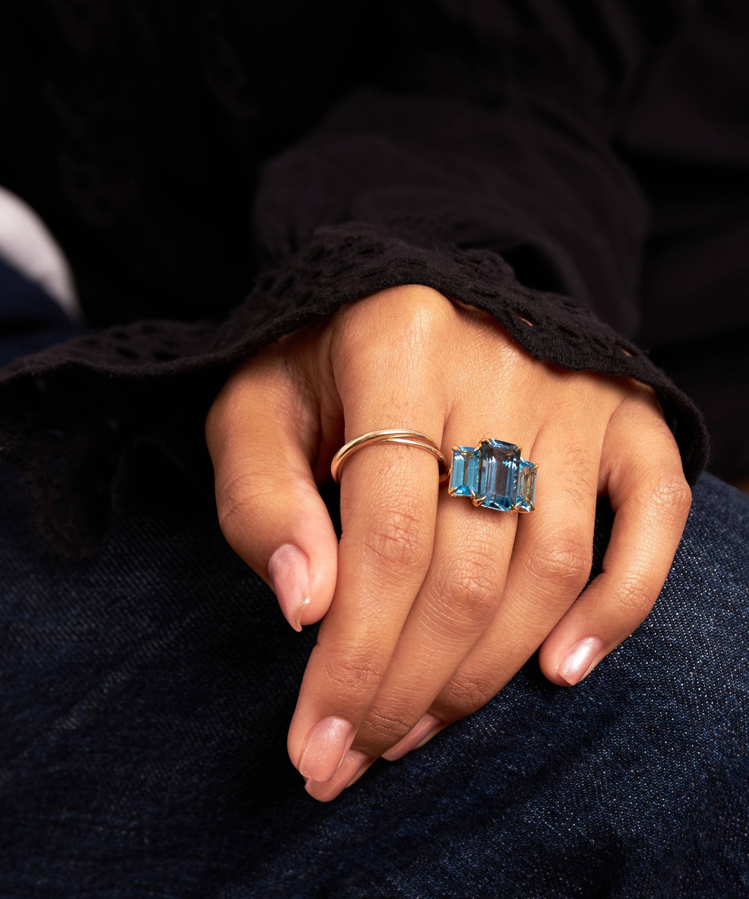 Exemplifying the designer's passion for coloured gems, this statement ring features an emerald cut London blue topaz flanked by two baguette cut Swiss blue topaz stones in a classic trilogy arrangement. The perfect starting point to a show-stopping curation of stacked rings and glittering gems, this piece will bring an impressive burst of colour to any special occasion look.