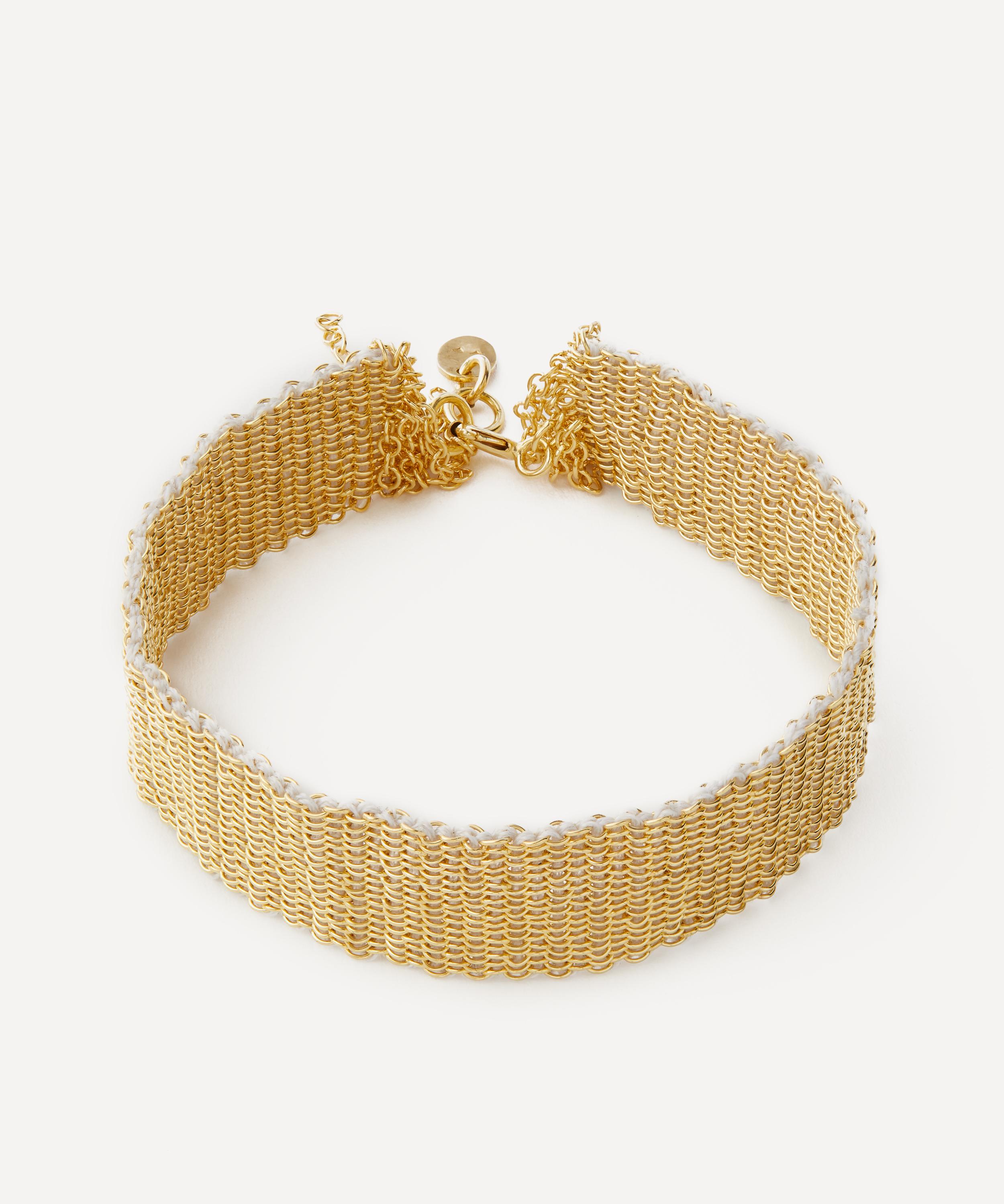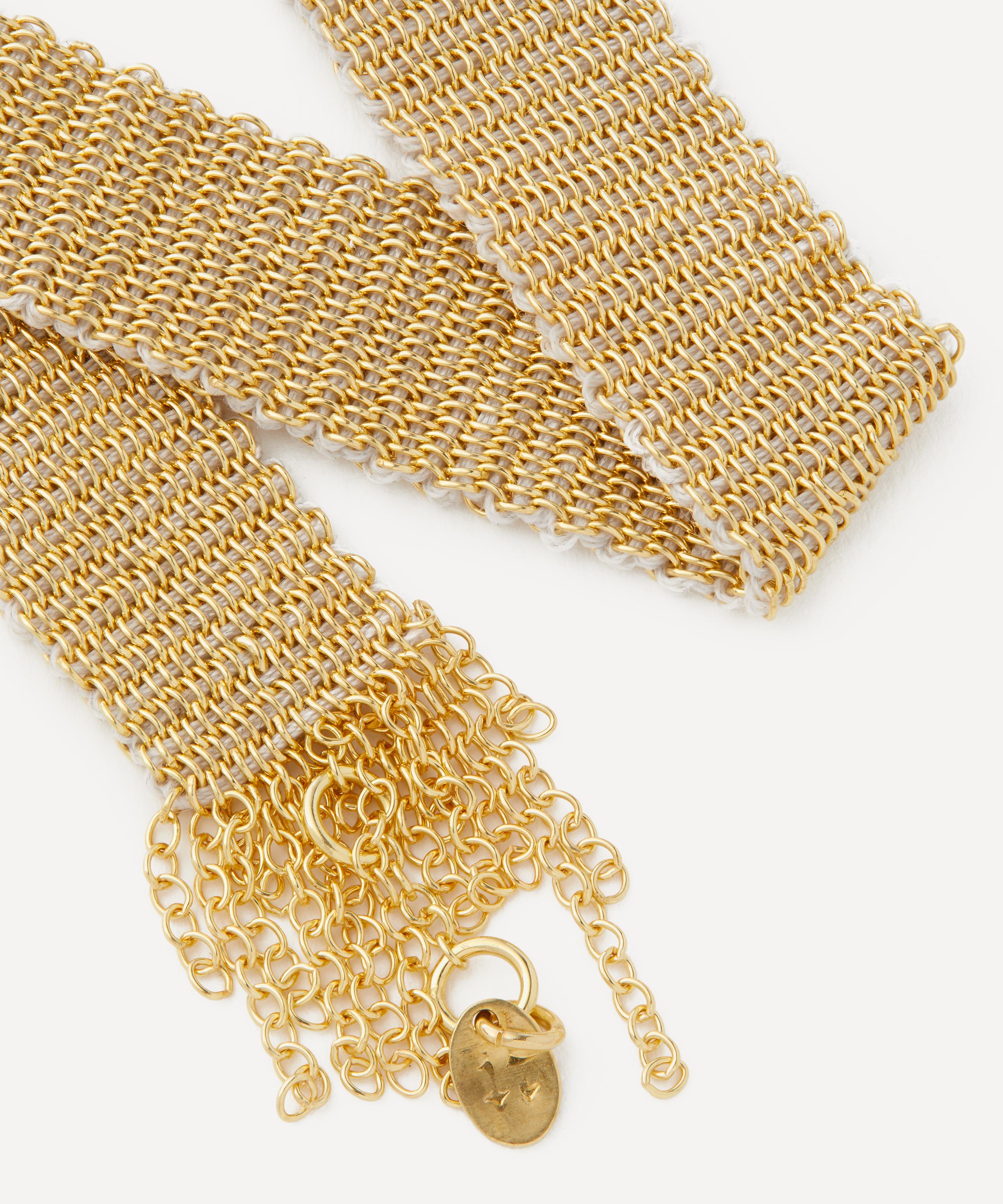 Boasting an edgy addition to your edit, this bracelet by Stephanie Schneider showcases the designer’s distinctive chainwork. A cluster of fine trace chains made from silver plated in gold vermeil are threaded together to create a wide chainmail design with fringed ends. Drawing on the designer’s textile background, it’s interwoven with silk. Wear it alone, or pair it with one of the brand’s coordinating necklaces and earrings.