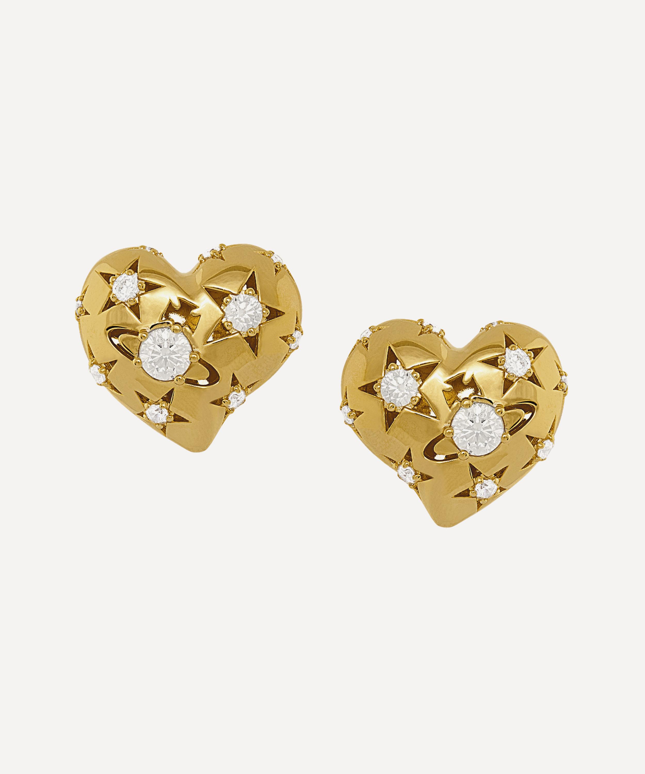 Channelling the brand’s rebellious spirit and individuality, each earring is crafted from gold-tone brass, featuring a puffy, heart-shaped design adorned with a cut-out orb and stars motifs set with cubic zirconia. Wear these statement-making earrings on their own, incorporate them into a stack, or pair with matching pieces from the brand for a co-ordinating look.