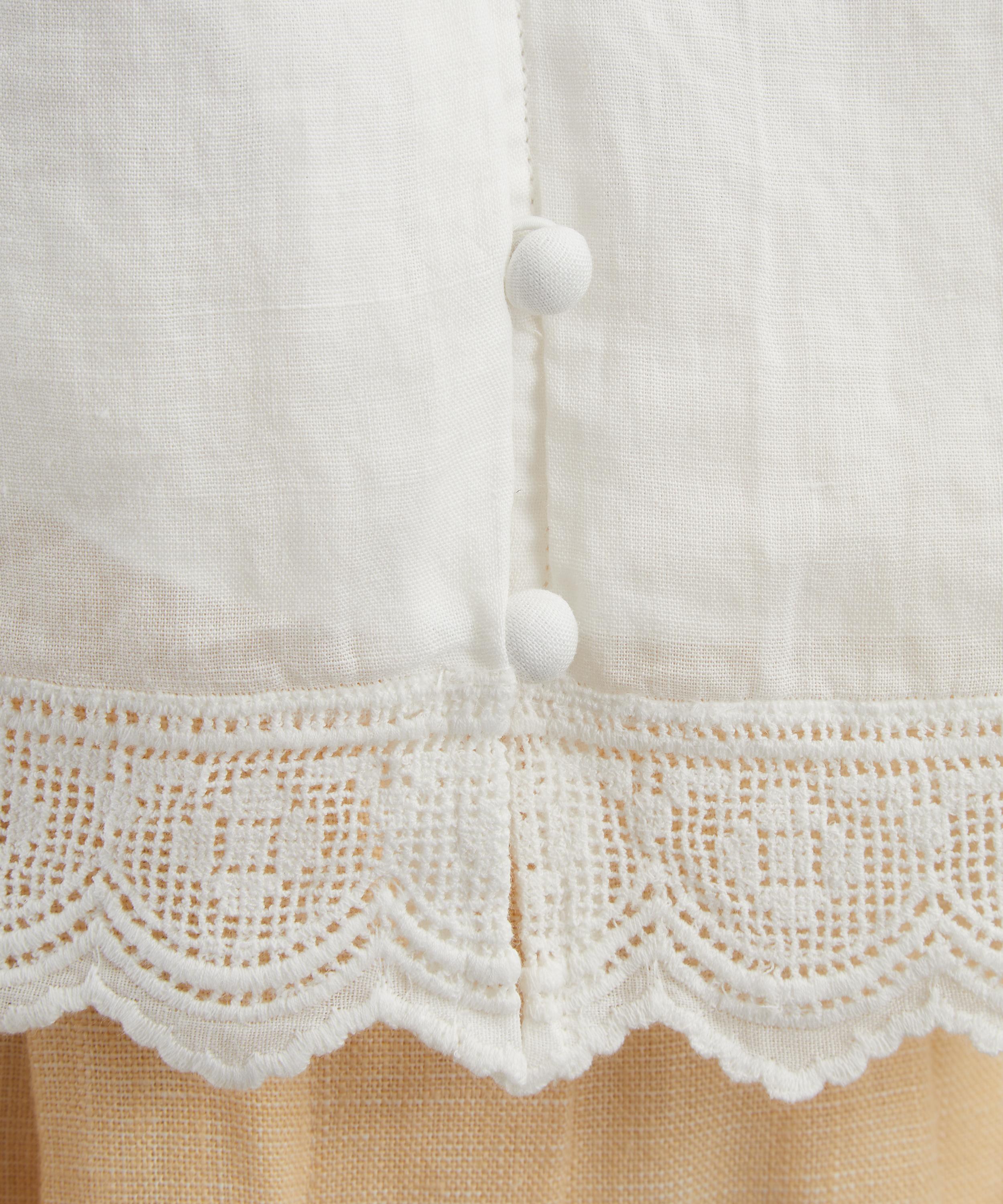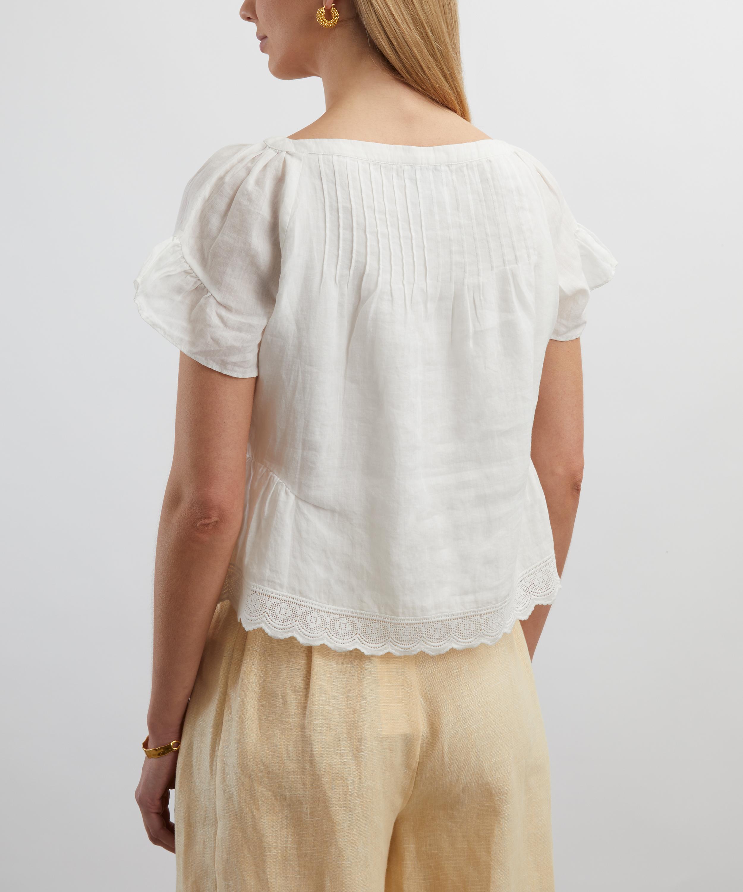 Crafted from lightweight ramie, the antique-inspired Grace Blouse features an elegant high neckline framed by clustered pintucks and soft flutter sleeves. A row of petite buttons runs down the front, leading to a floaty hem finished with a scalloped lace trim for a timeless, feminine touch.