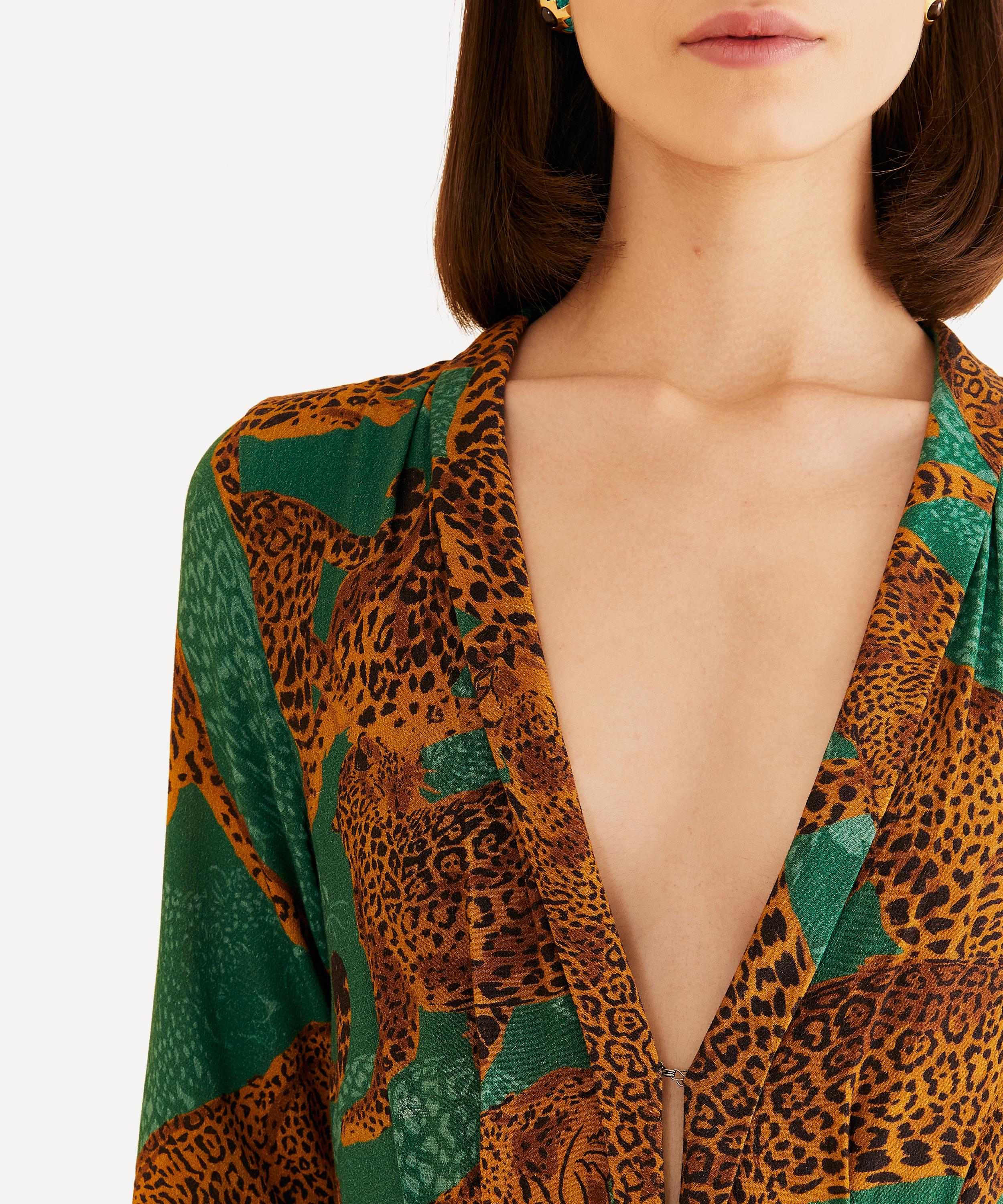 Adorned all-over in the eclectic Green Artsy Leopards print, this statement maxi-dress is defined by its plunging V-neckline. Ideal for winter with its long, fitted sleeves, its flowy skirt falls to a flowy, ankle-grazing hem.