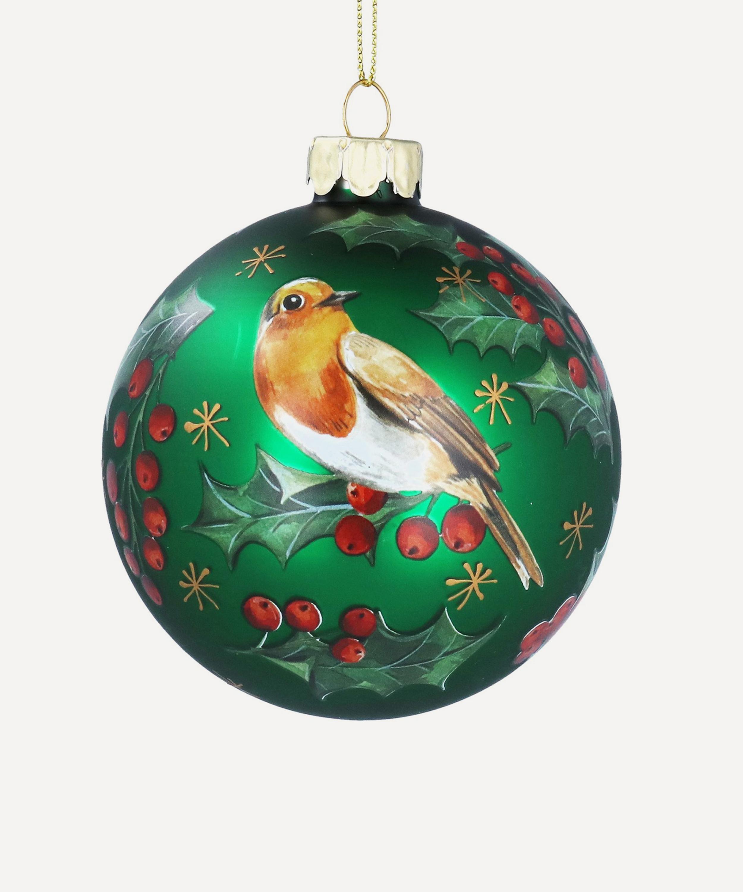 Green Robin and Holly Glass Bauble