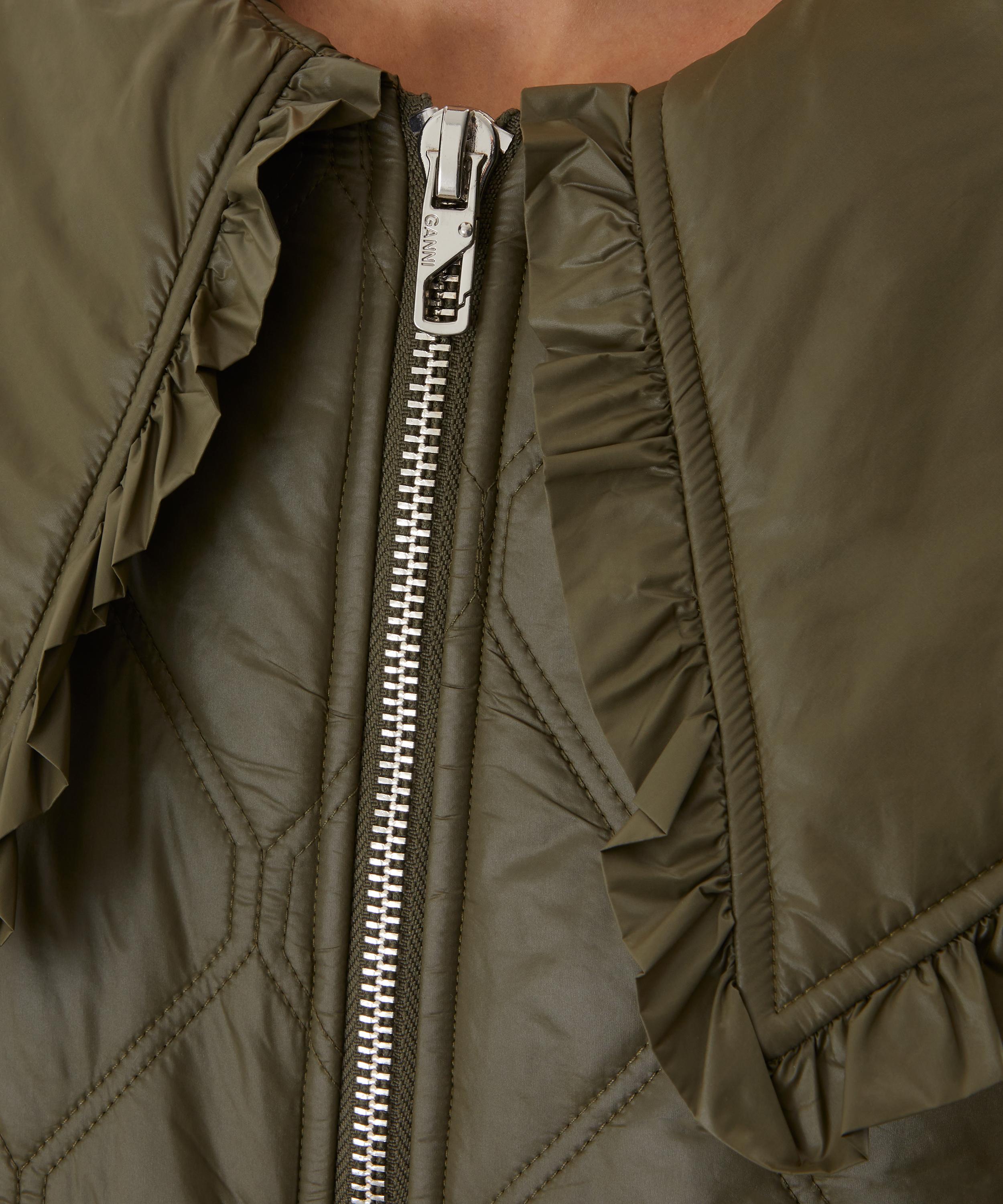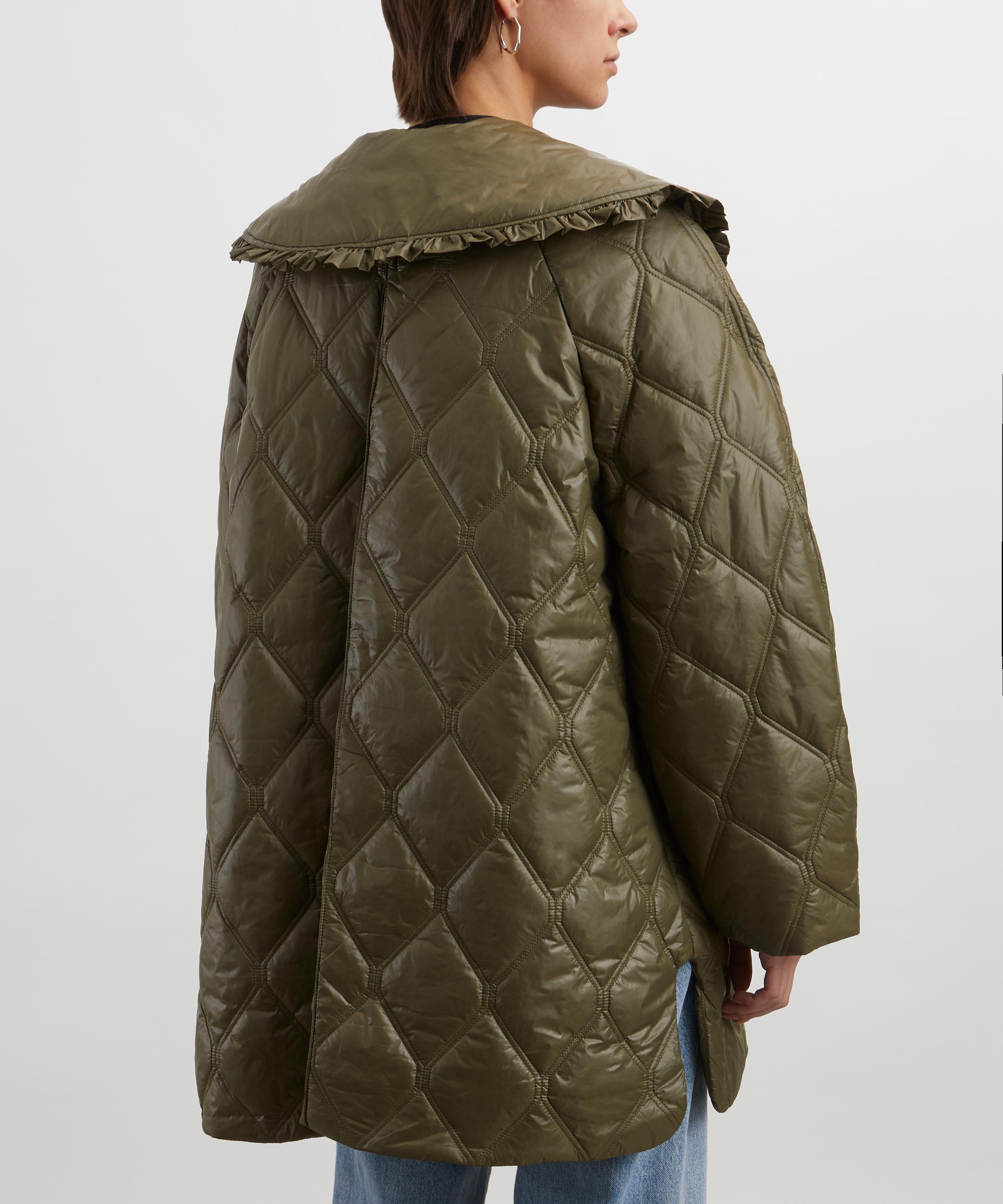 Crafted from a shiny olive technical fabric, this quilted jacket features a ruffled oversized collar, adding a delicate, feminine touch. Designed for a relaxed fit, it includes a zip closure, two large patch pockets, and a hood for extra protection and warmth.