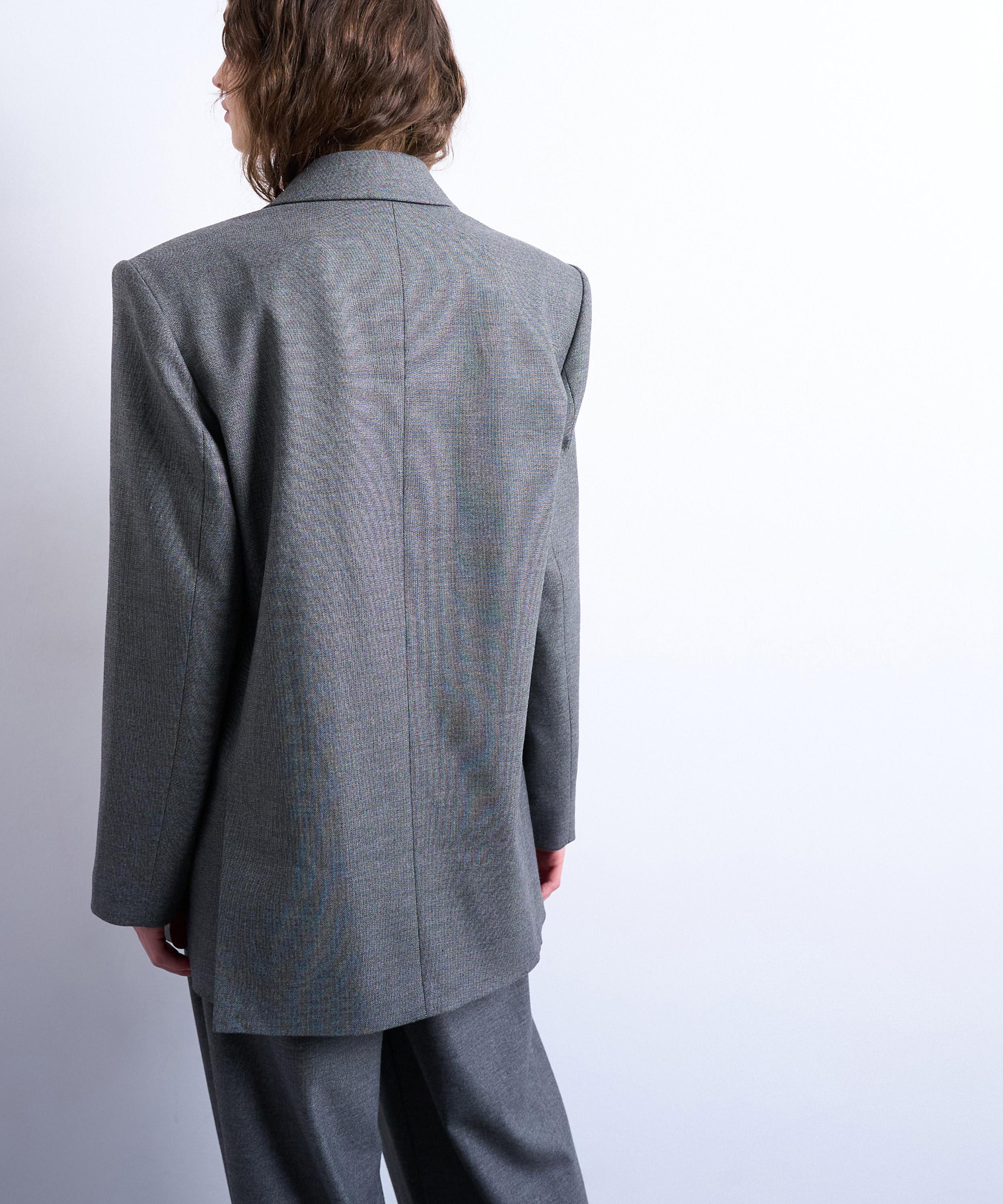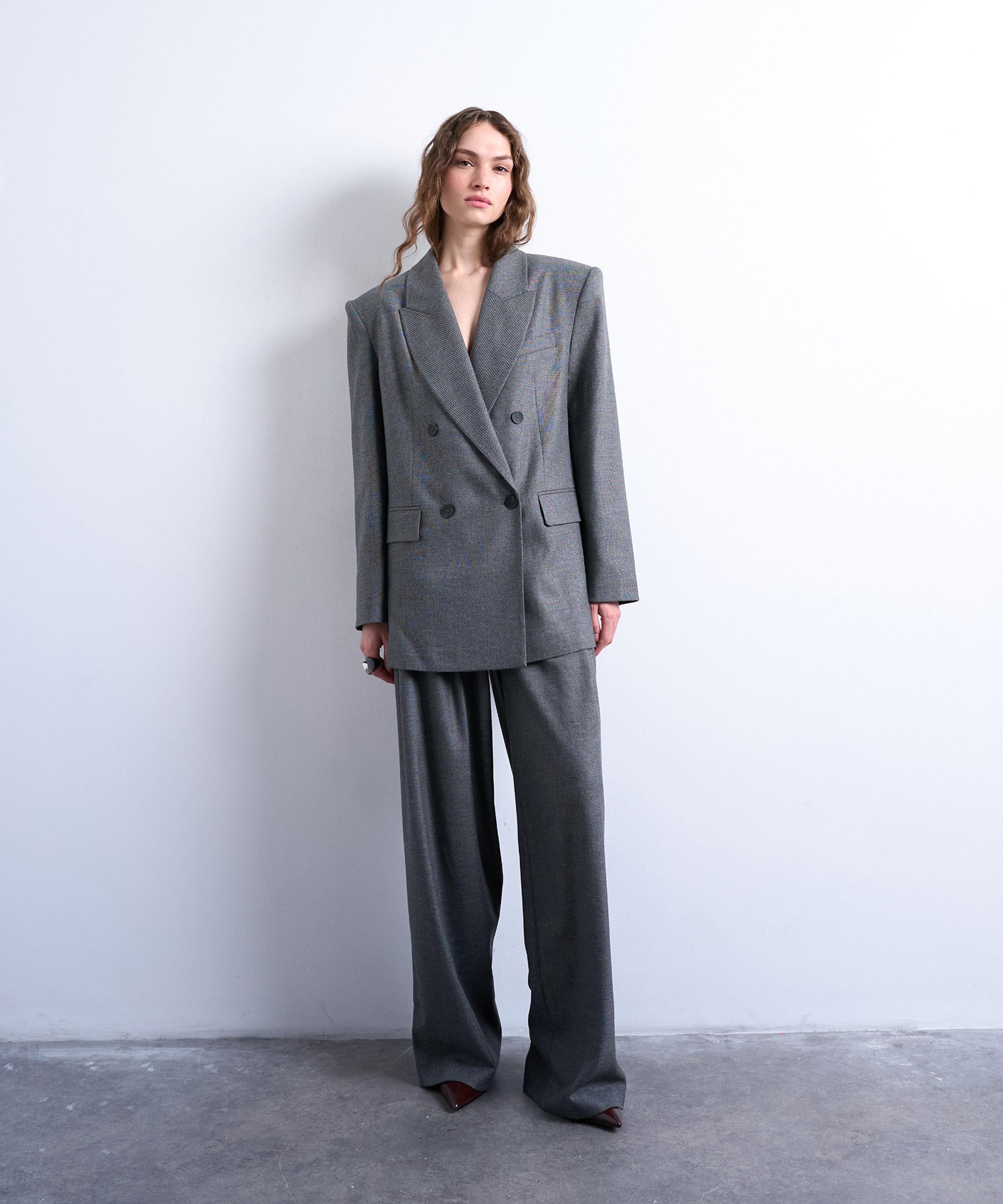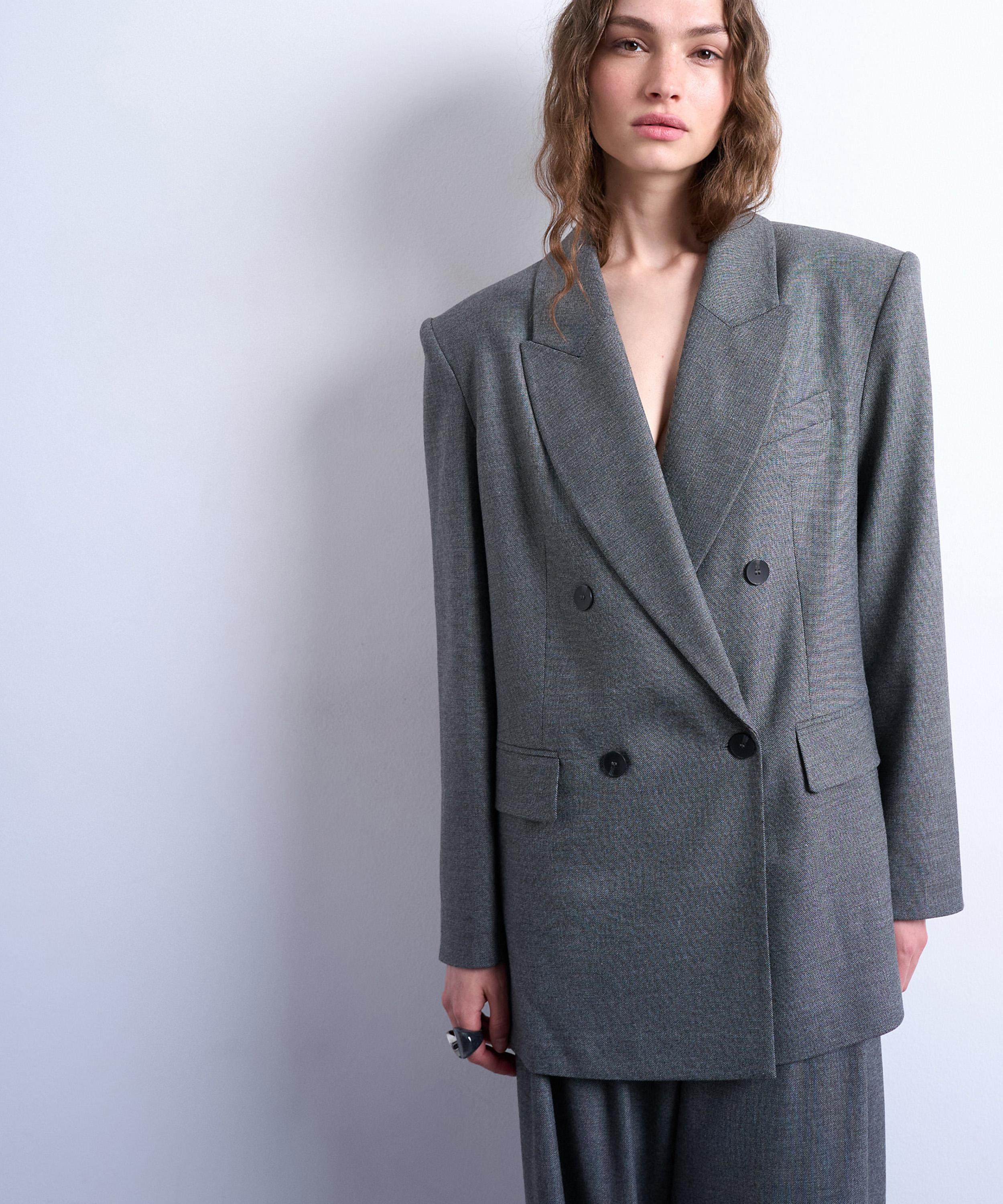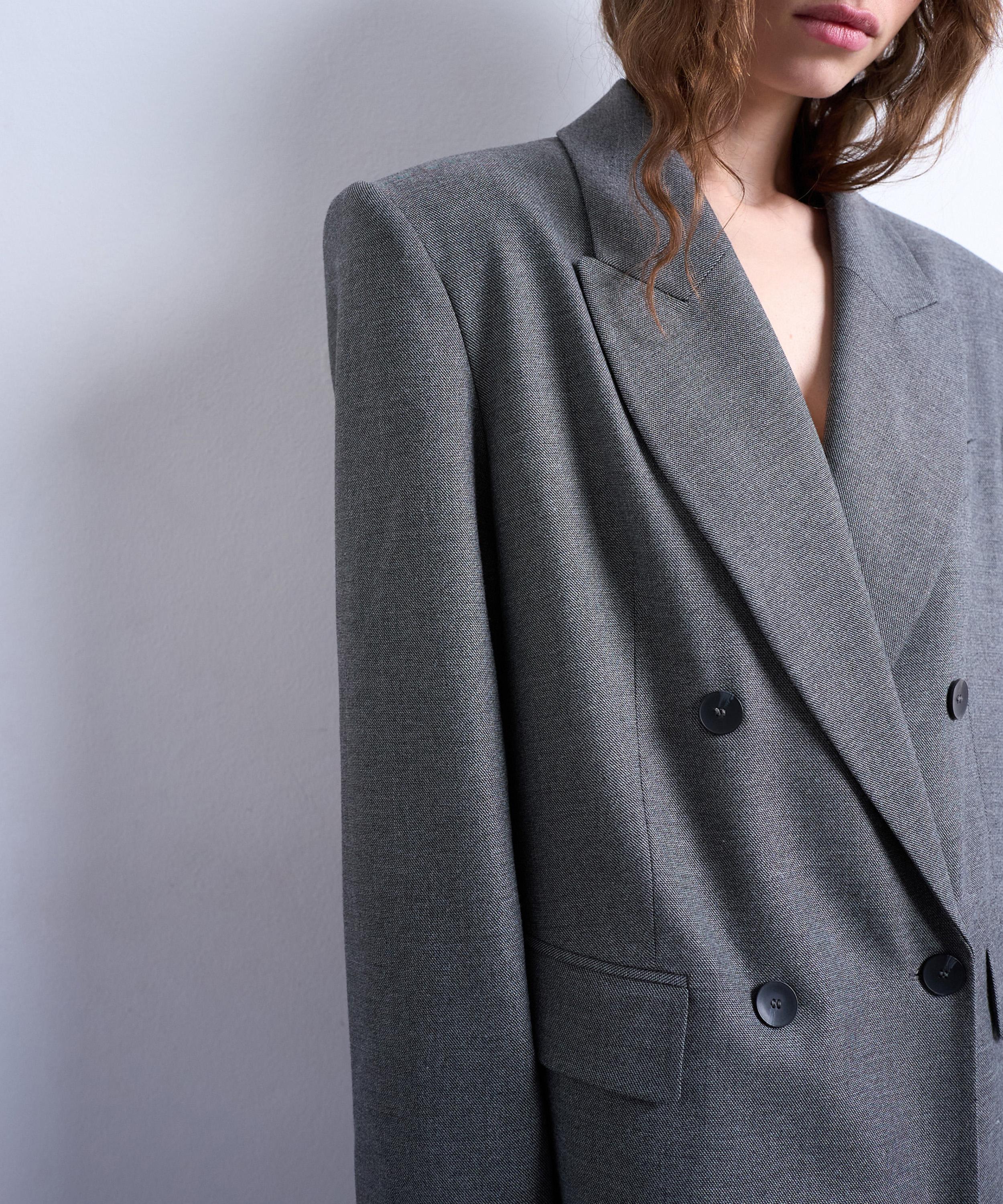 Crafted from textured woven fabric, this blazer channels ‘80s-inspired style with its oversized, double-breasted silhouette, featuring boxy padded shoulders and sharp peak lapels for a bold, tailored look.