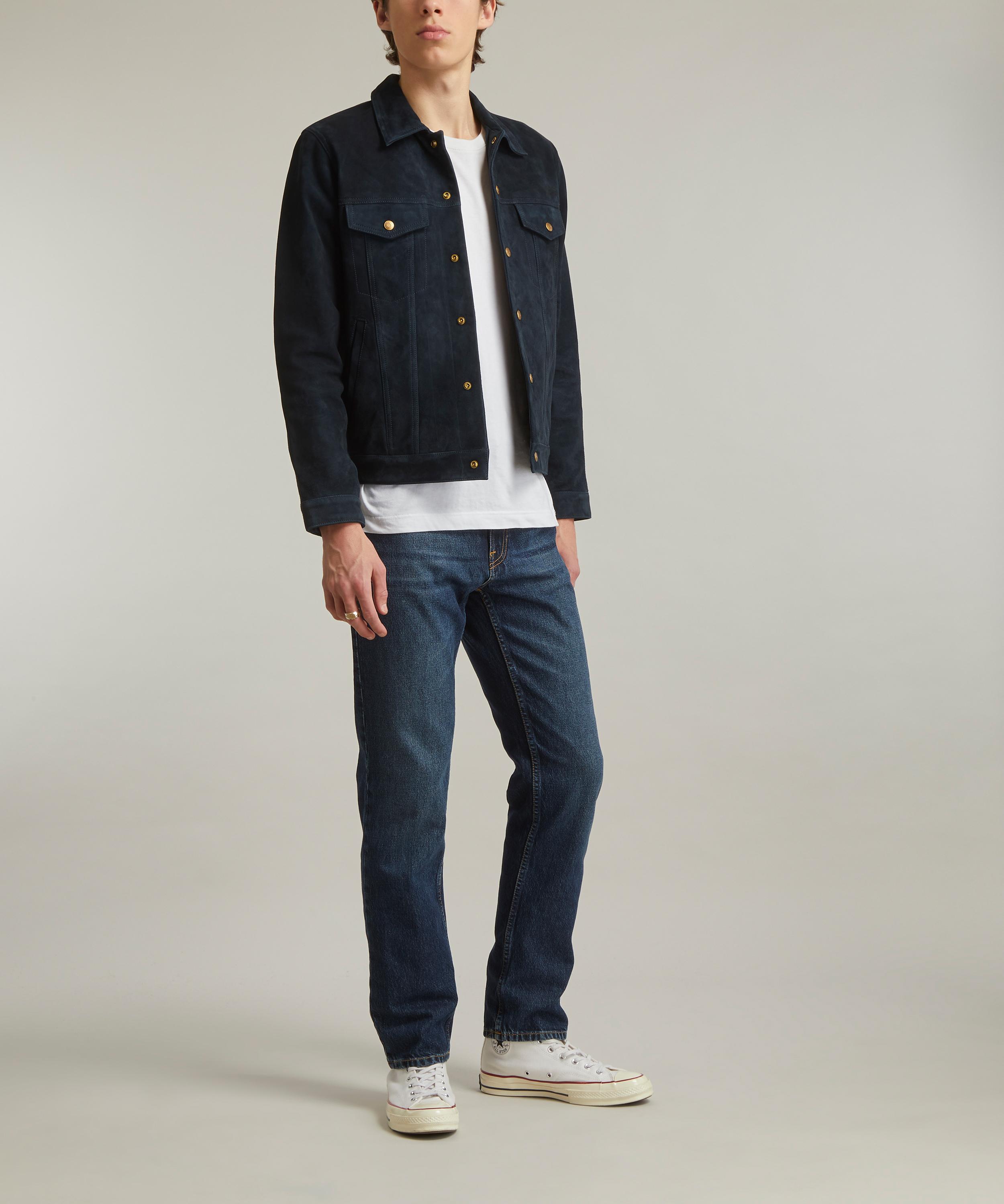 Cut from 14.9 oz. rigid denim, these dark blue jeans have a classic straight leg complete with subtle wear and an abraded, marbled texture that reveals an impressive ray of indigo hues and muted bright-blue highlights for an authentic, lived-in look.