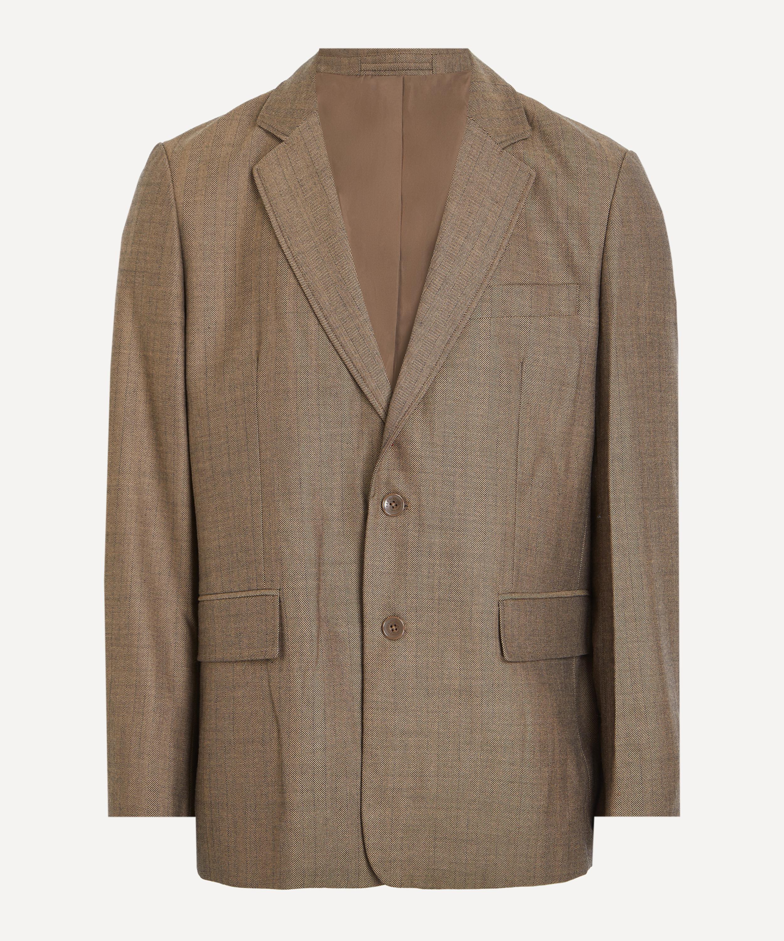 Crafted from a wool-blend herringbone, it features a relaxed single-breasted silhouette with a notch collar, two-button front closure, and multiple interior and exterior pockets. Pair with the matching trousers for a sleek, coordinated look.