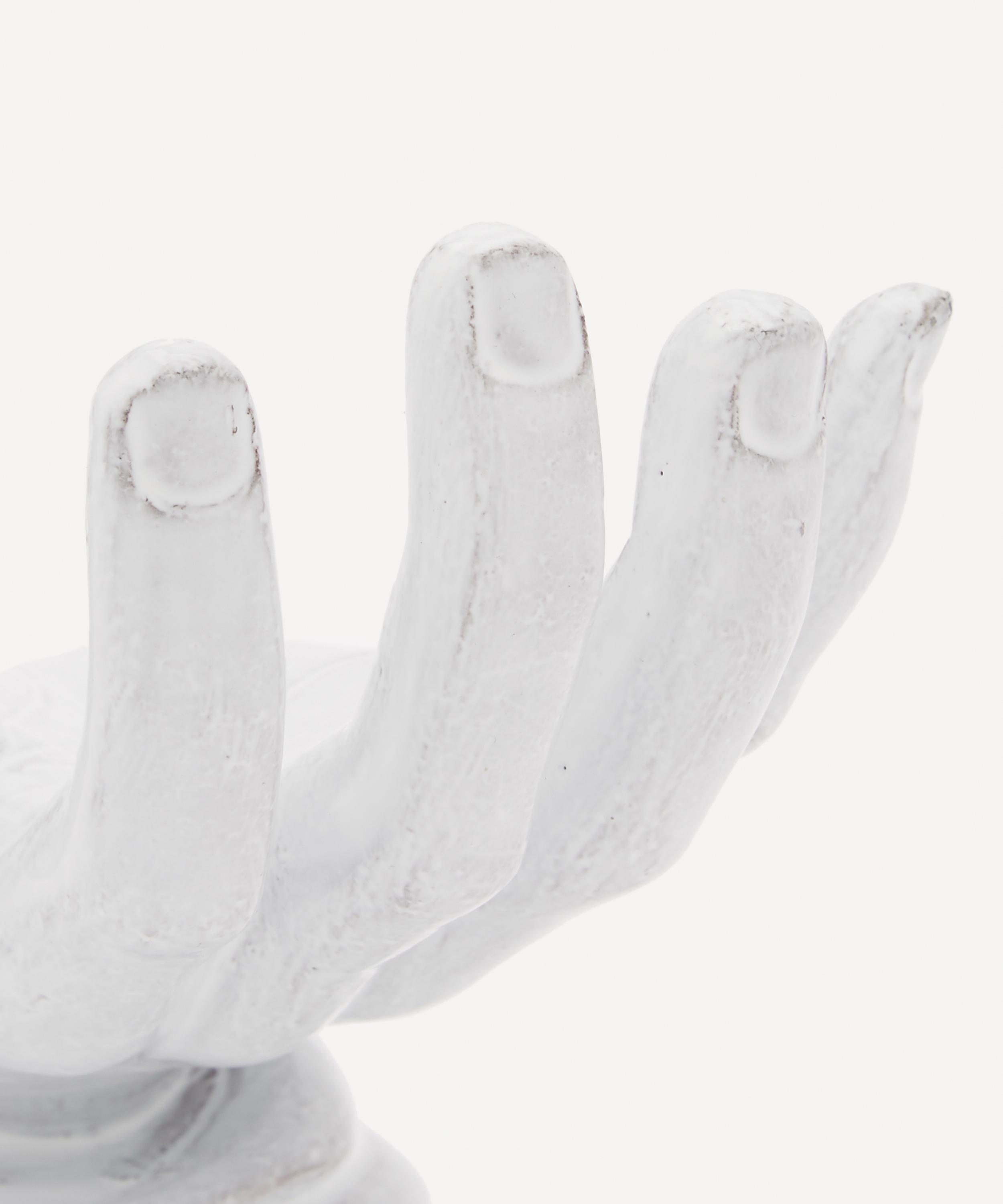 Votary of pre-industrial fabrication, Astier de Villatte is celebrated for being the one and only studio in Paris to hold and harbour the traditions of artisanal ceramic production. Restoring the ancestral systems of moulding and stamping, this stand is made using techniques from the Middle Ages which involve moulding a sheet of handmade clay, double firing the ‘biscuit’ piece and glazing the product in white enamel – a lengthy process that requires a drying time of up to one month. Sculpted into the shape of a hand, the stand is finished with the brand’s signature crest – depicting an interlacing A & V – engraved alongside the initials of one of the 40 master artisans who created it. Each handmade piece tells a beautiful story; use this candle stand to give your interiors scheme an irresistible sense of nostalgia.