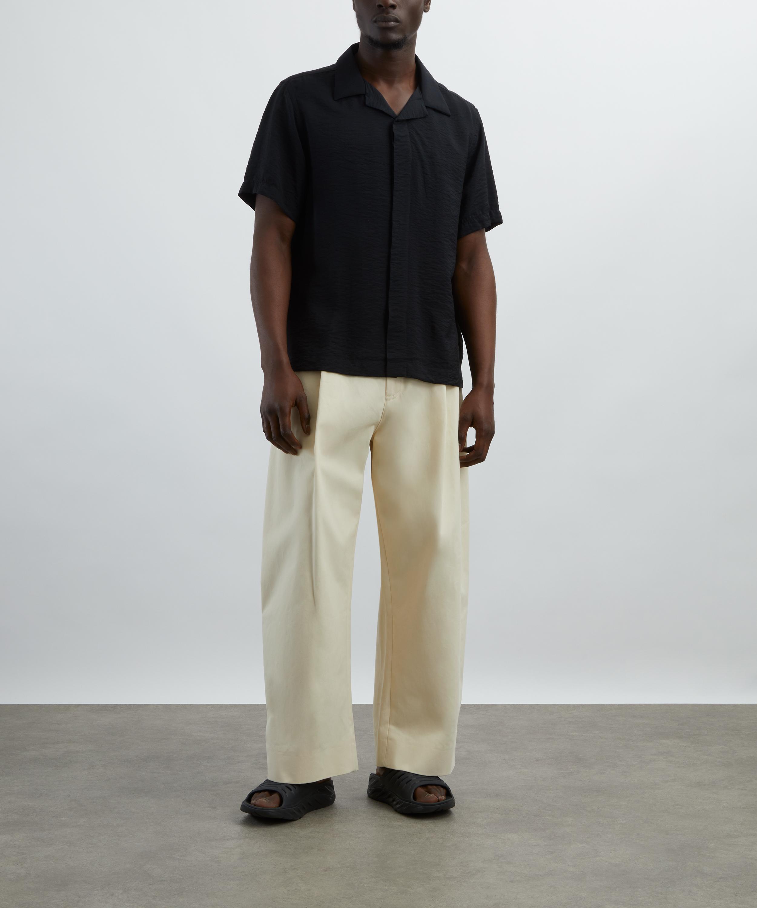 Crafted from pebble-textured twill fabric, this black shirt blends tailored structure with casual ease. Designed with an open collar and short sleeves, it’s a refined layering piece for effortless everyday style.